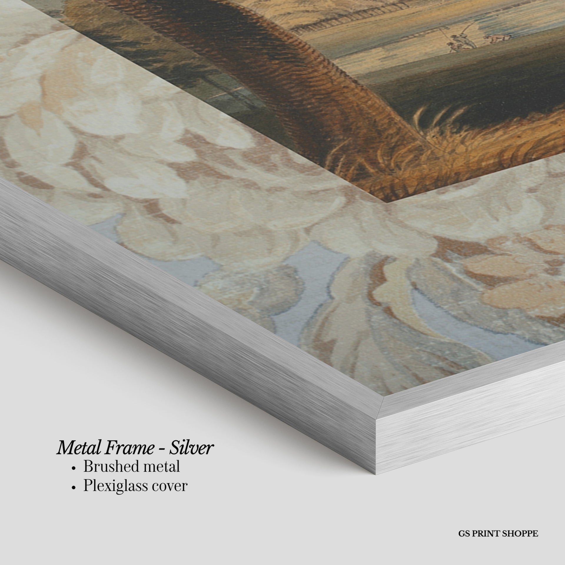 Metal Frame: Sleek and modern, our metal frame is crafted with brushed metal for a polished finish. It comes with durable plexiglass and sturdy metal hangers for horizontal or vertical display.