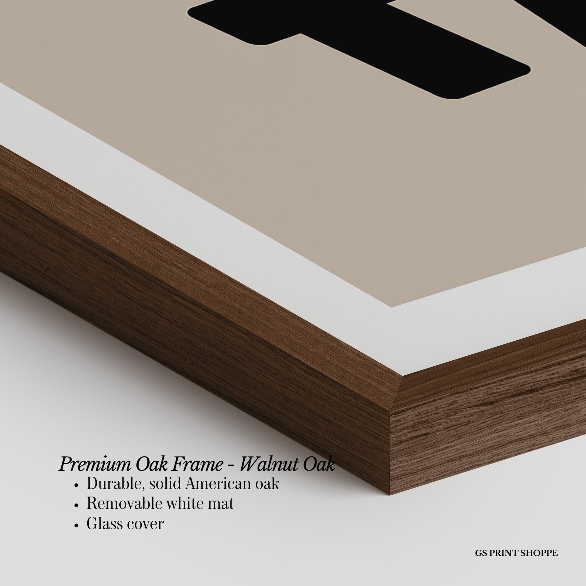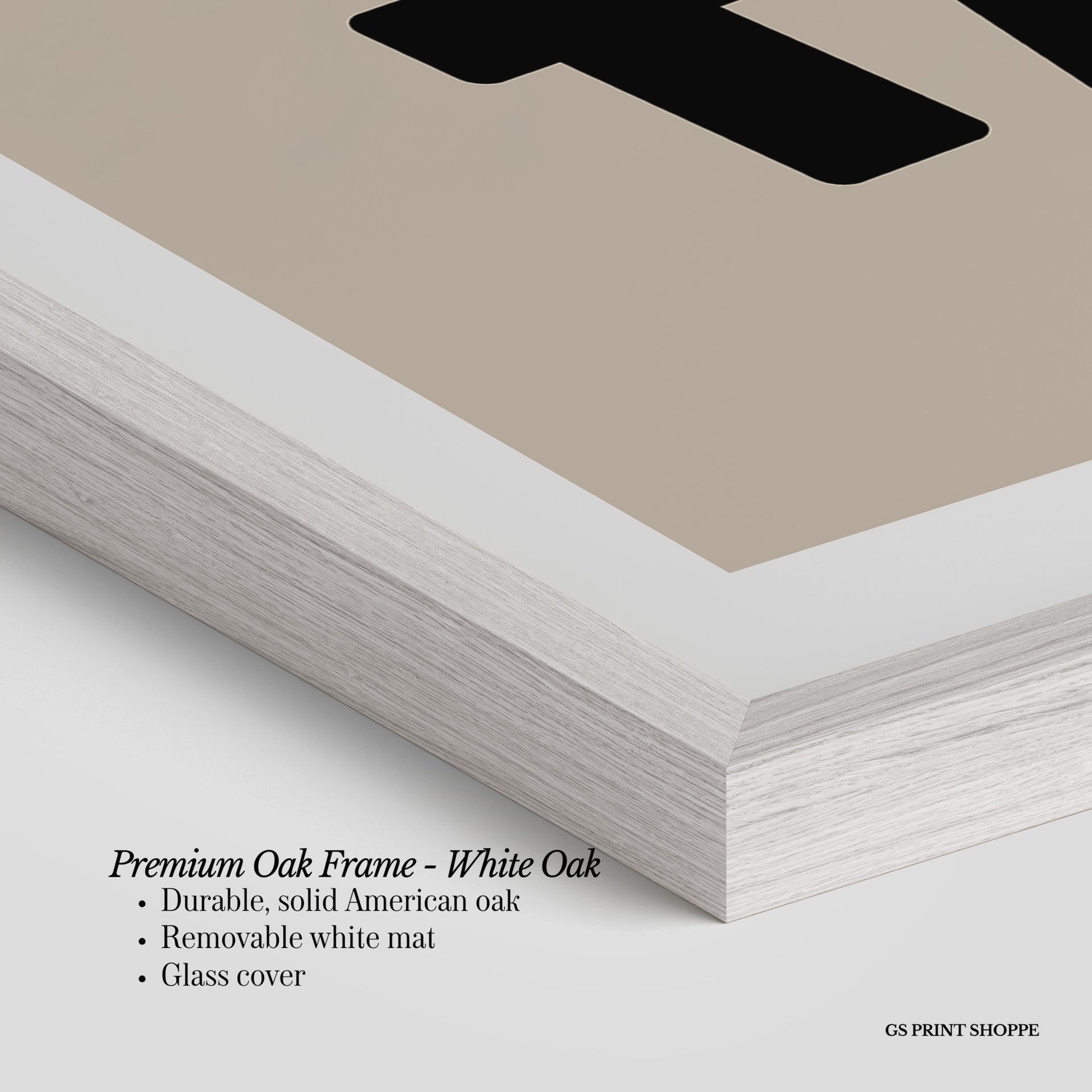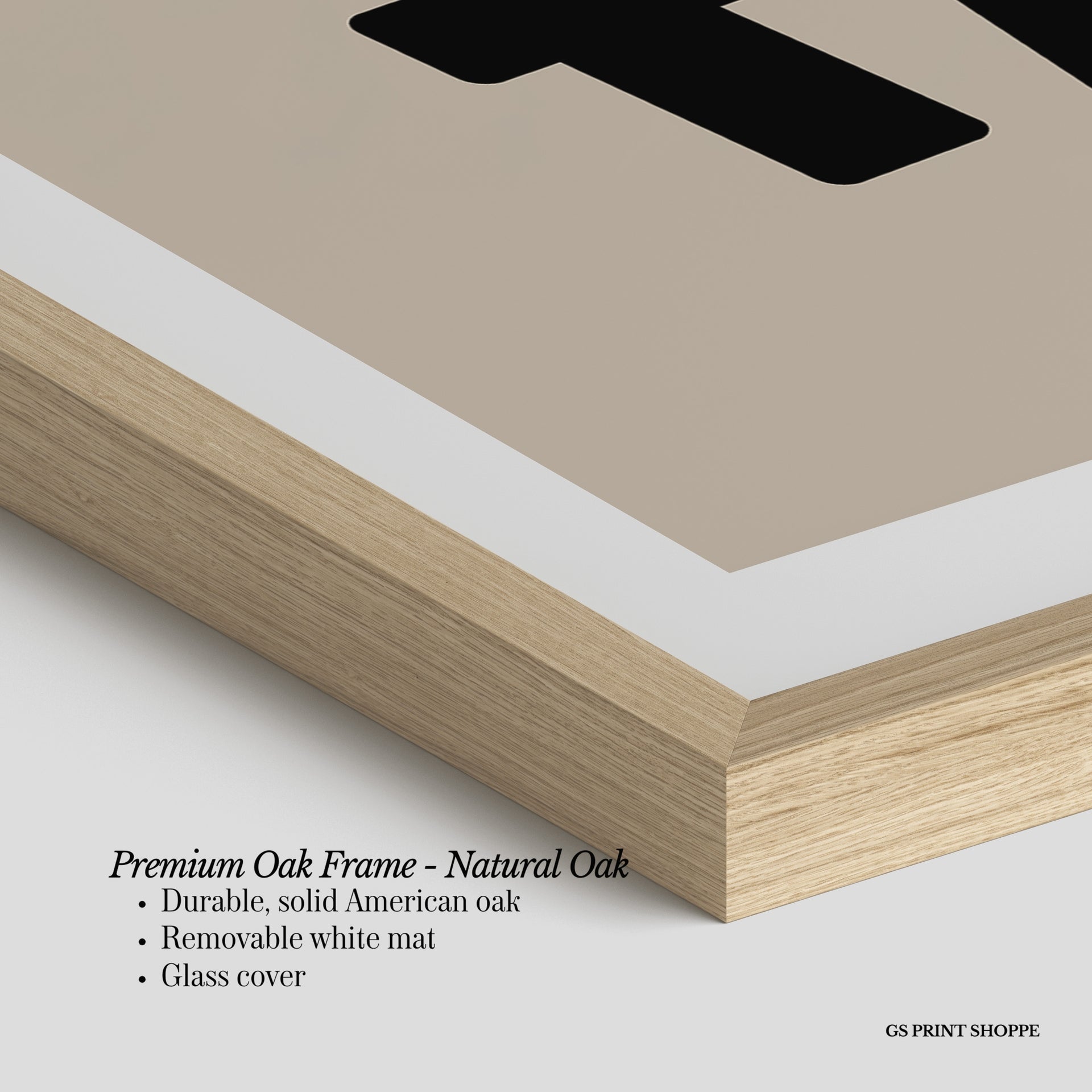 Premium Oak Frame: Our premium oak frame is crafted from solid American oak, offering a warm, natural feel with a high-end finish. We complete this elevated offering with a bright white removable mat and real glass for a versatile and polished look.