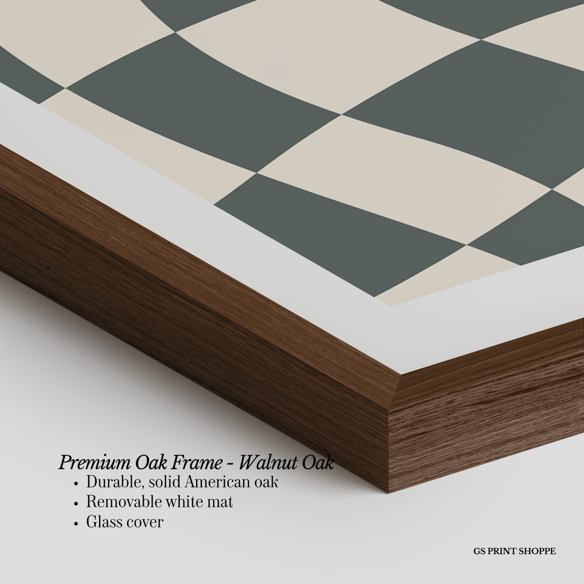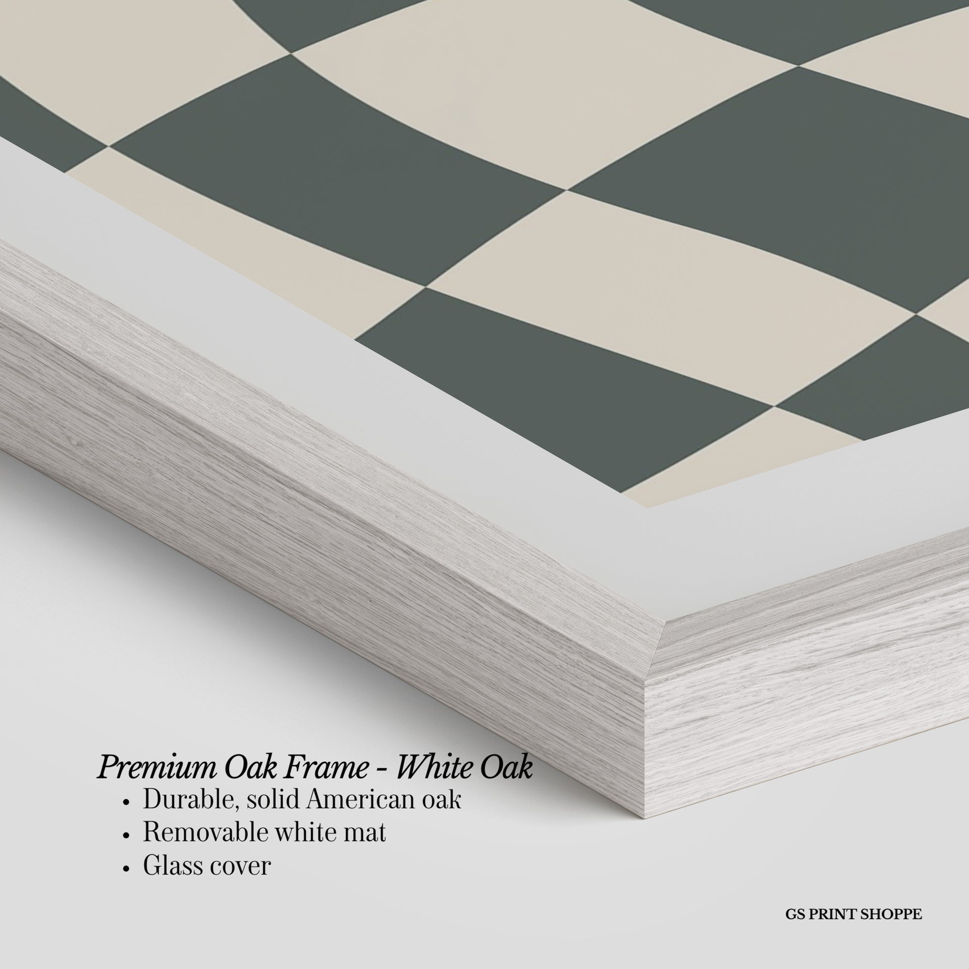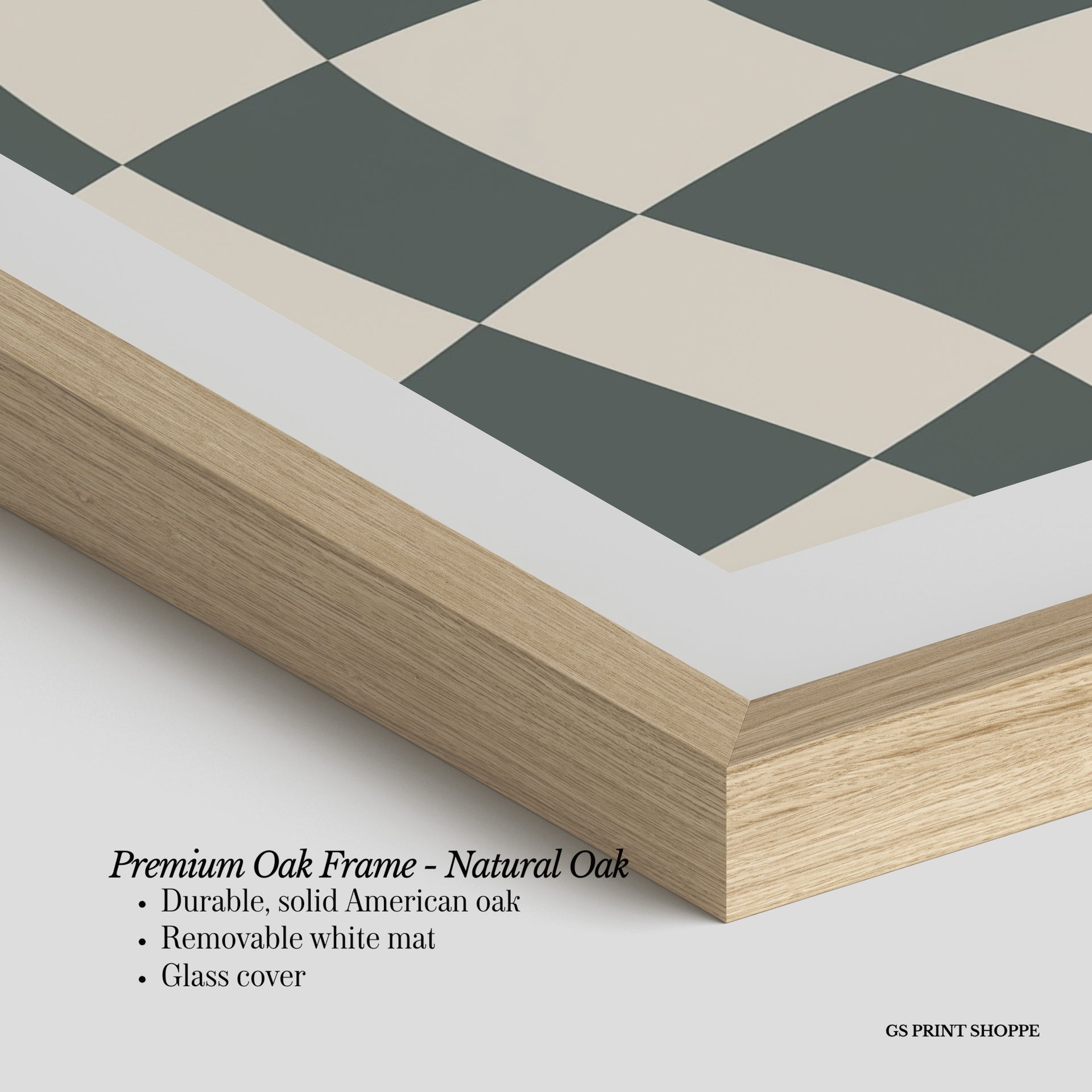 Premium Oak Frame: Our premium oak frame is crafted from solid American oak, offering a warm, natural feel with a high-end finish. We complete this elevated offering with a bright white removable mat and real glass for a versatile and polished look.