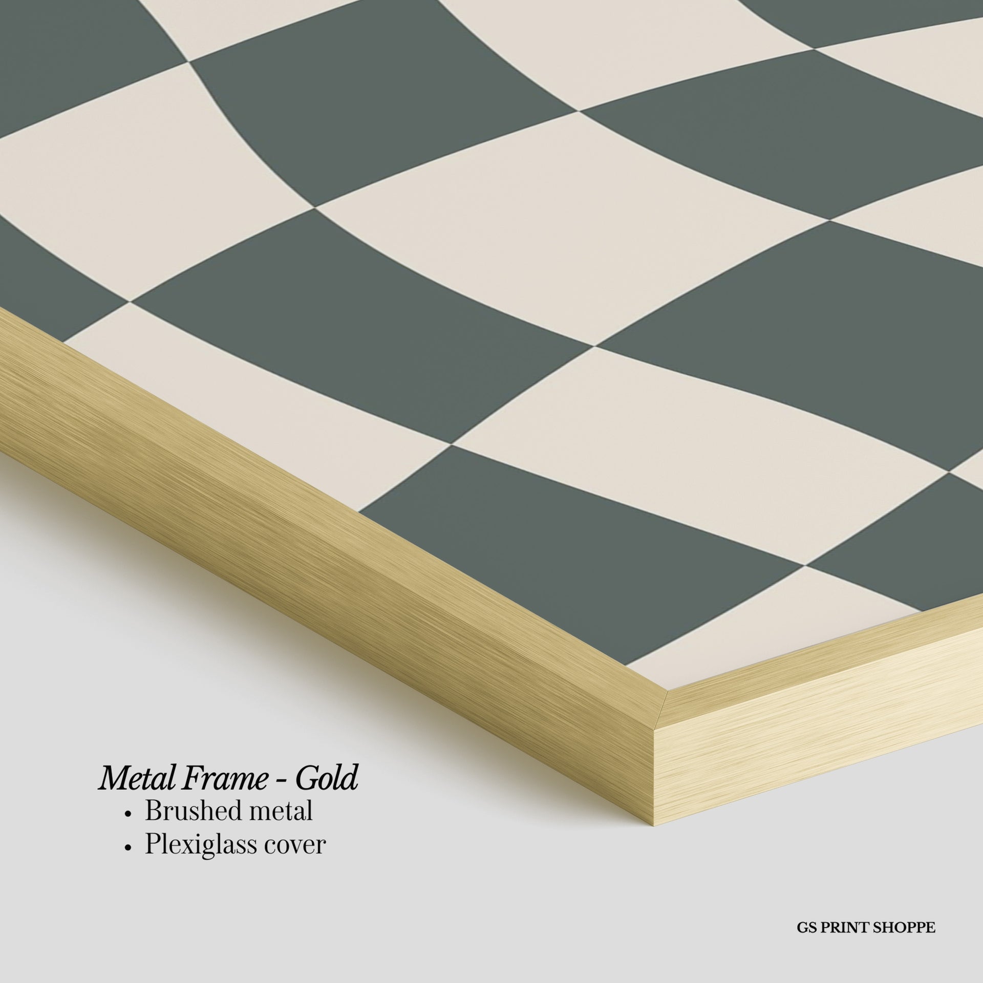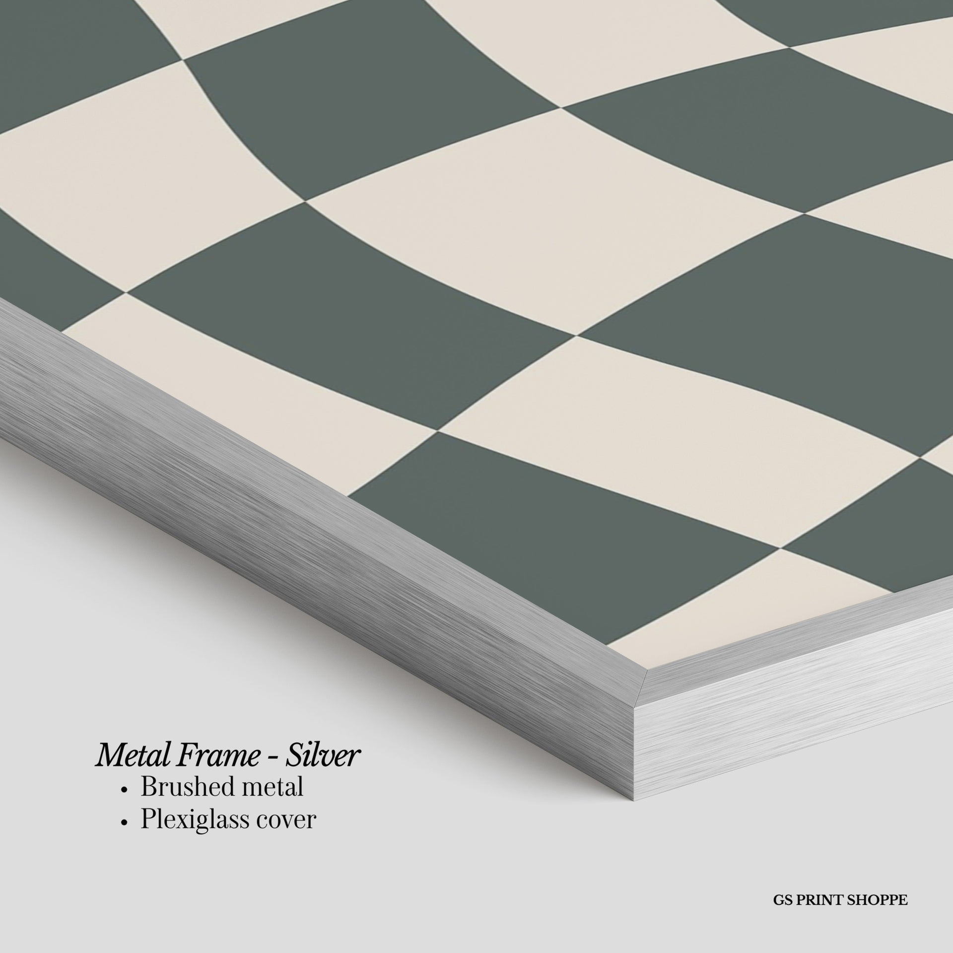Metal Frame: Sleek and modern, our metal frame is crafted with brushed metal for a polished finish. It comes with durable plexiglass and sturdy metal hangers for horizontal or vertical display.