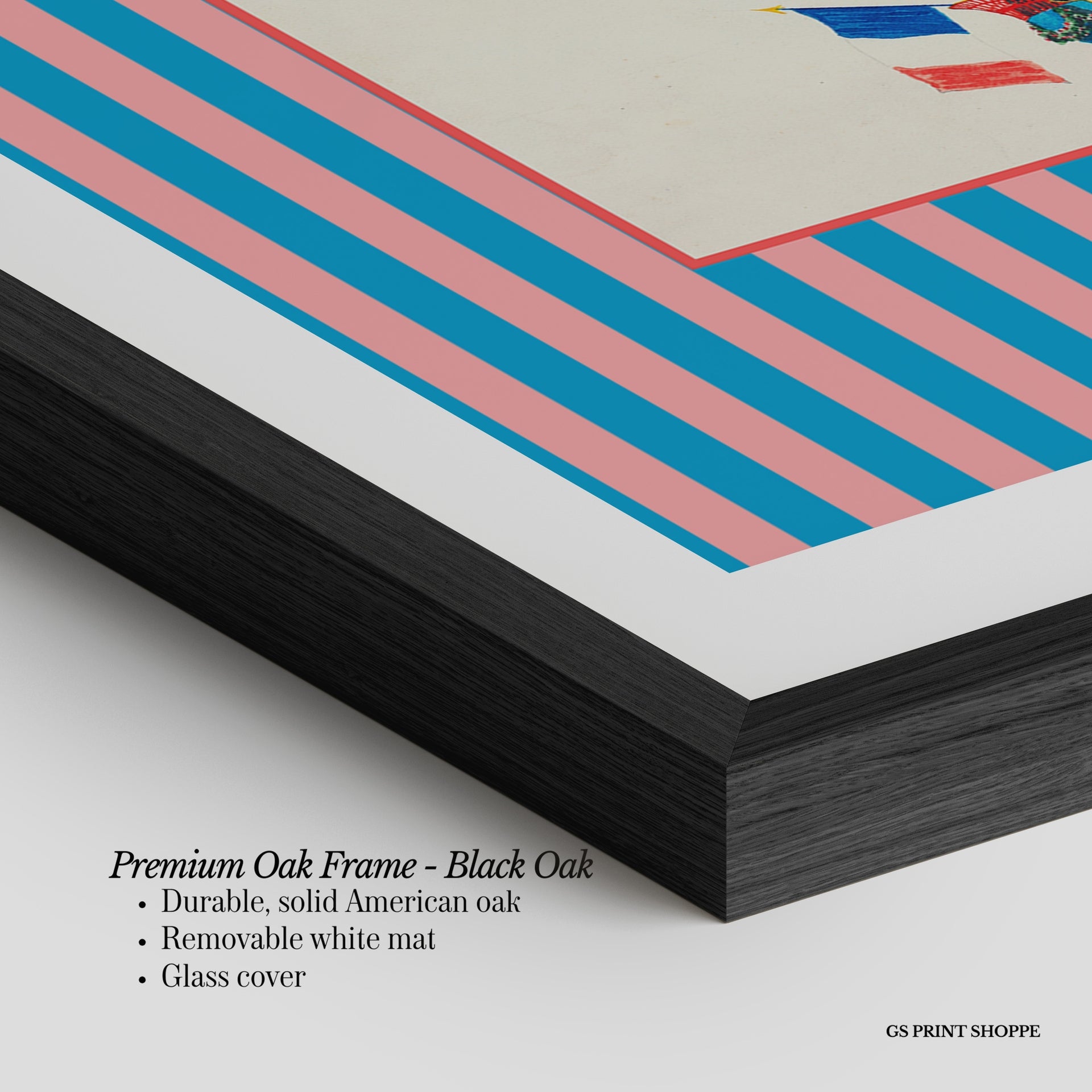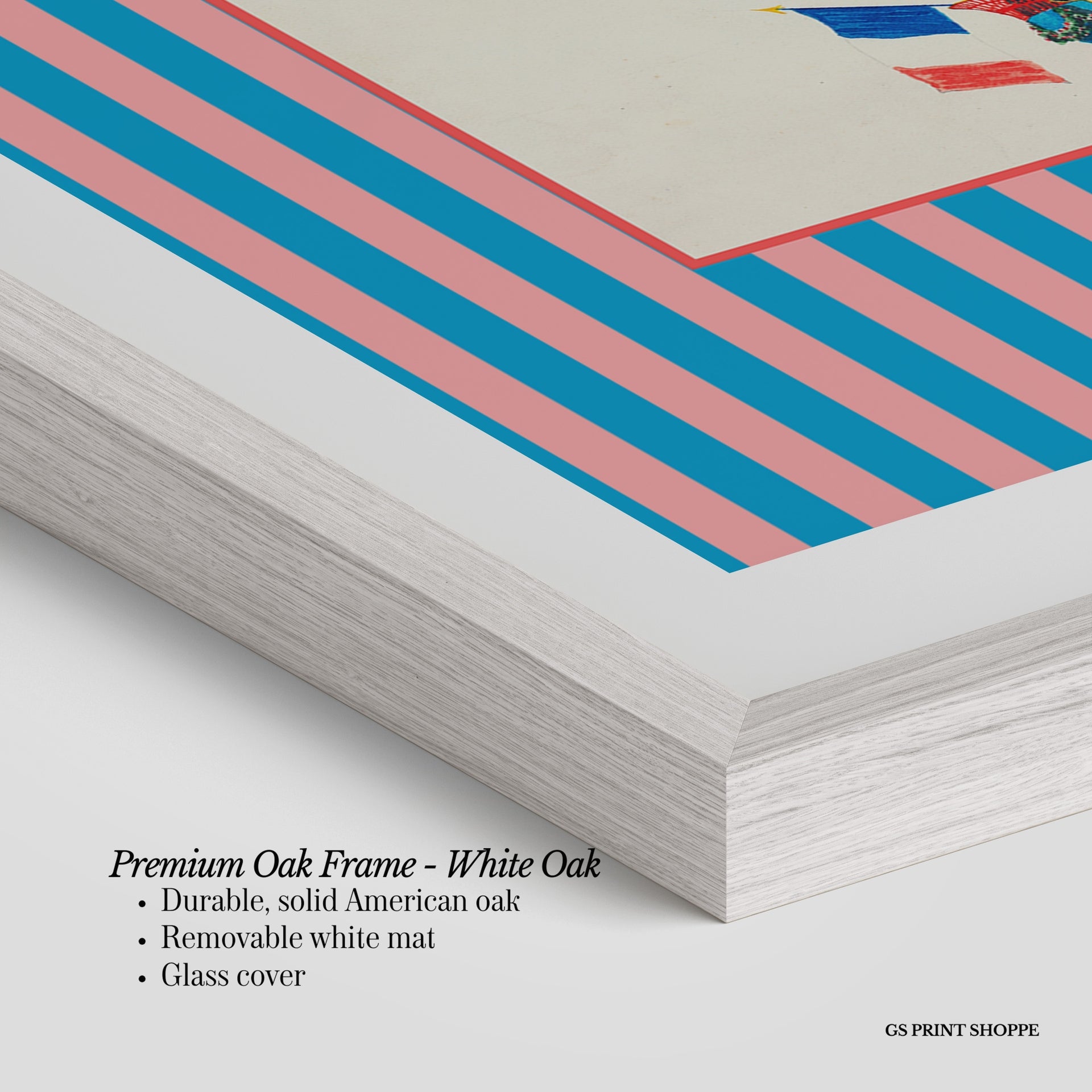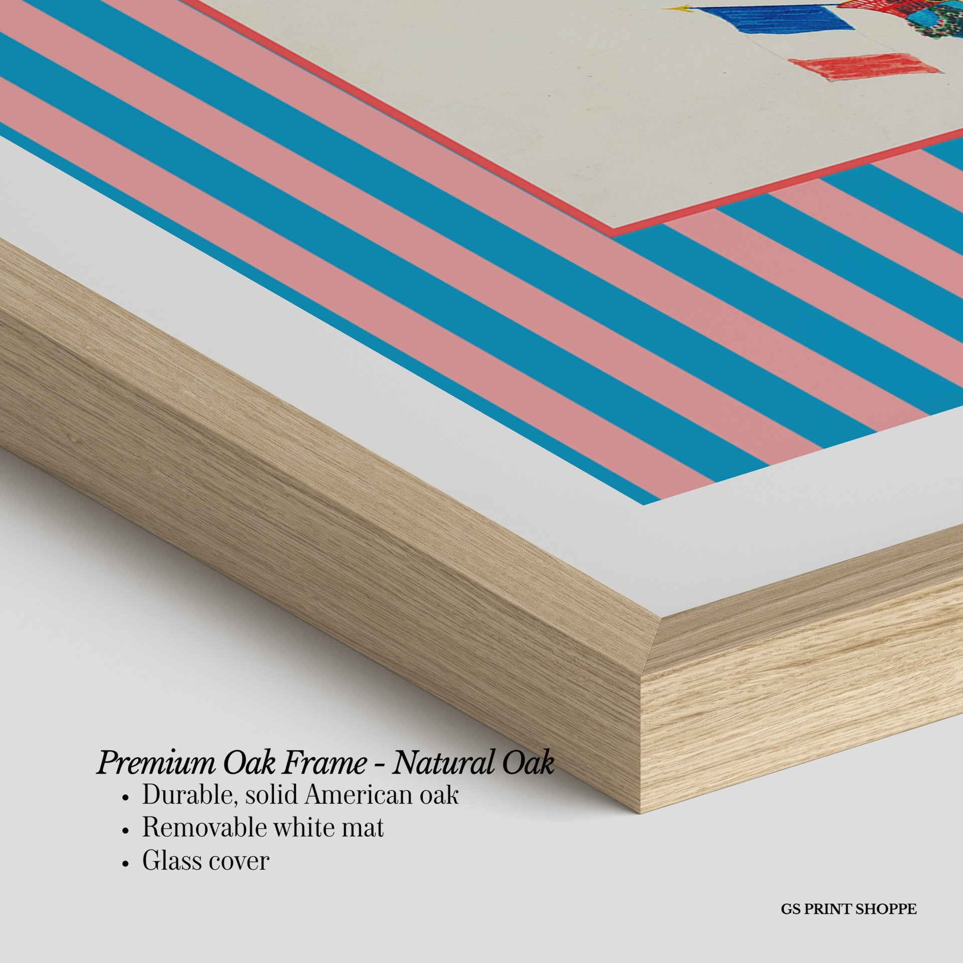 Premium Oak Frame: Our premium oak frame is crafted from solid American oak, offering a warm, natural feel with a high-end finish. We complete this elevated offering with a bright white removable mat and real glass for a versatile and polished look.