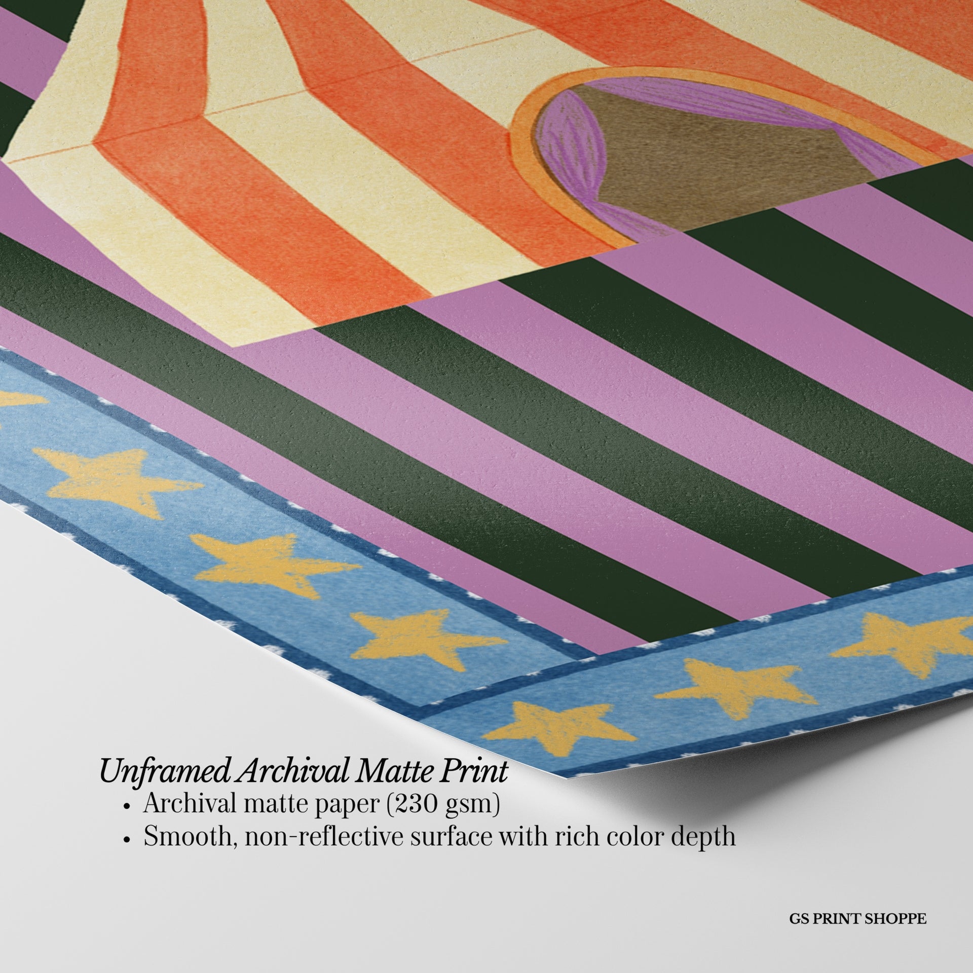 Unframed: This print is professionally printed on archival matte paper (230 gsm), a smooth, acid-free paper with a non-reflective finish. It will be carefully packaged to arrive safely at your door.