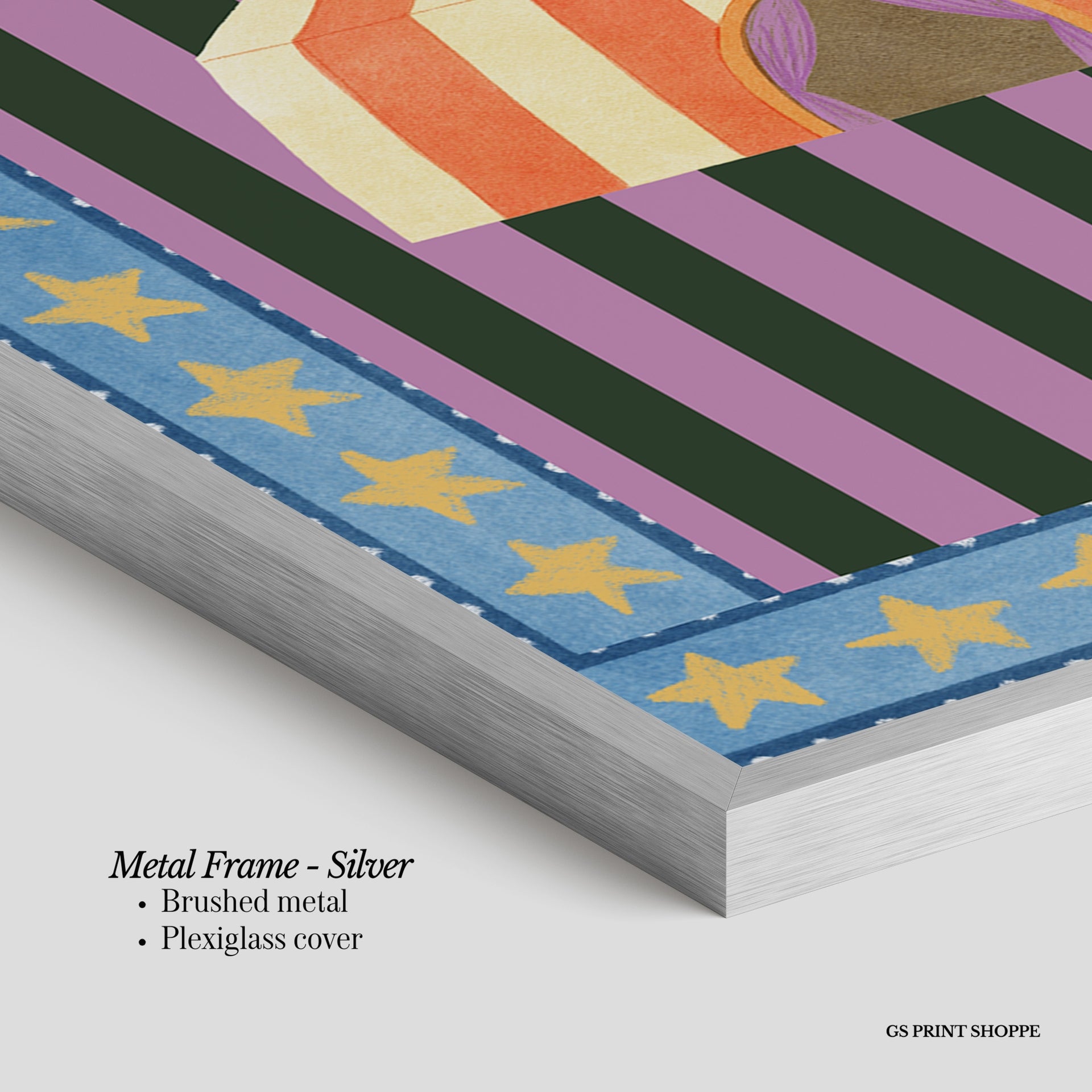 Metal Frame: Sleek and modern, our metal frame is crafted with brushed metal for a polished finish. It comes with durable plexiglass and sturdy metal hangers for horizontal or vertical display.