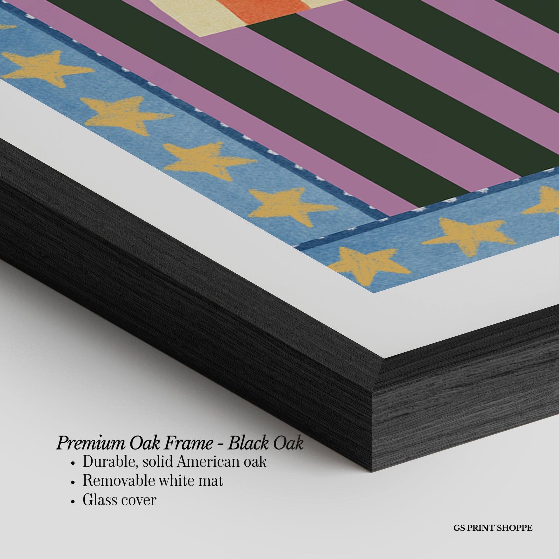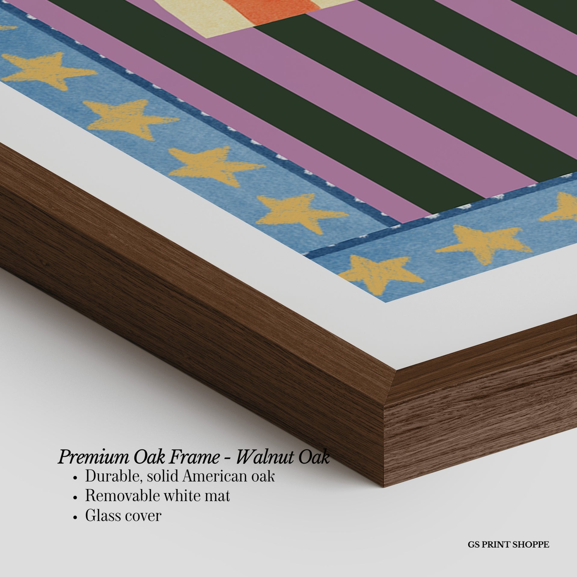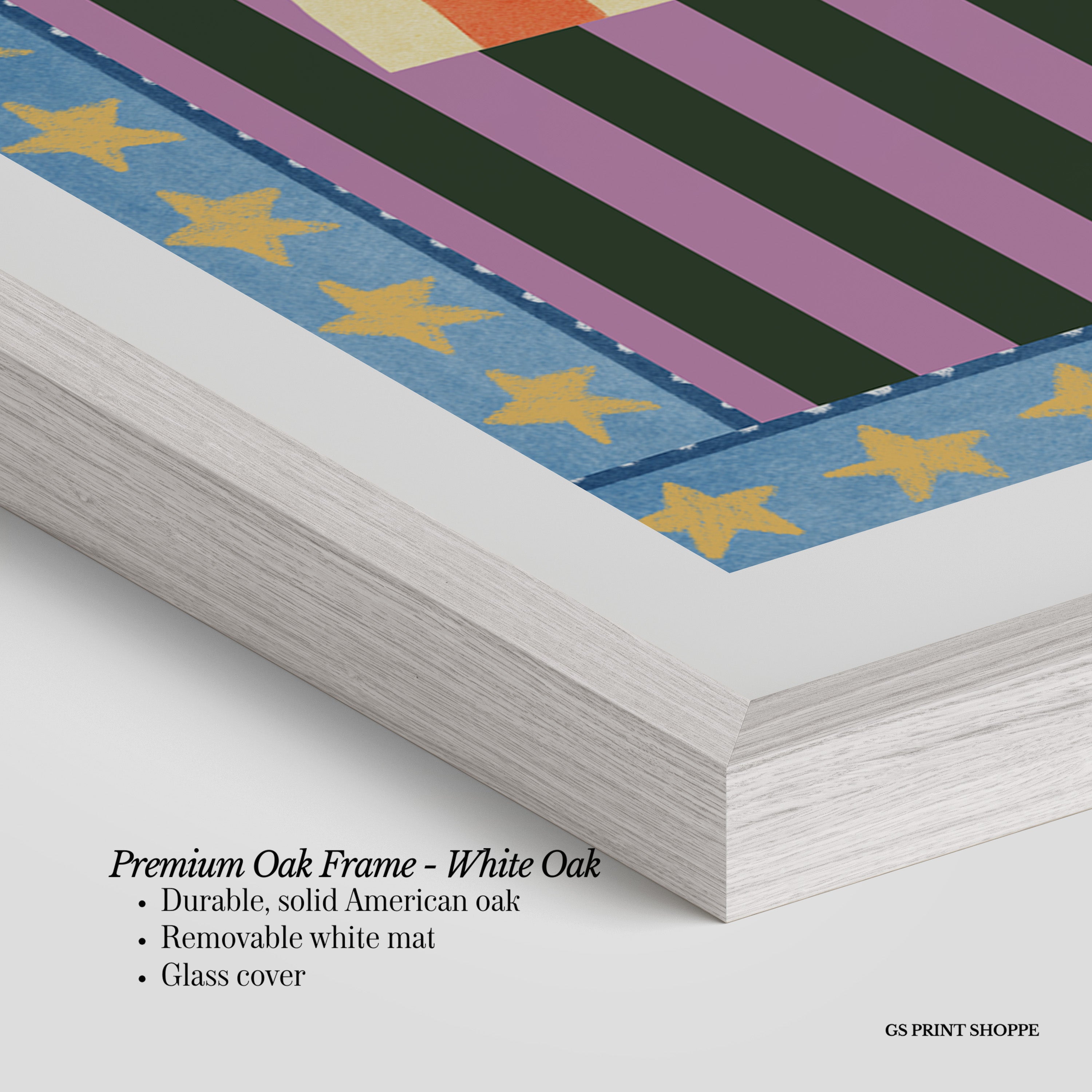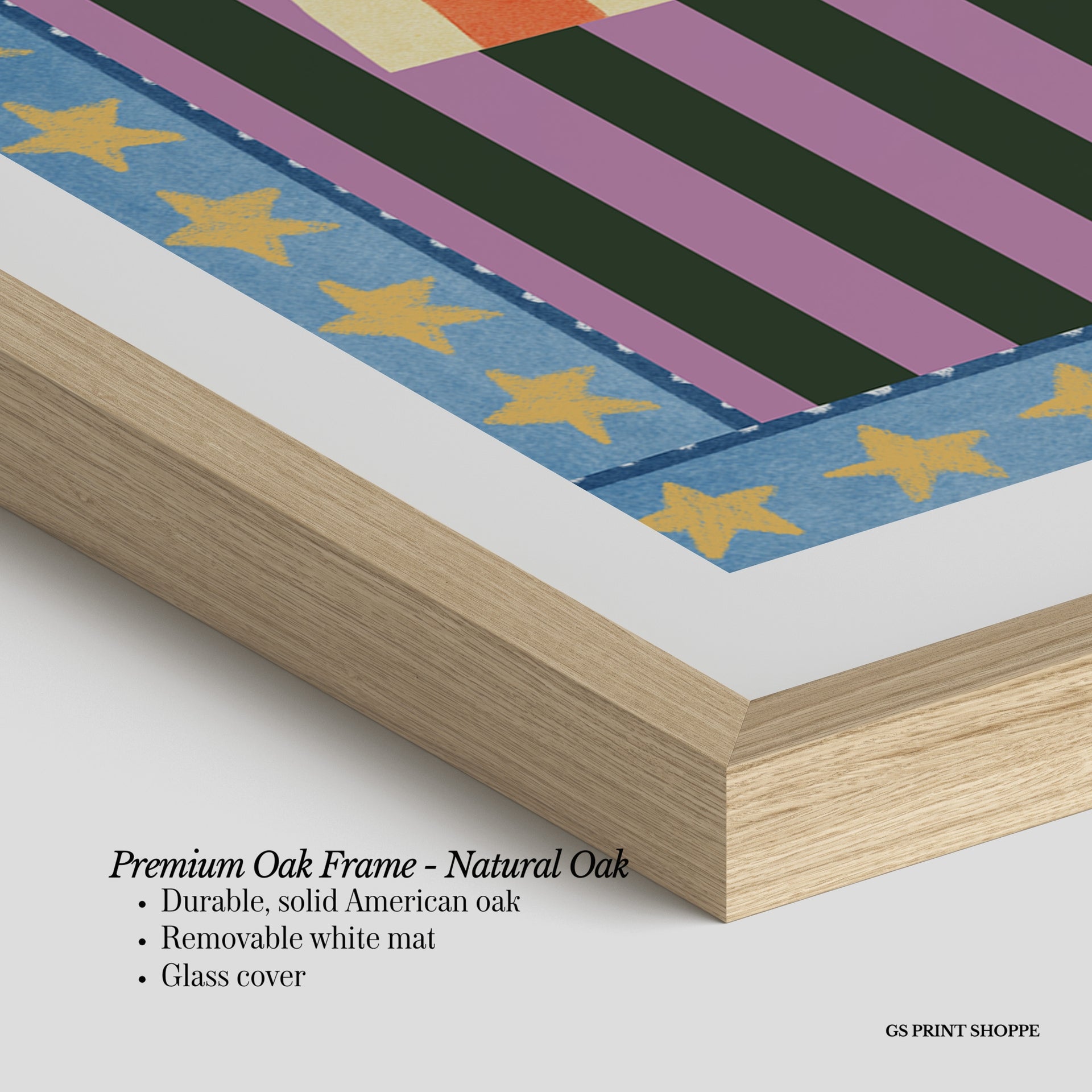 Premium Oak Frame: Our premium oak frame is crafted from solid American oak, offering a warm, natural feel with a high-end finish. We complete this elevated offering with a bright white removable mat and real glass for a versatile and polished look.
