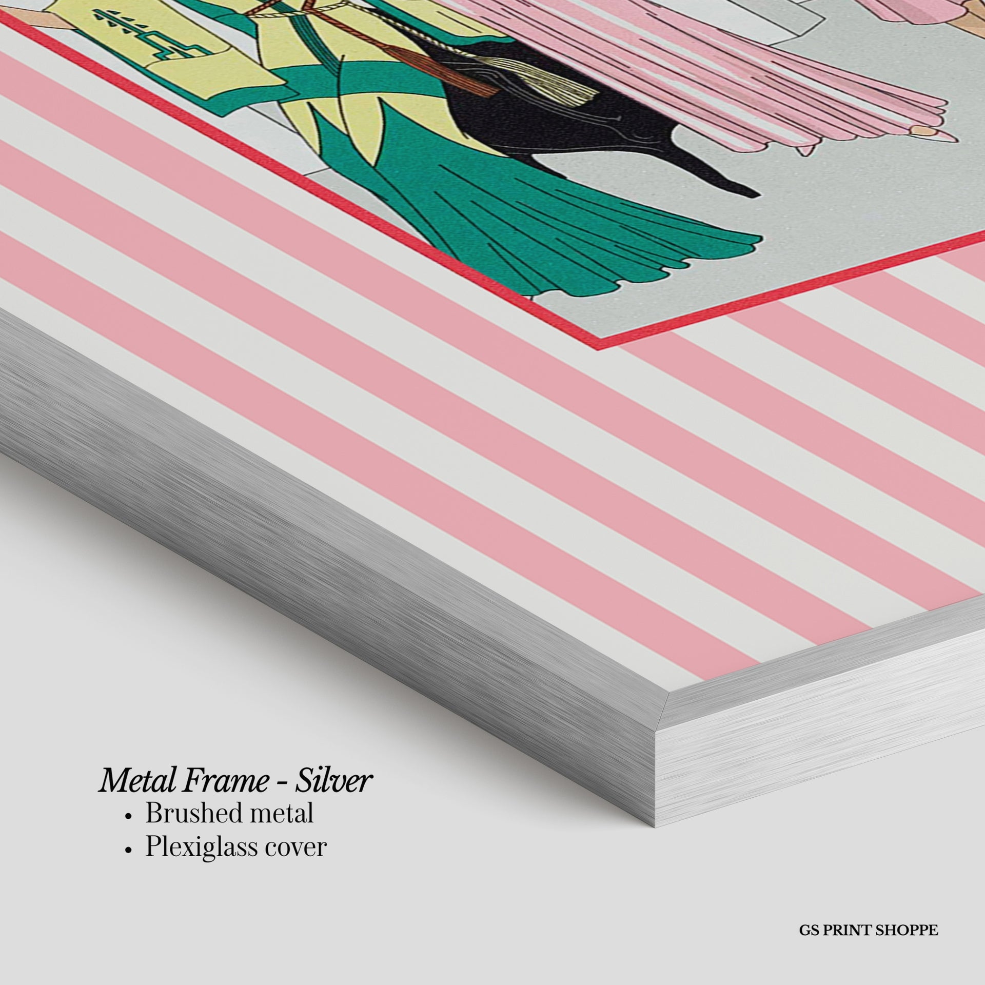 Metal Frame: Sleek and modern, our metal frame is crafted with brushed metal for a polished finish. It comes with durable plexiglass and sturdy metal hangers for horizontal or vertical display.