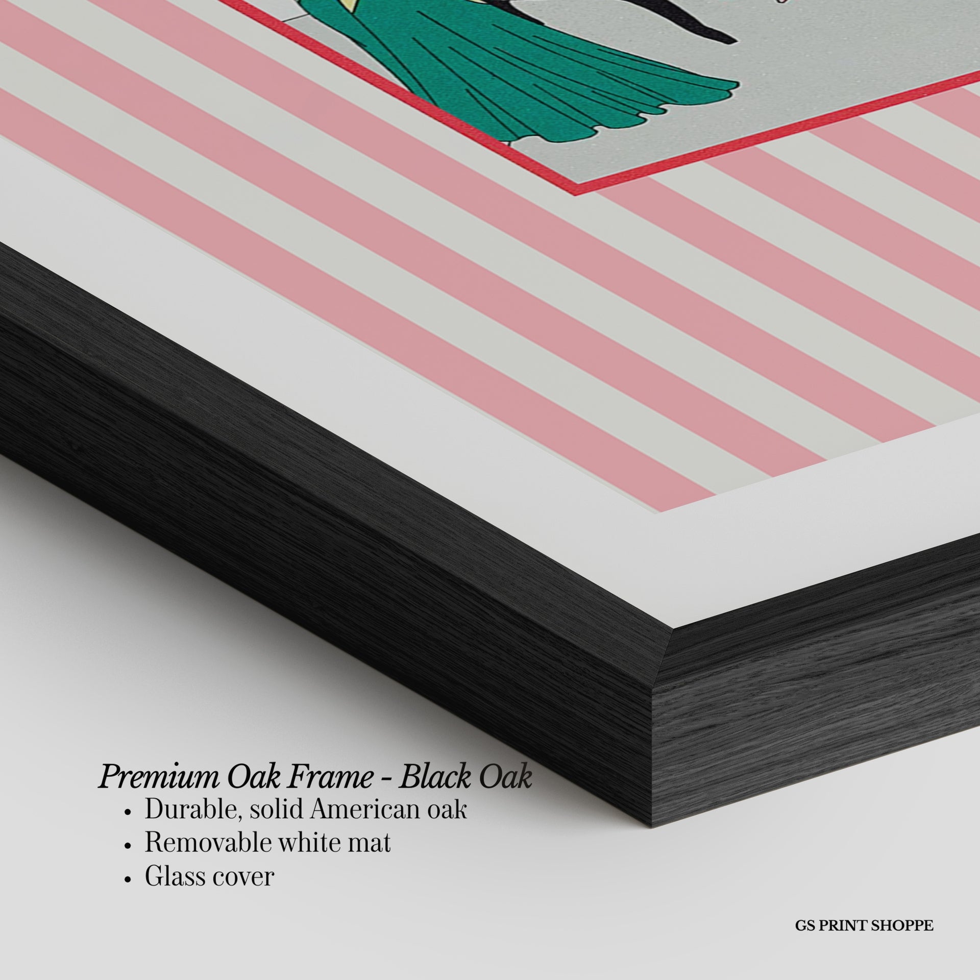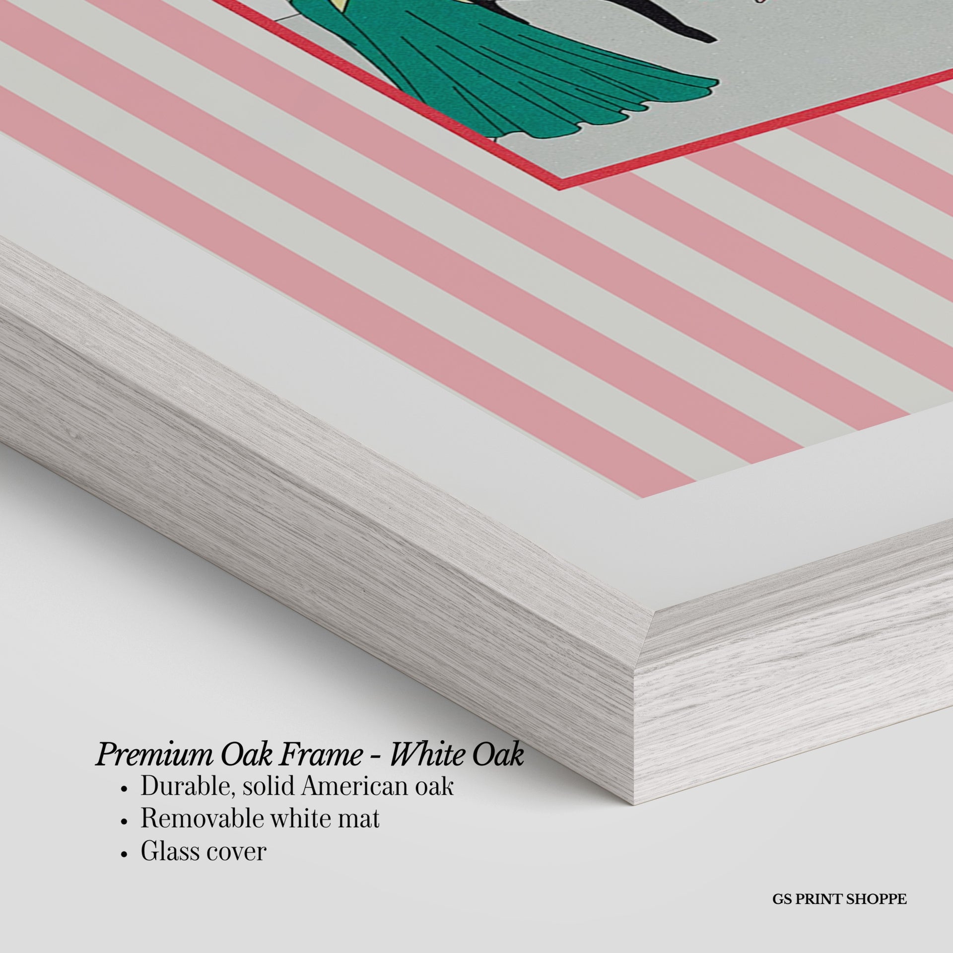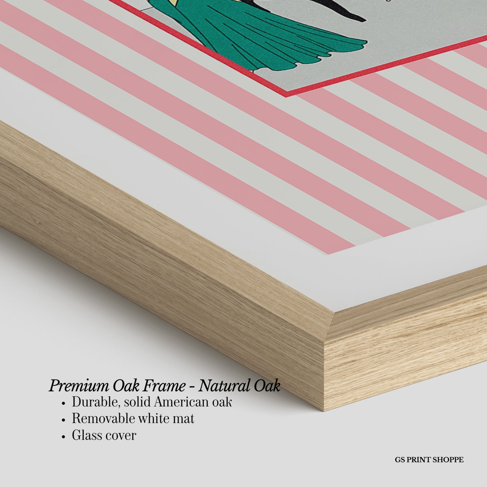 Premium Oak Frame: Our premium oak frame is crafted from solid American oak, offering a warm, natural feel with a high-end finish. We complete this elevated offering with a bright white removable mat and real glass for a versatile and polished look.