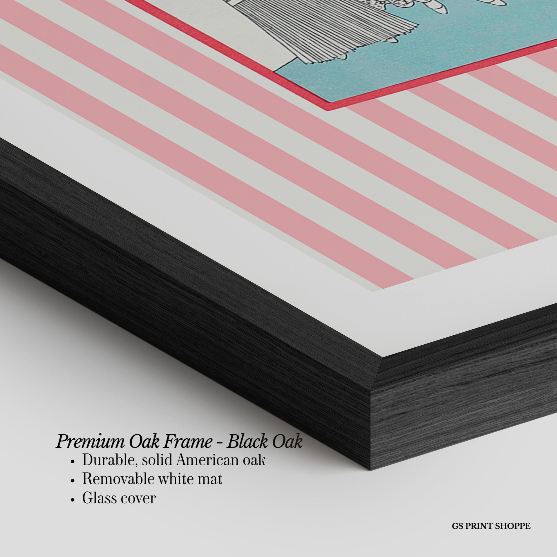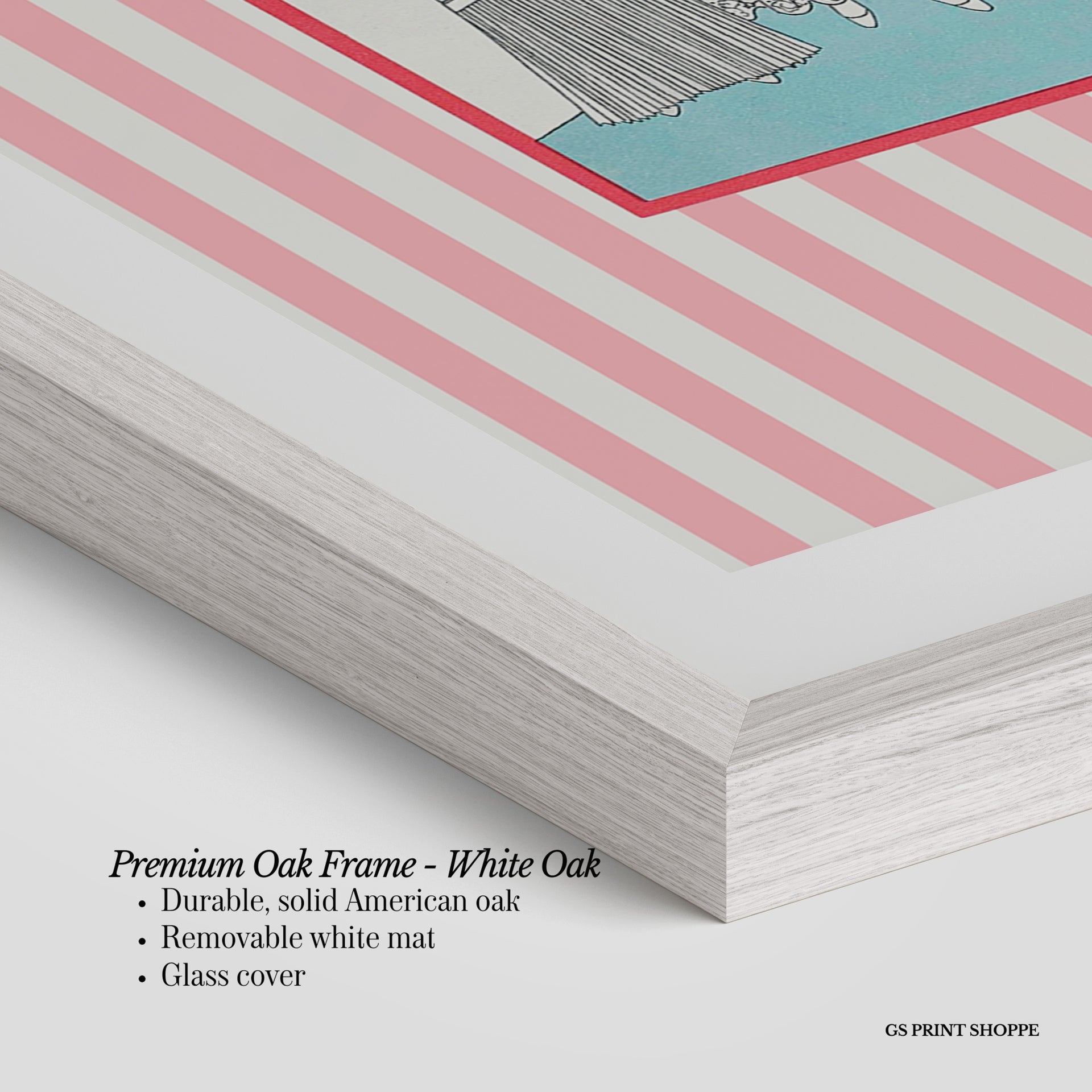 Premium Oak Frame: Our premium oak frame is crafted from solid American oak, offering a warm, natural feel with a high-end finish. We complete this elevated offering with a bright white removable mat and real glass for a versatile and polished look.