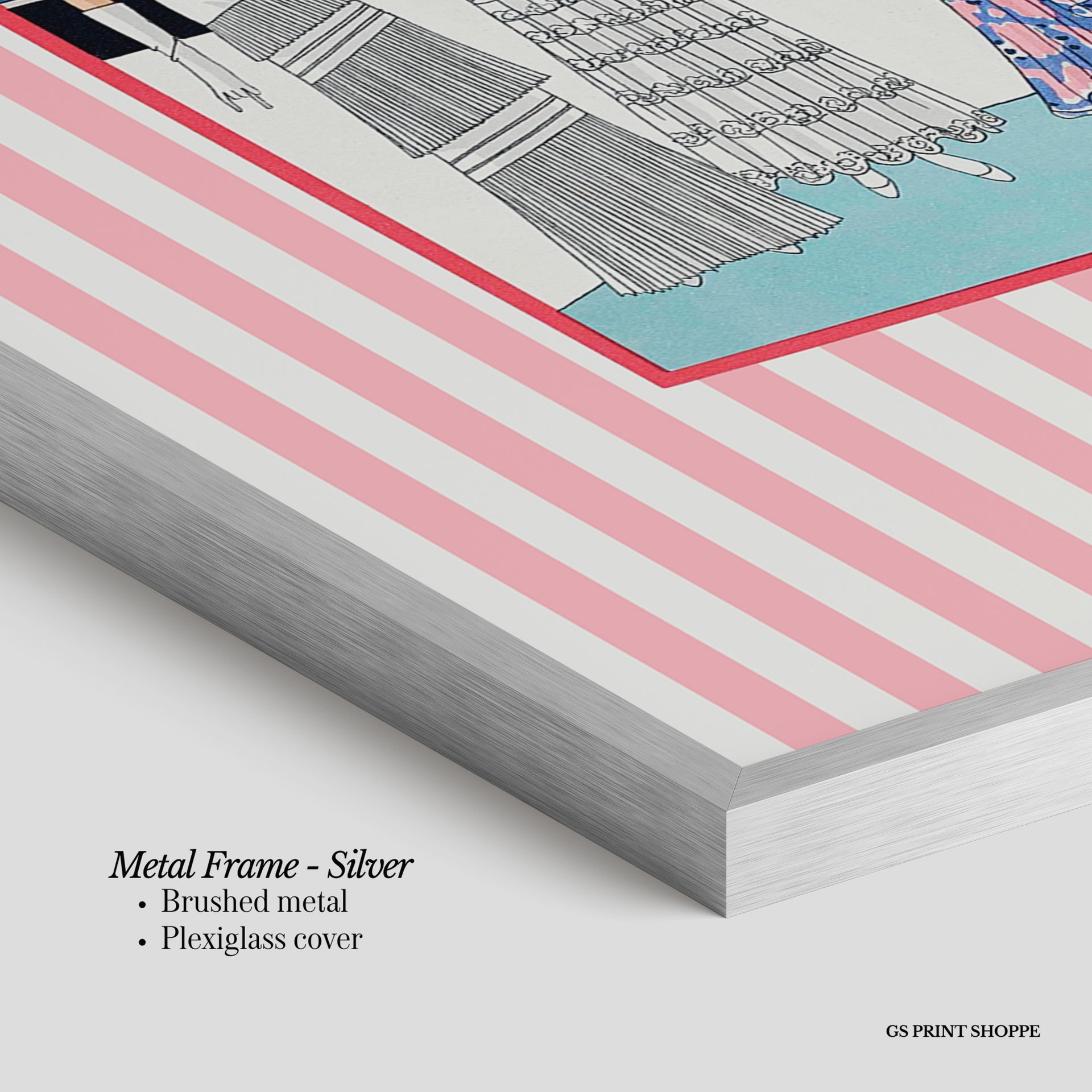 Metal Frame: Sleek and modern, our metal frame is crafted with brushed metal for a polished finish. It comes with durable plexiglass and sturdy metal hangers for horizontal or vertical display.