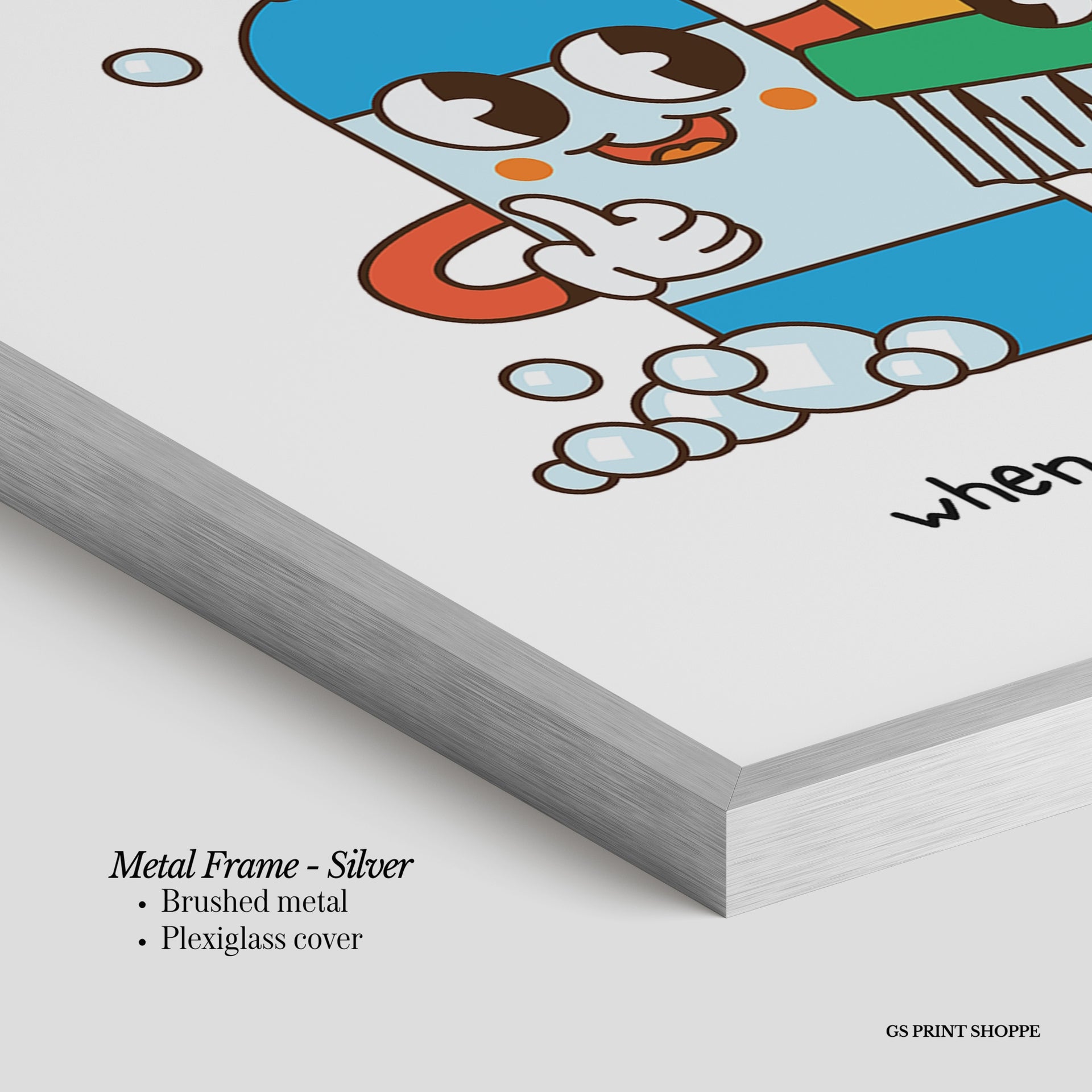Metal Frame: Sleek and modern, our metal frame is crafted with brushed metal for a polished finish. It comes with durable plexiglass and sturdy metal hangers for horizontal or vertical display.