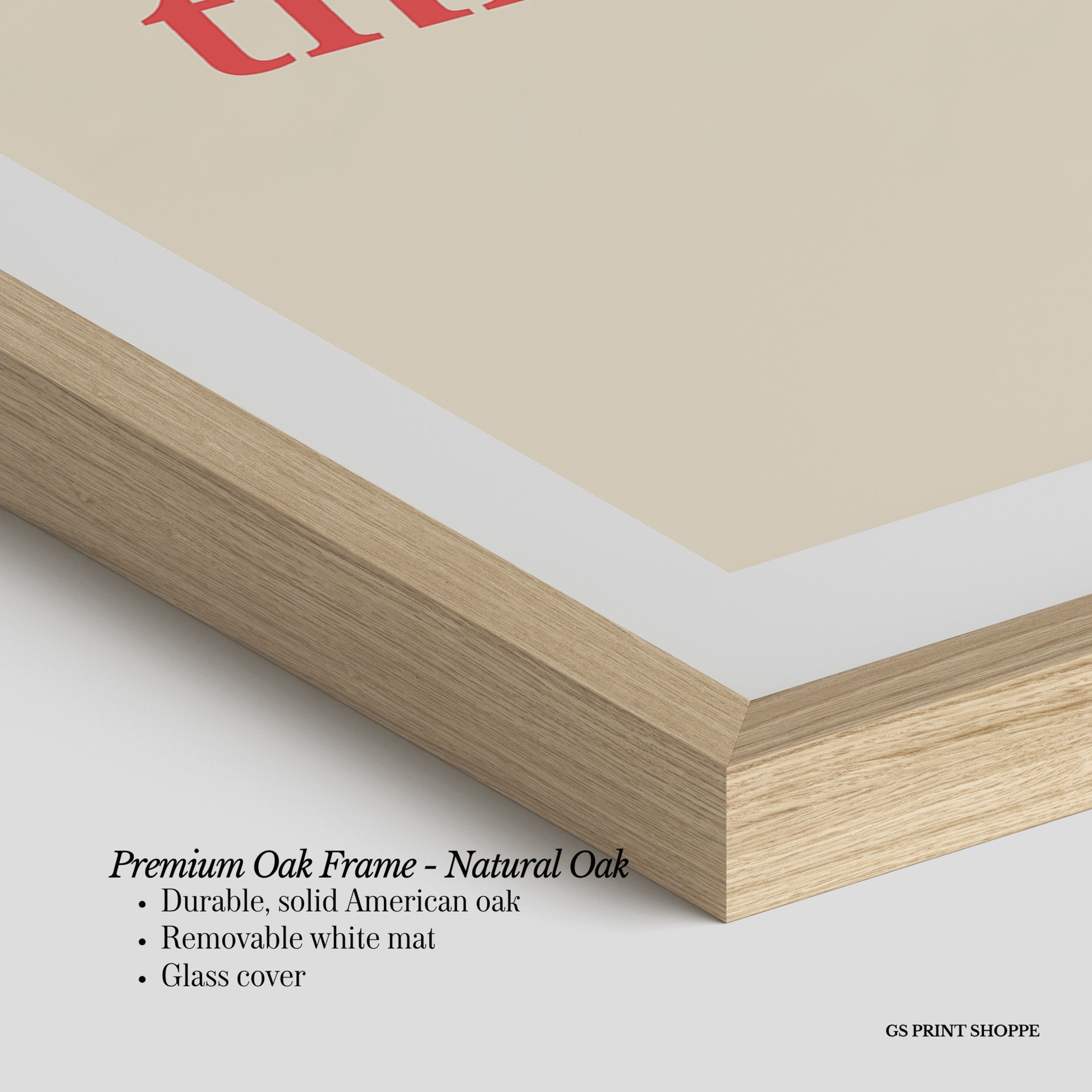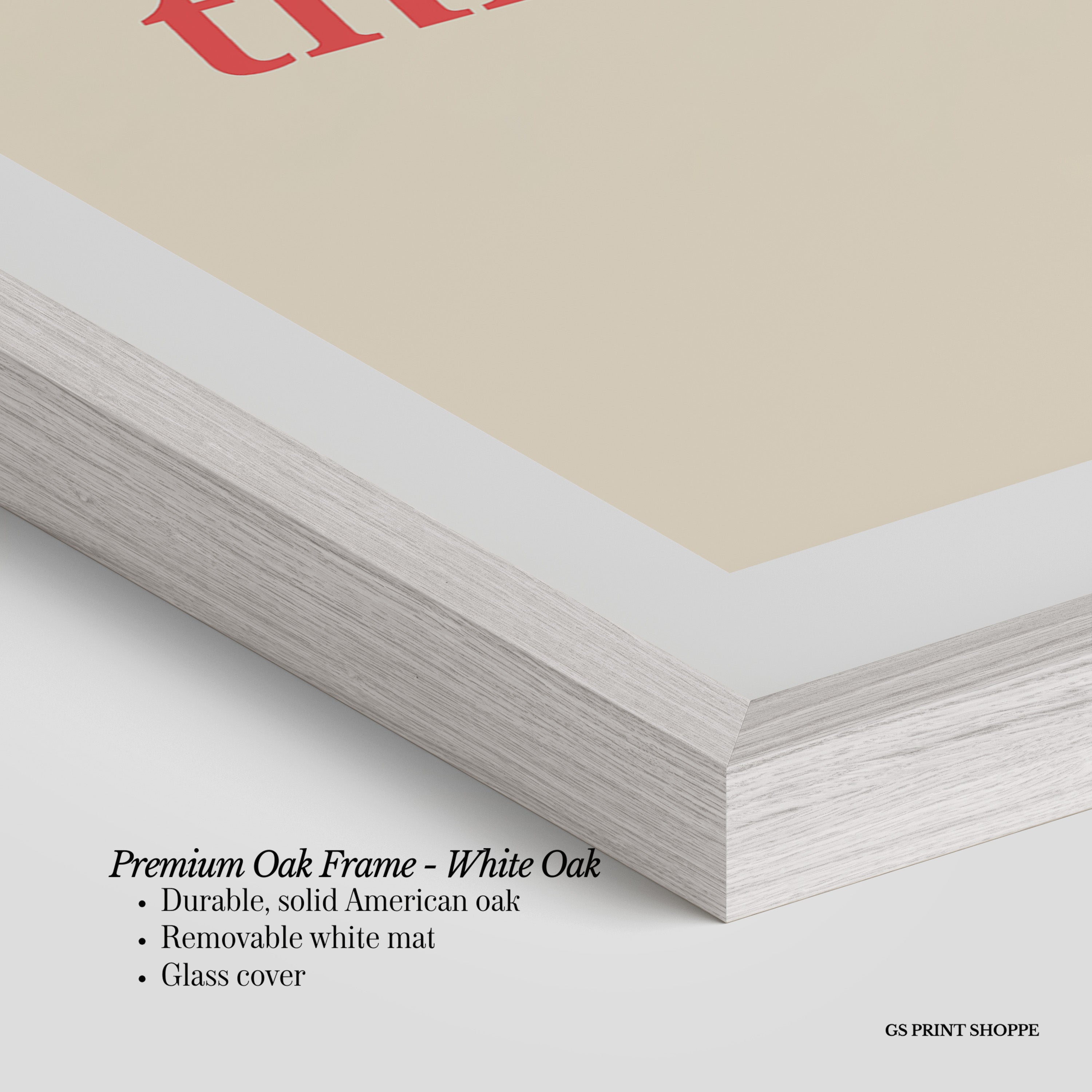 Premium Oak Frame: Our premium oak frame is crafted from solid American oak, offering a warm, natural feel with a high-end finish. We complete this elevated offering with a bright white removable mat and real glass for a versatile and polished look.