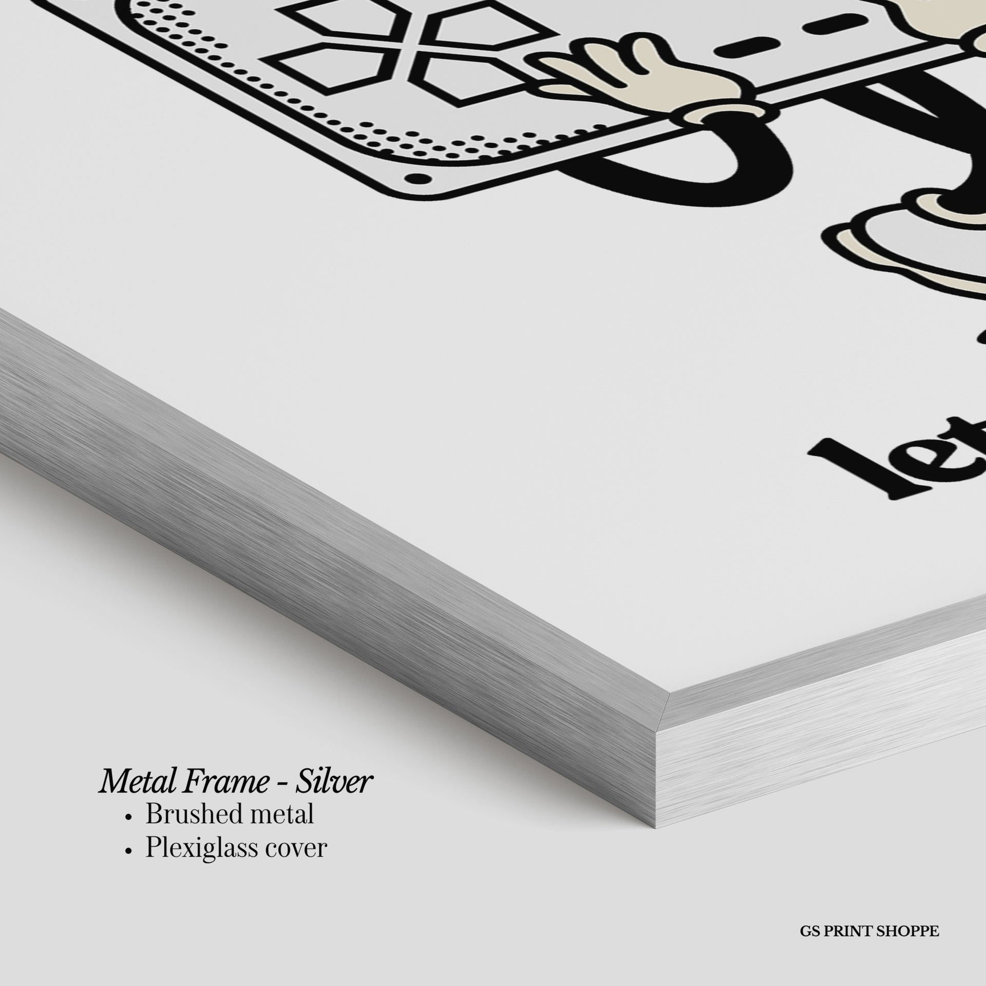 Metal Frame: Sleek and modern, our metal frame is crafted with brushed metal for a polished finish. It comes with durable plexiglass and sturdy metal hangers for horizontal or vertical display.