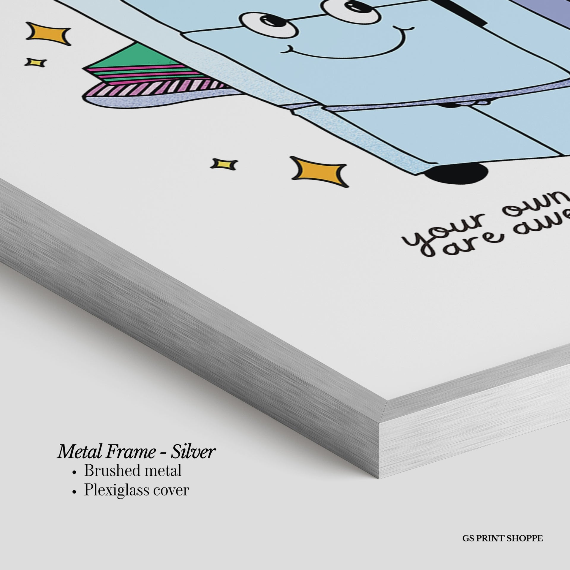 Metal Frame: Sleek and modern, our metal frame is crafted with brushed metal for a polished finish. It comes with durable plexiglass and sturdy metal hangers for horizontal or vertical display.