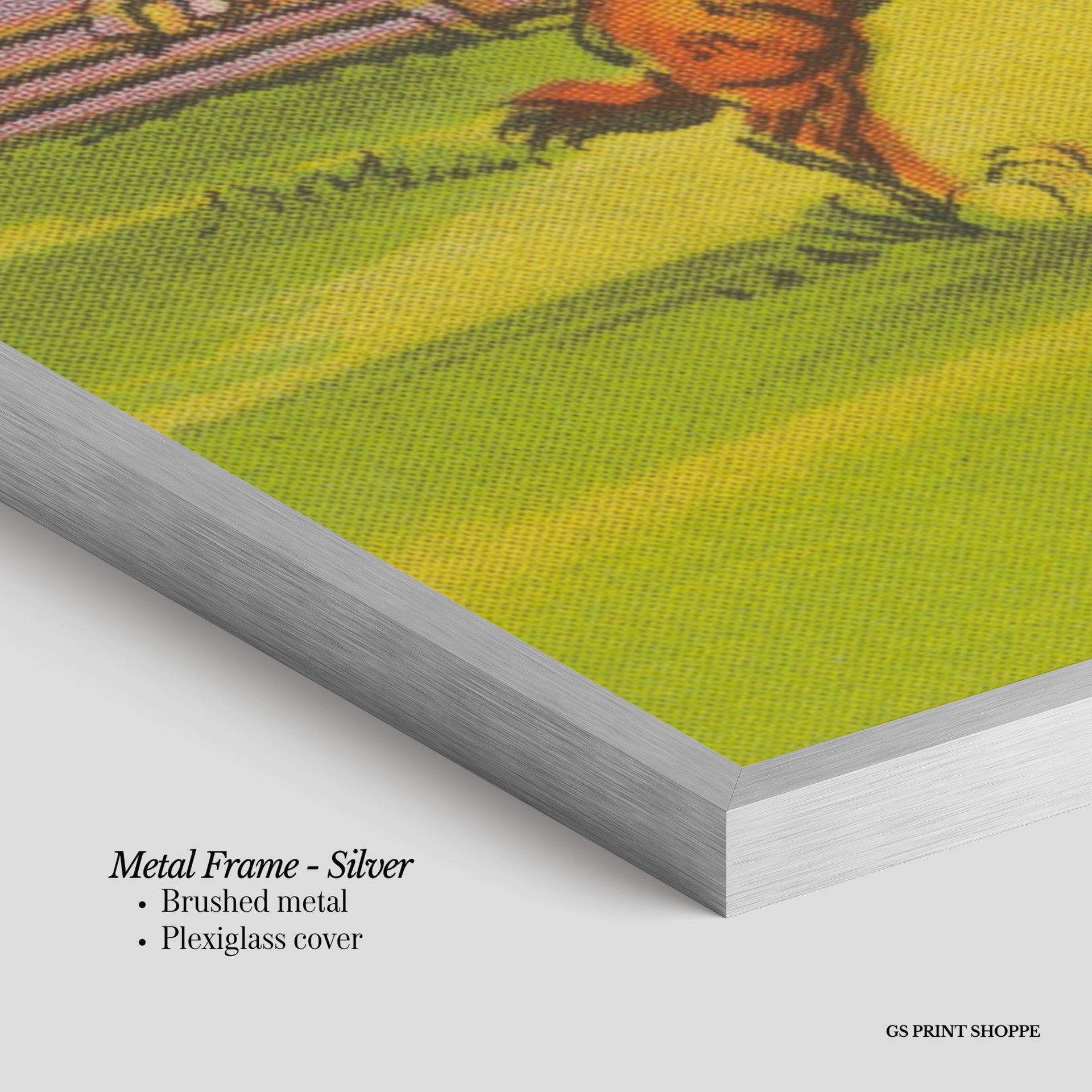 Metal Frame: Sleek and modern, our metal frame is crafted with brushed metal for a polished finish. It comes with durable plexiglass and sturdy metal hangers for horizontal or vertical display.