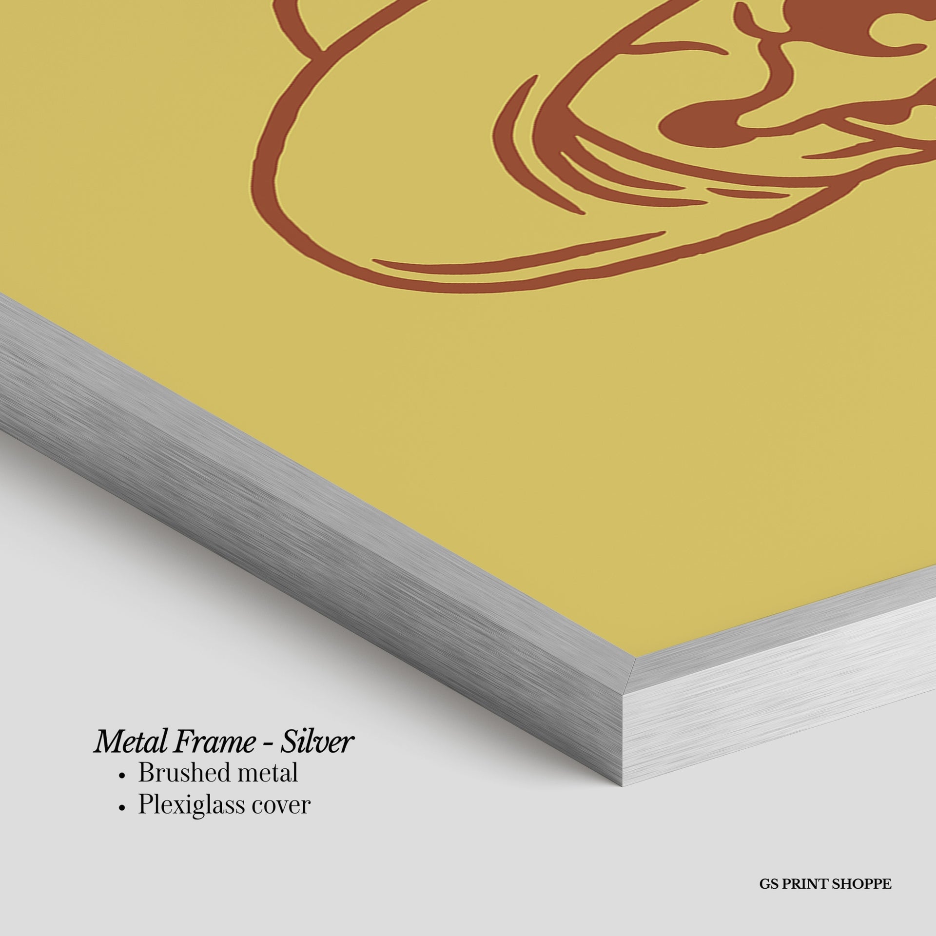 Metal Frame: Sleek and modern, our metal frame is crafted with brushed metal for a polished finish. It comes with durable plexiglass and sturdy metal hangers for horizontal or vertical display.