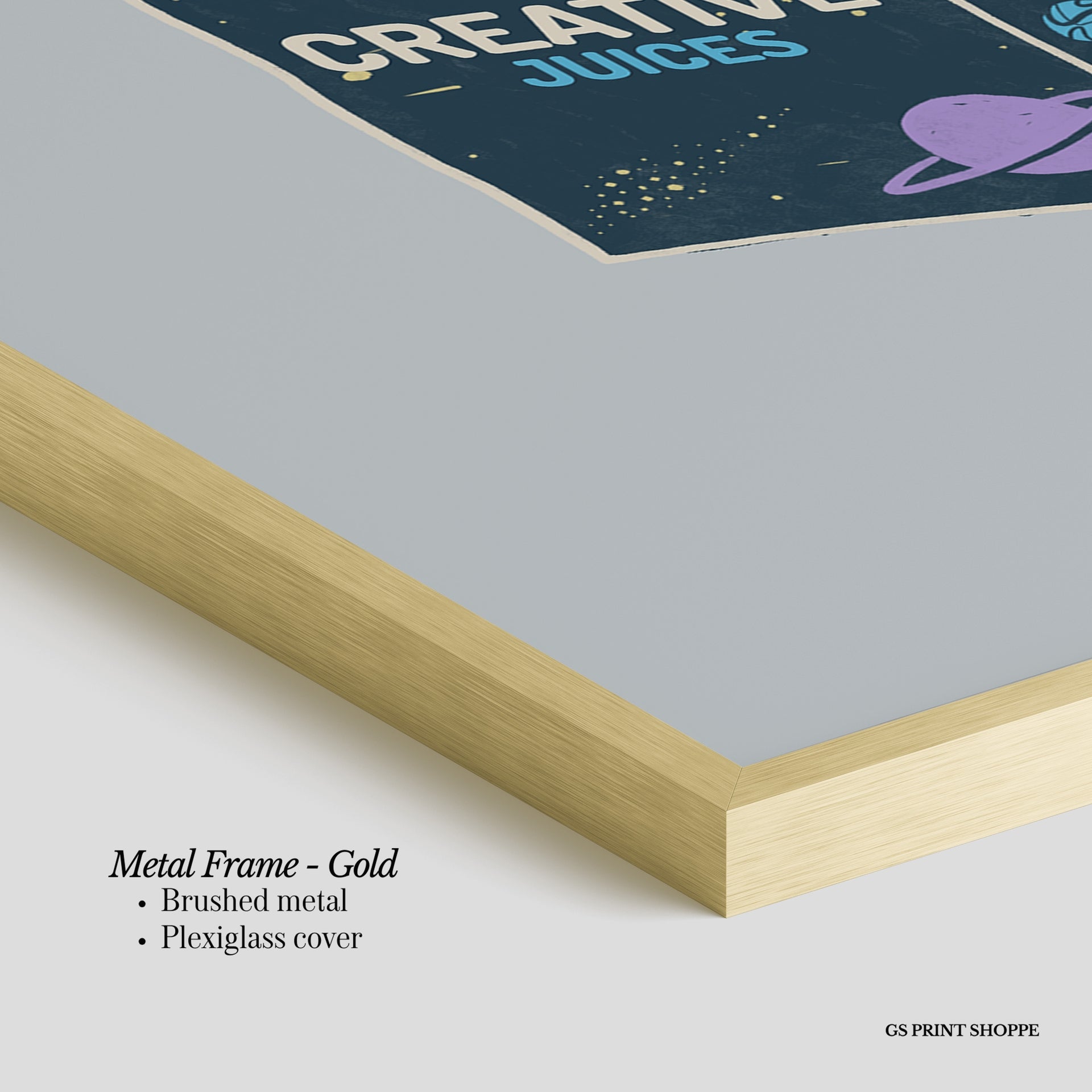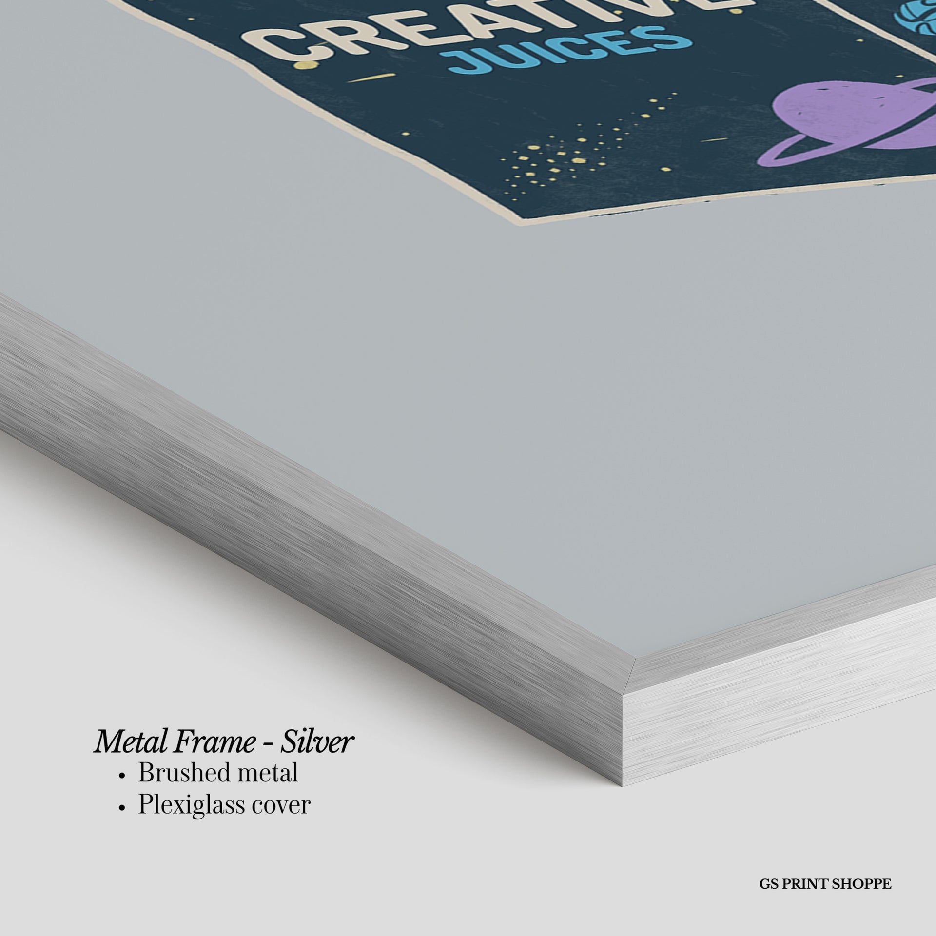 Metal Frame: Sleek and modern, our metal frame is crafted with brushed metal for a polished finish. It comes with durable plexiglass and sturdy metal hangers for horizontal or vertical display.