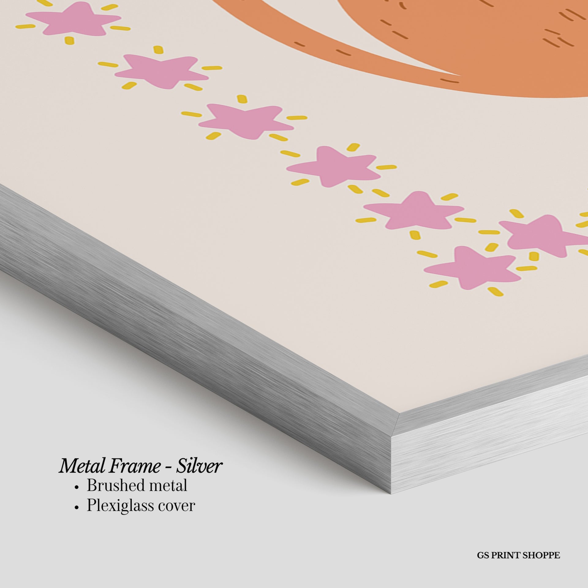 Metal Frame: Sleek and modern, our metal frame is crafted with brushed metal for a polished finish. It comes with durable plexiglass and sturdy metal hangers for horizontal or vertical display.