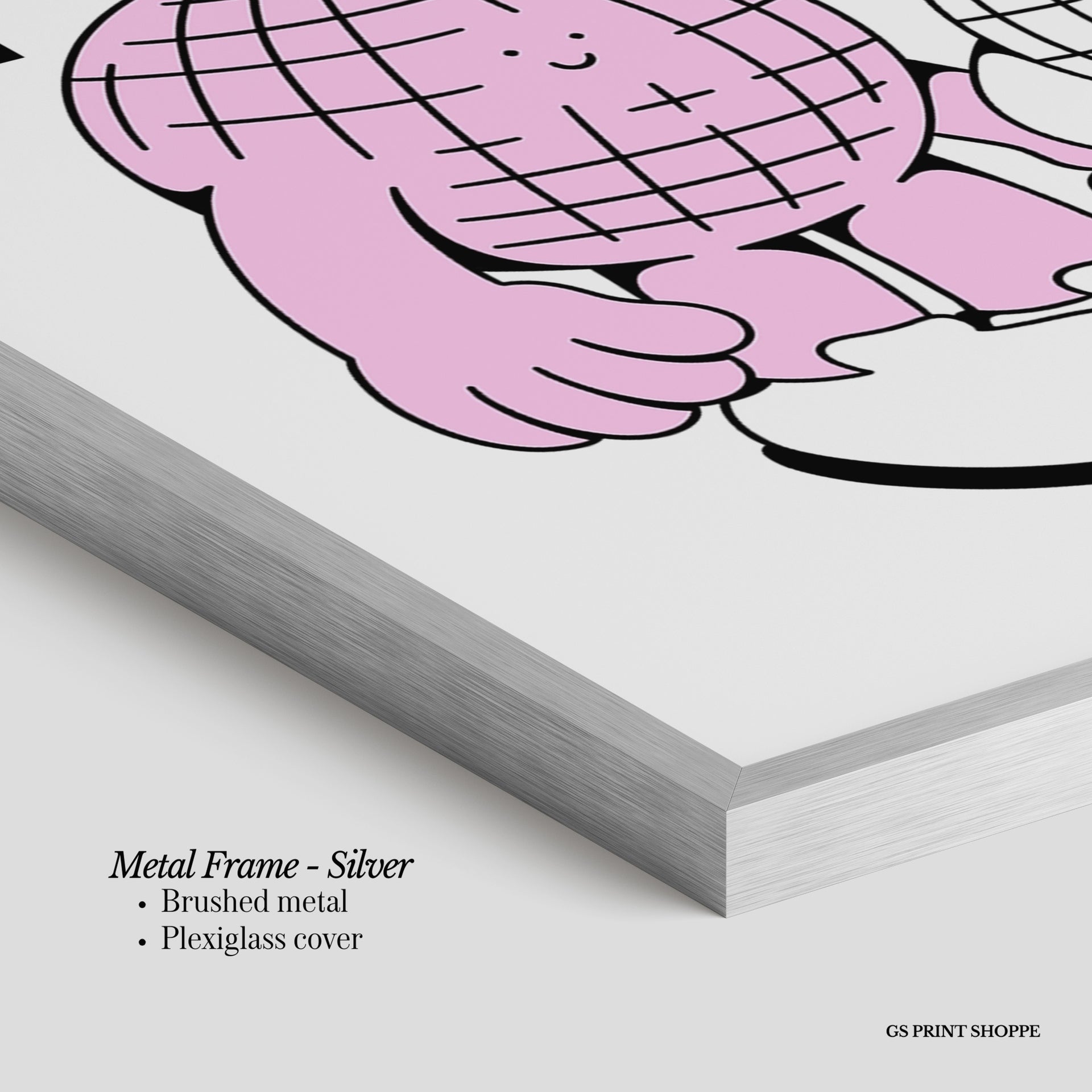 Metal Frame: Sleek and modern, our metal frame is crafted with brushed metal for a polished finish. It comes with durable plexiglass and sturdy metal hangers for horizontal or vertical display.