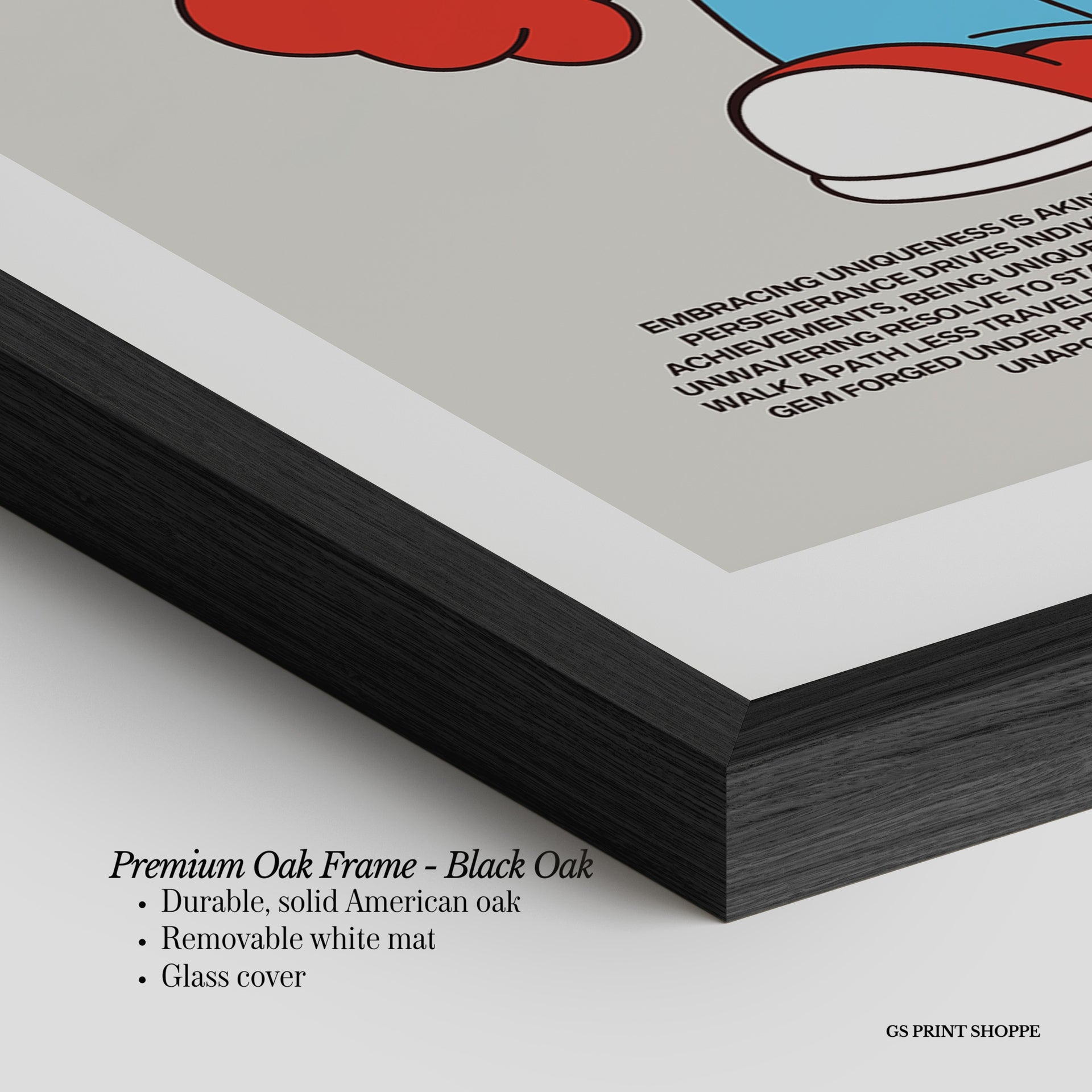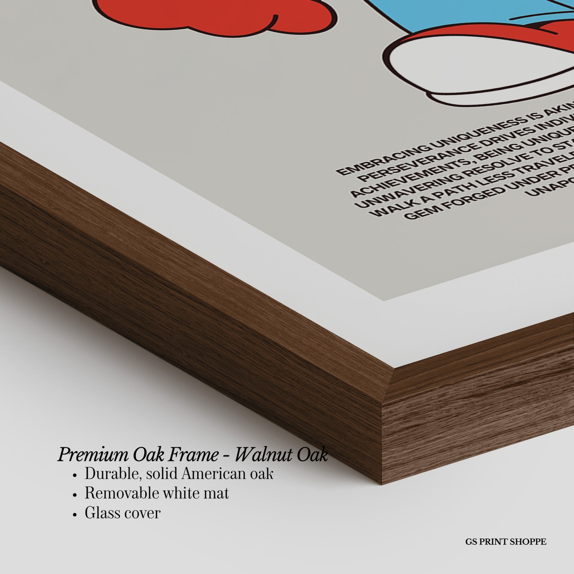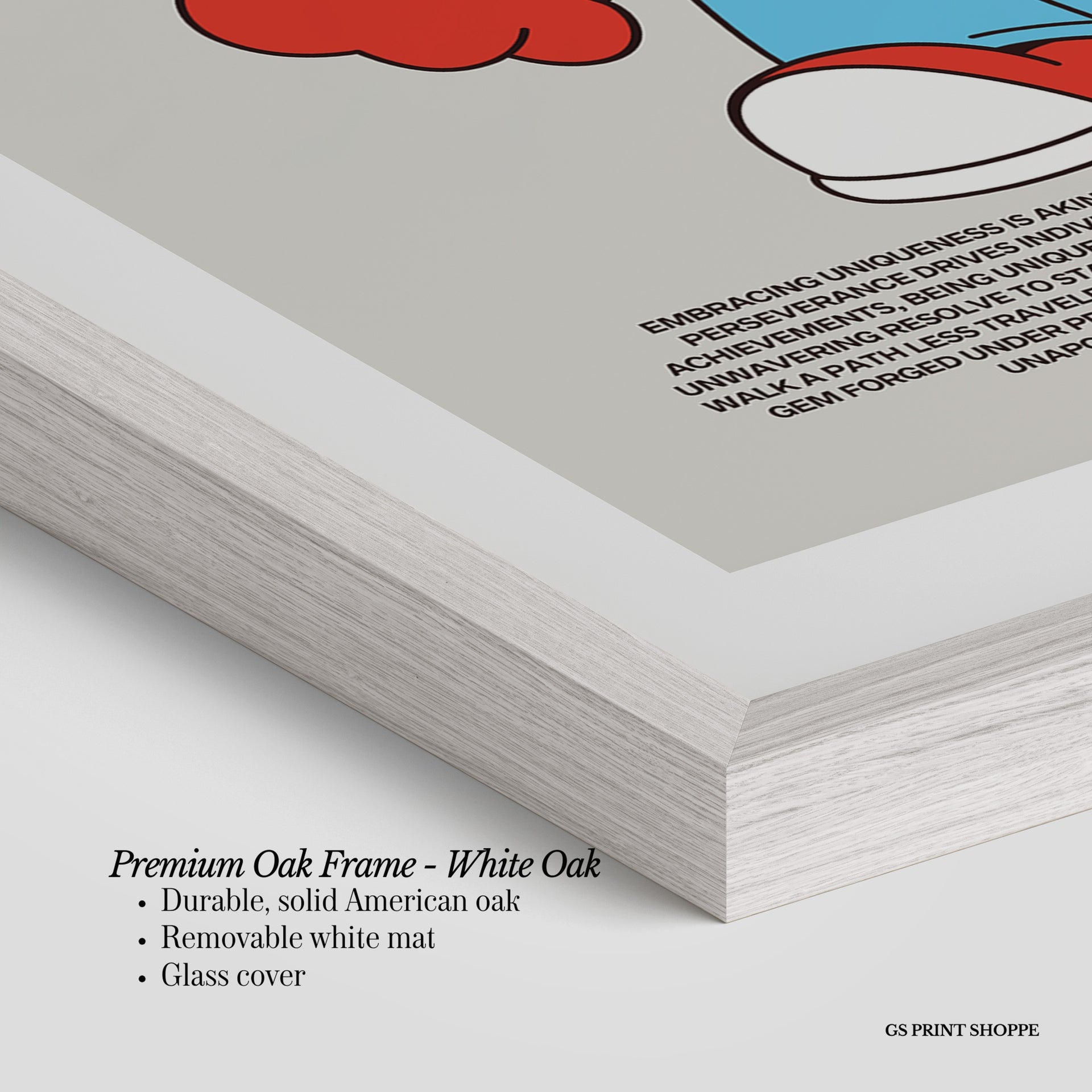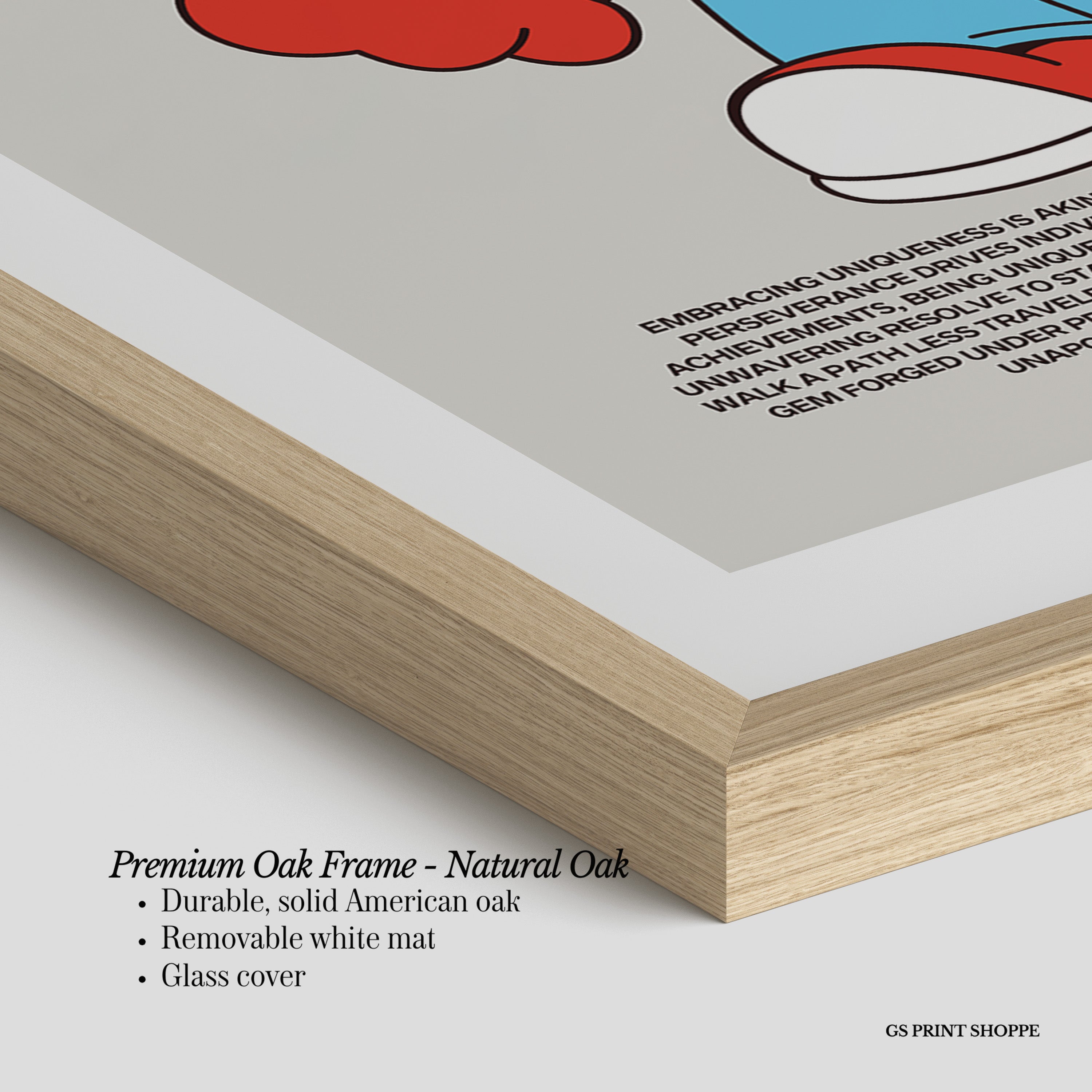 Premium Oak Frame: Our premium oak frame is crafted from solid American oak, offering a warm, natural feel with a high-end finish. We complete this elevated offering with a bright white removable mat and real glass for a versatile and polished look.