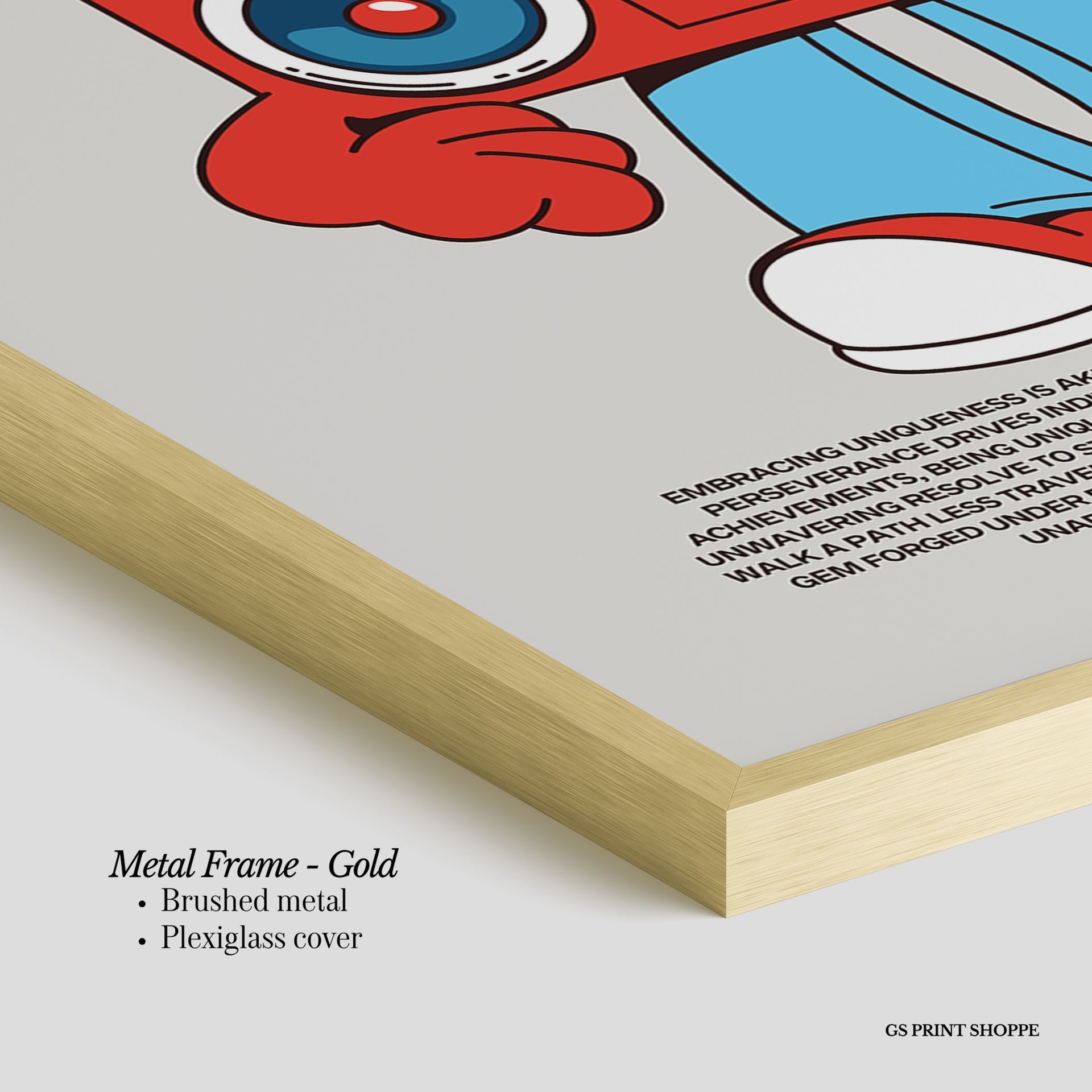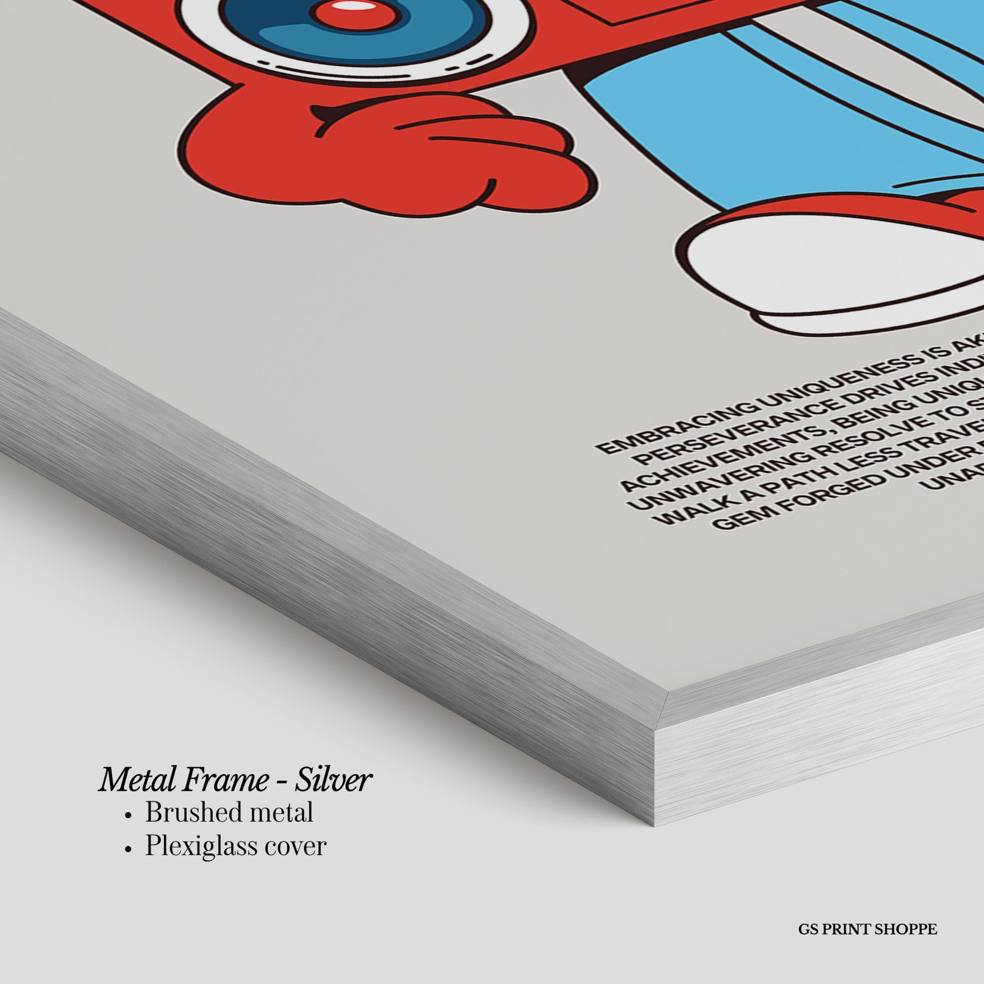 Metal Frame: Sleek and modern, our metal frame is crafted with brushed metal for a polished finish. It comes with durable plexiglass and sturdy metal hangers for horizontal or vertical display.