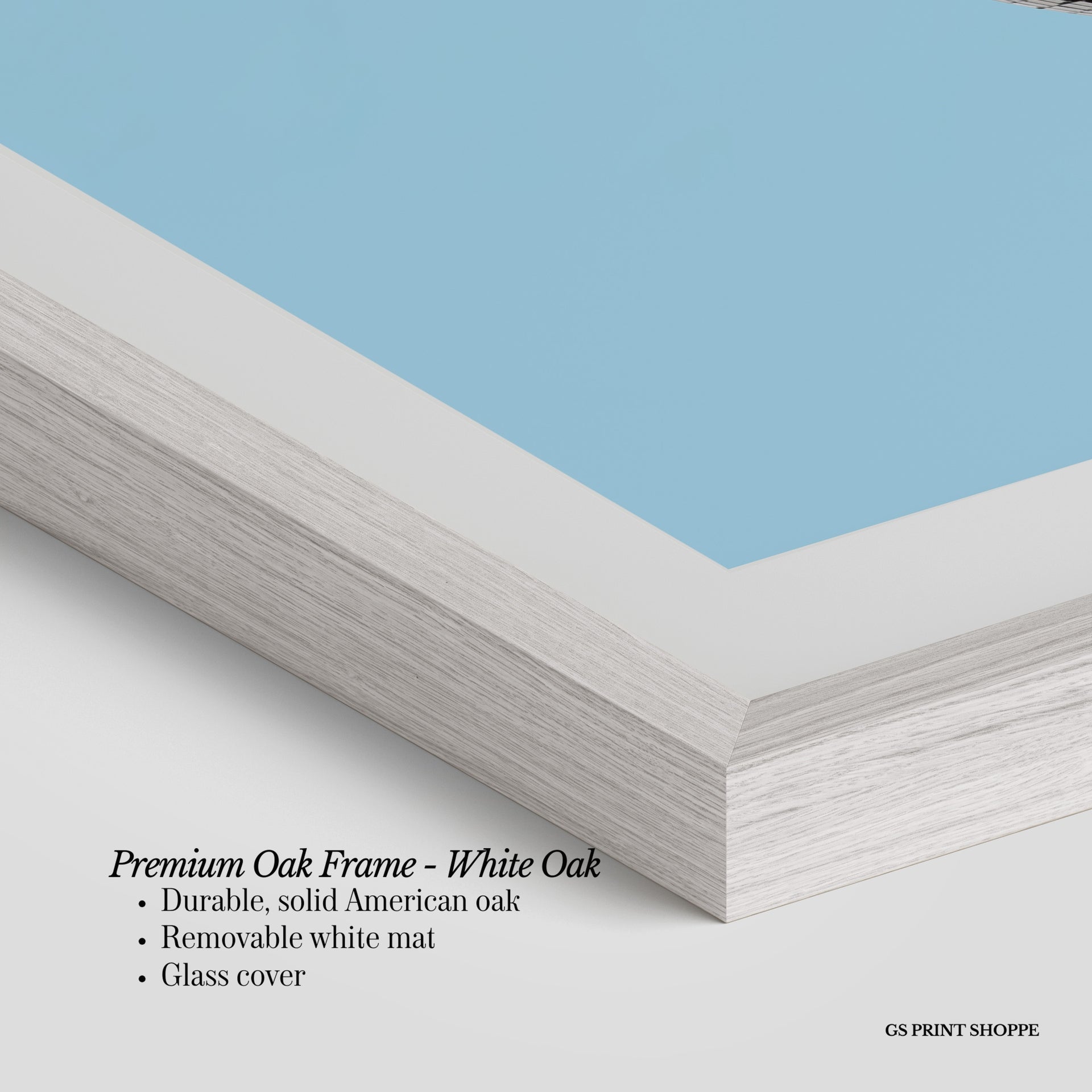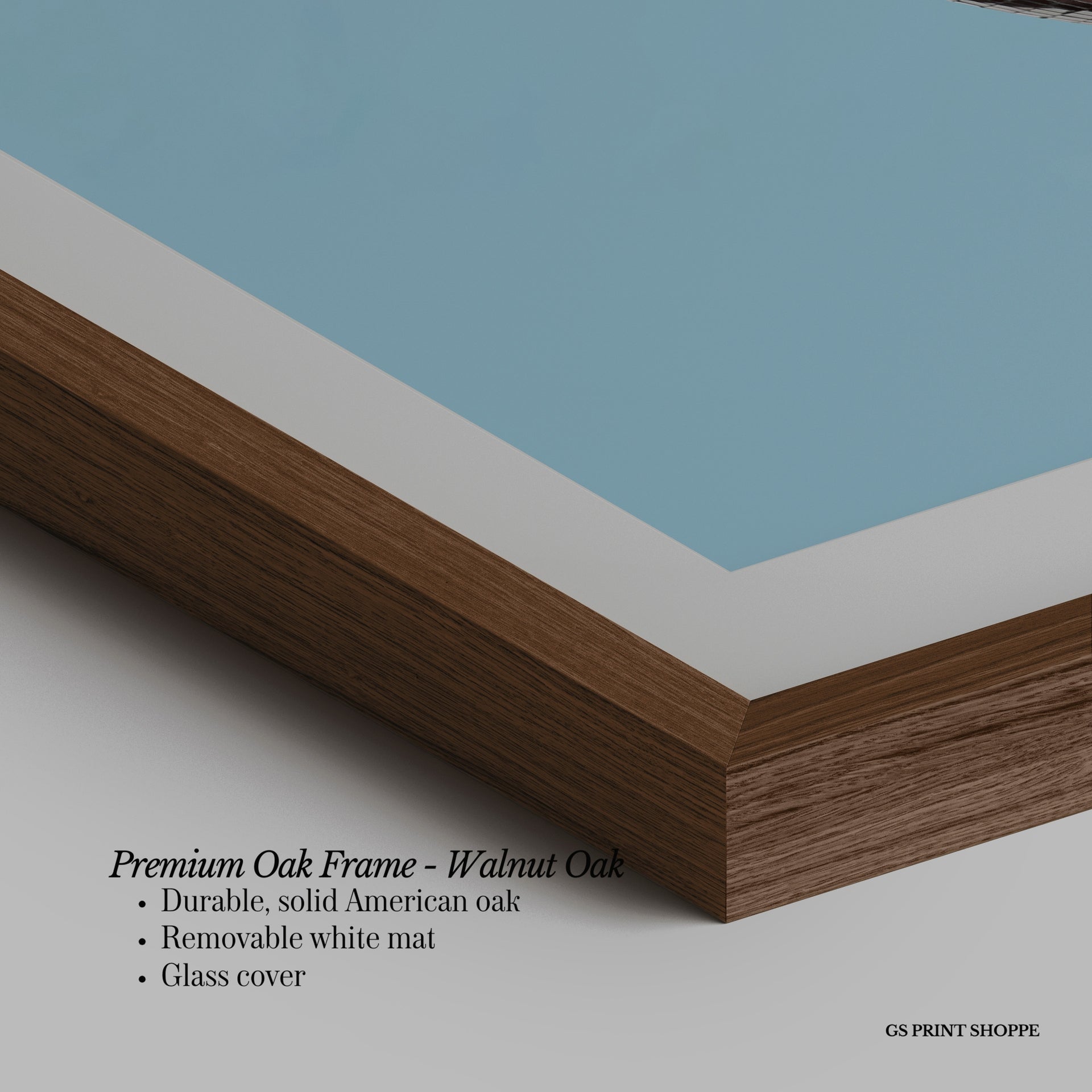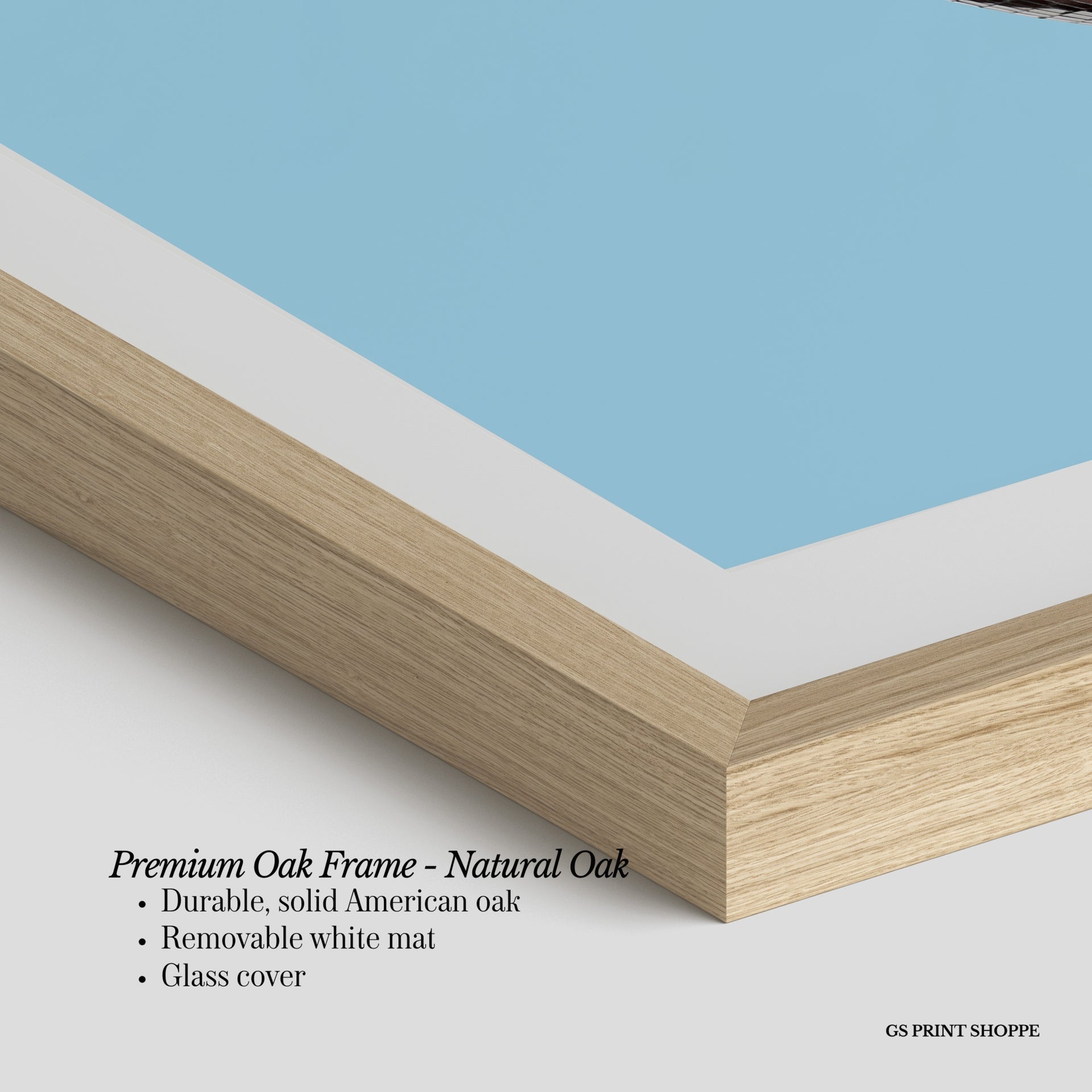 Premium Oak Frame: Our premium oak frame is crafted from solid American oak, offering a warm, natural feel with a high-end finish. We complete this elevated offering with a bright white removable mat and real glass for a versatile and polished look.