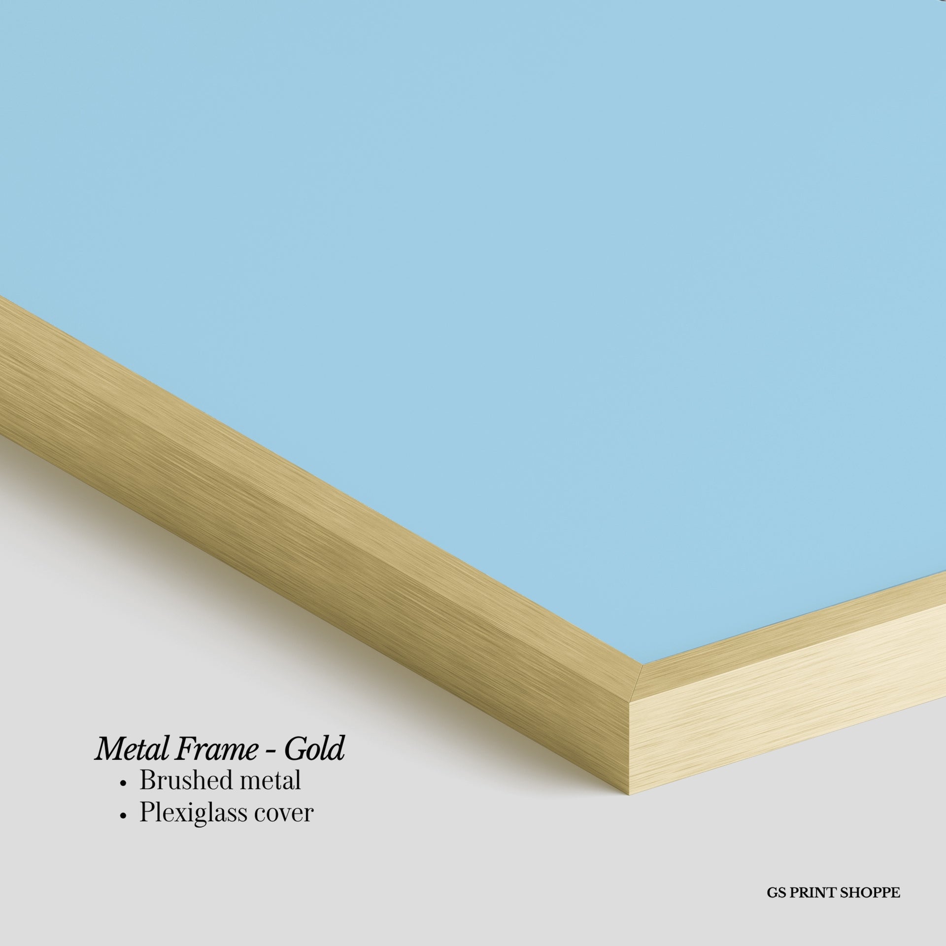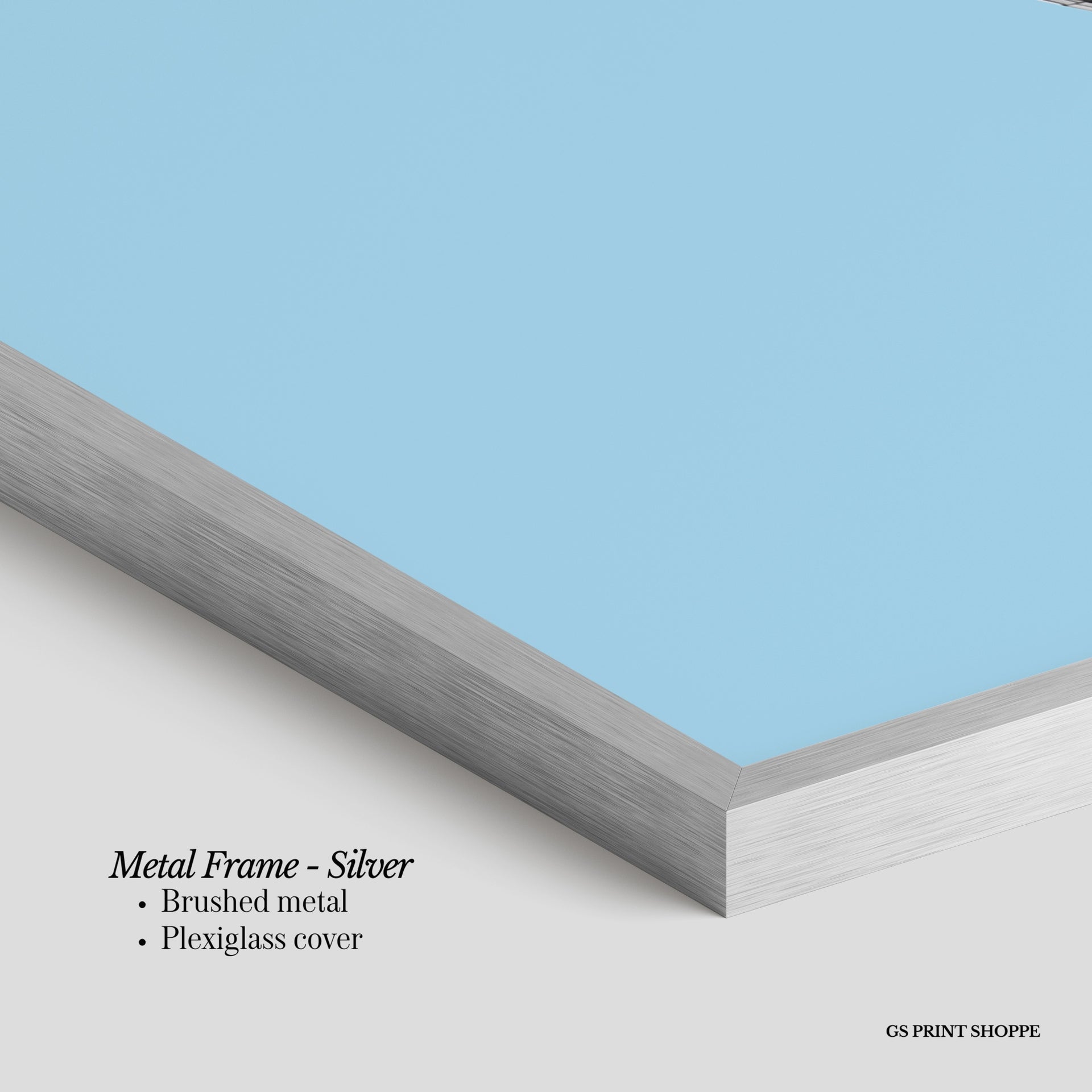Metal Frame: Sleek and modern, our metal frame is crafted with brushed metal for a polished finish. It comes with durable plexiglass and sturdy metal hangers for horizontal or vertical display.