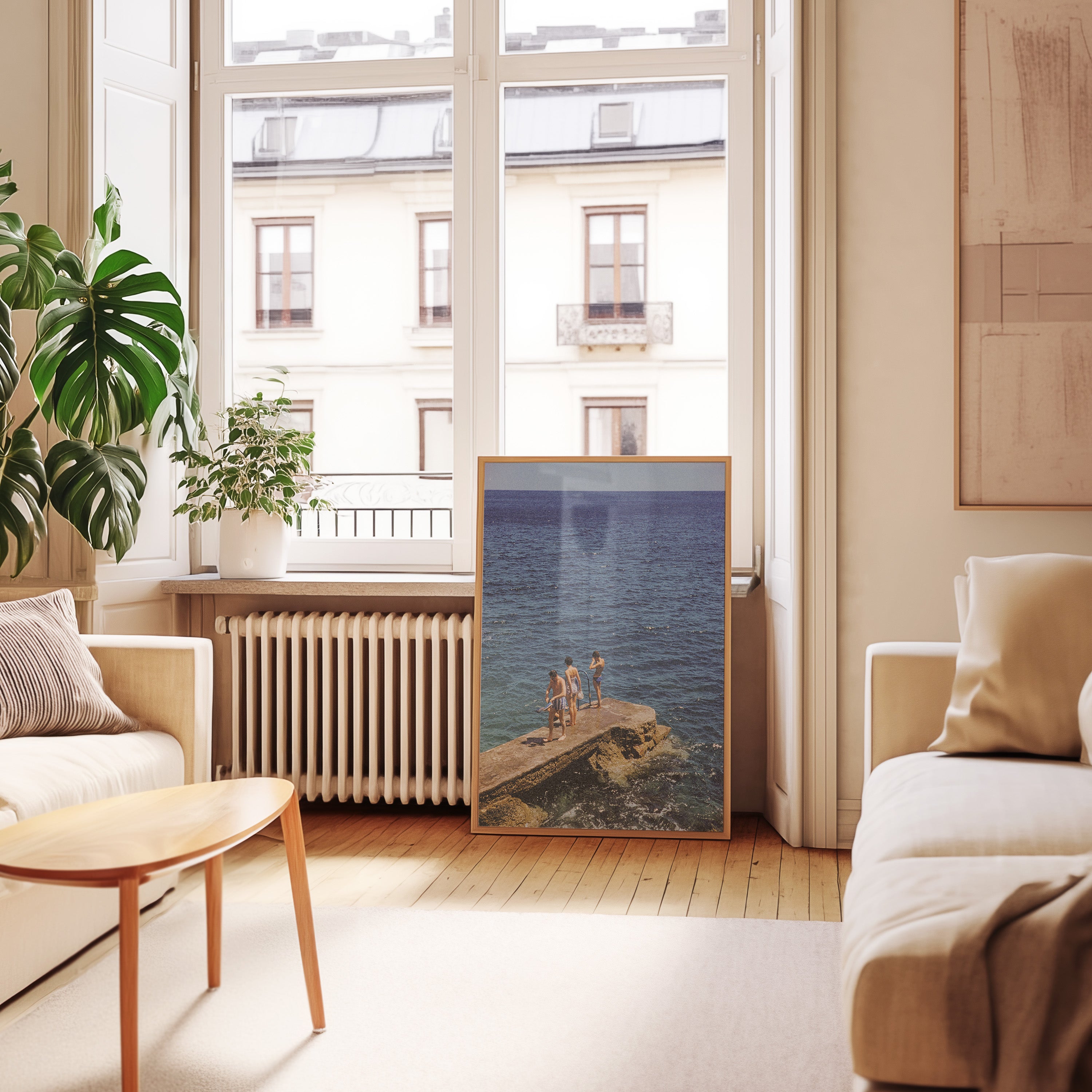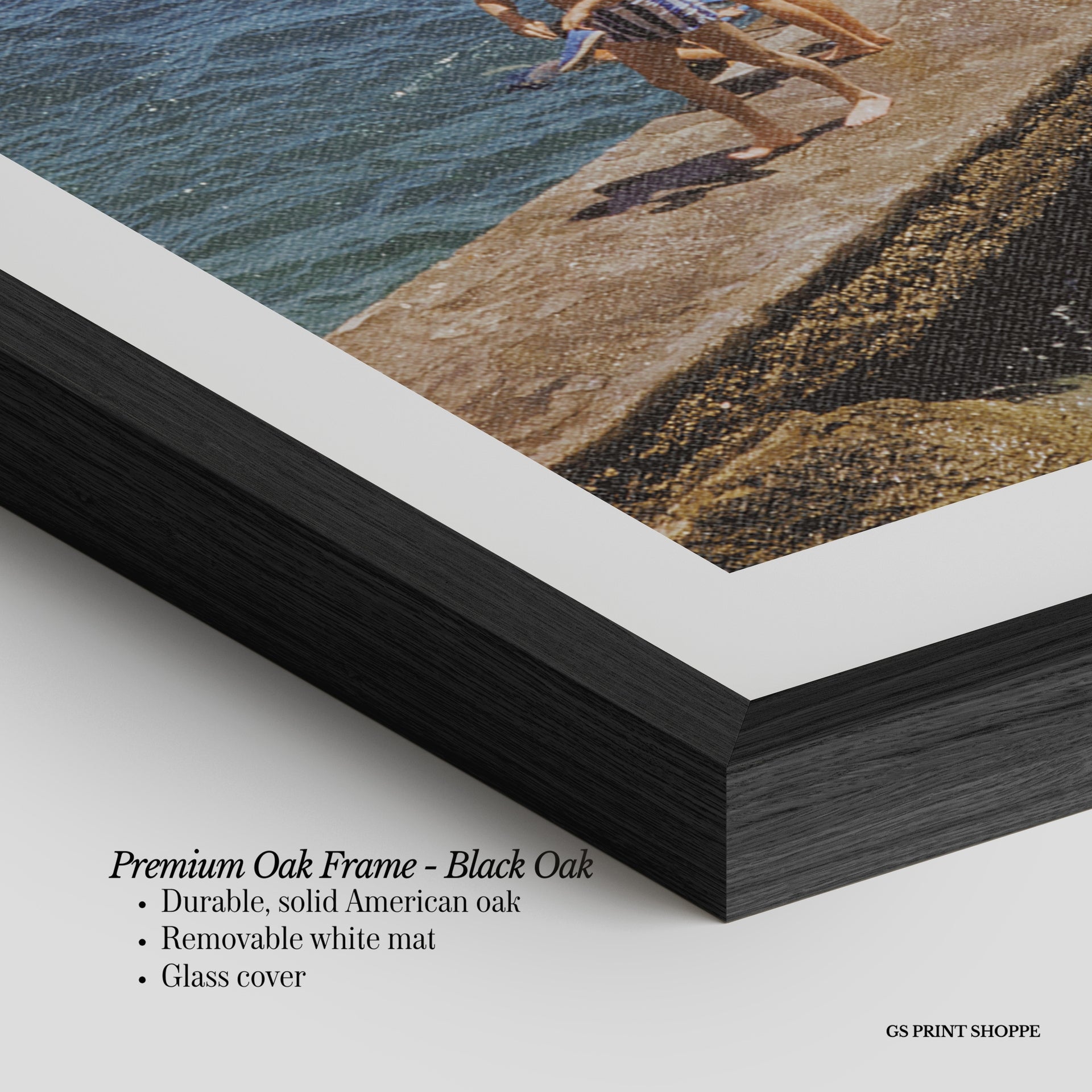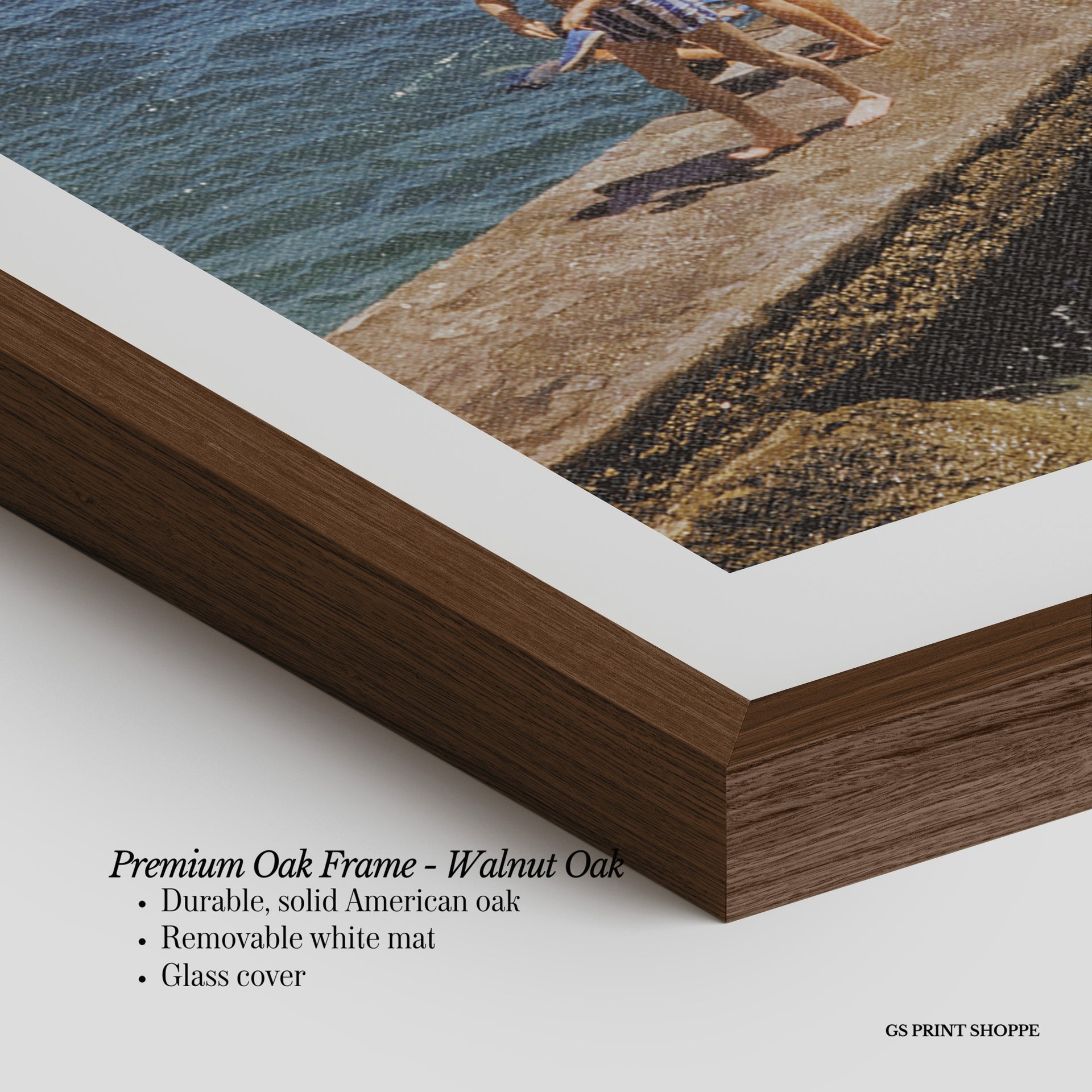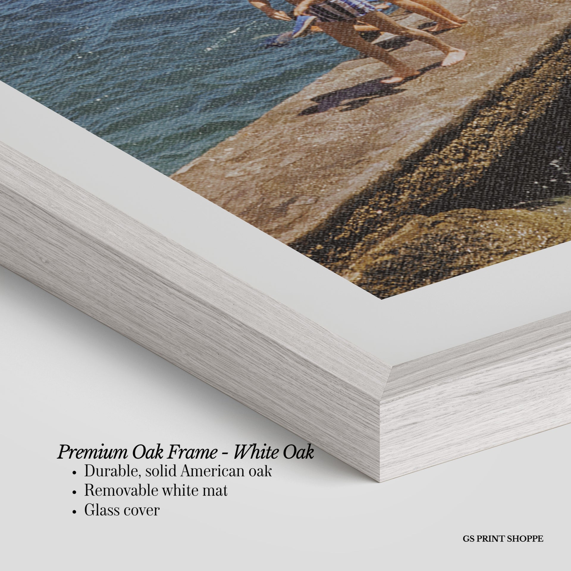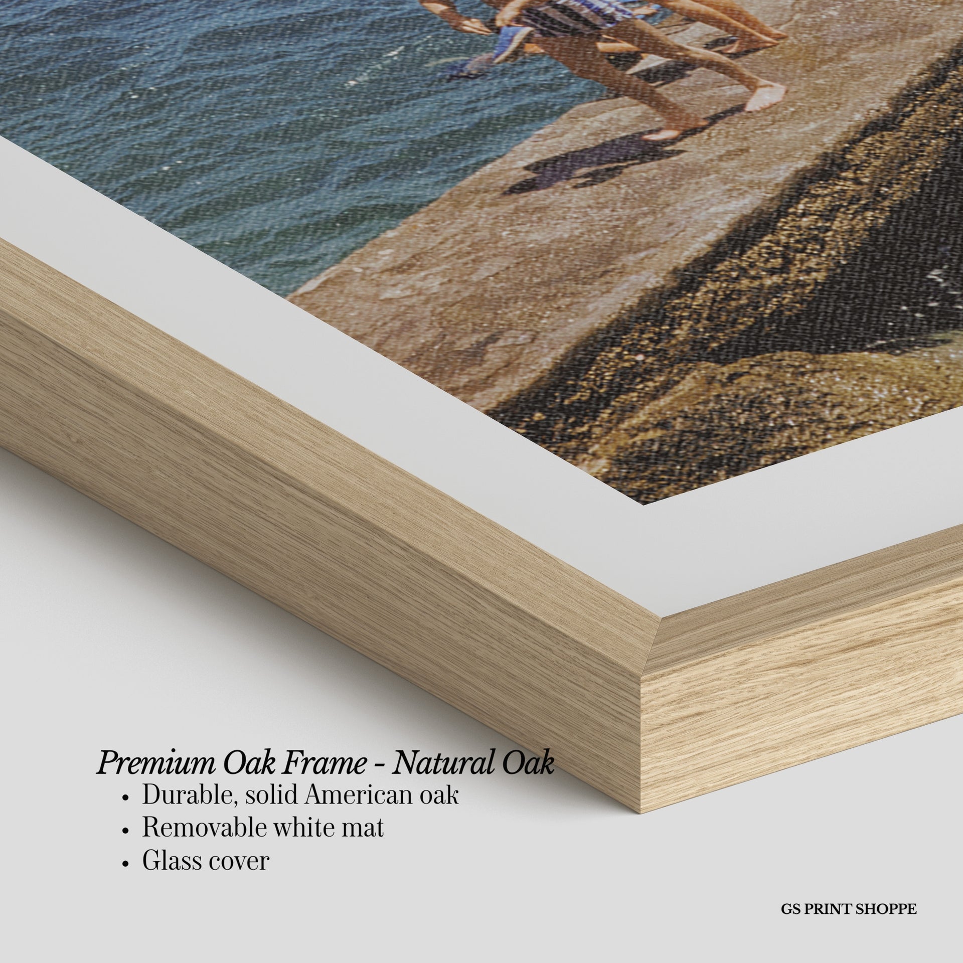 Premium Oak Frame: Our premium oak frame is crafted from solid American oak, offering a warm, natural feel with a high-end finish. We complete this elevated offering with a bright white removable mat and real glass for a versatile and polished look.
