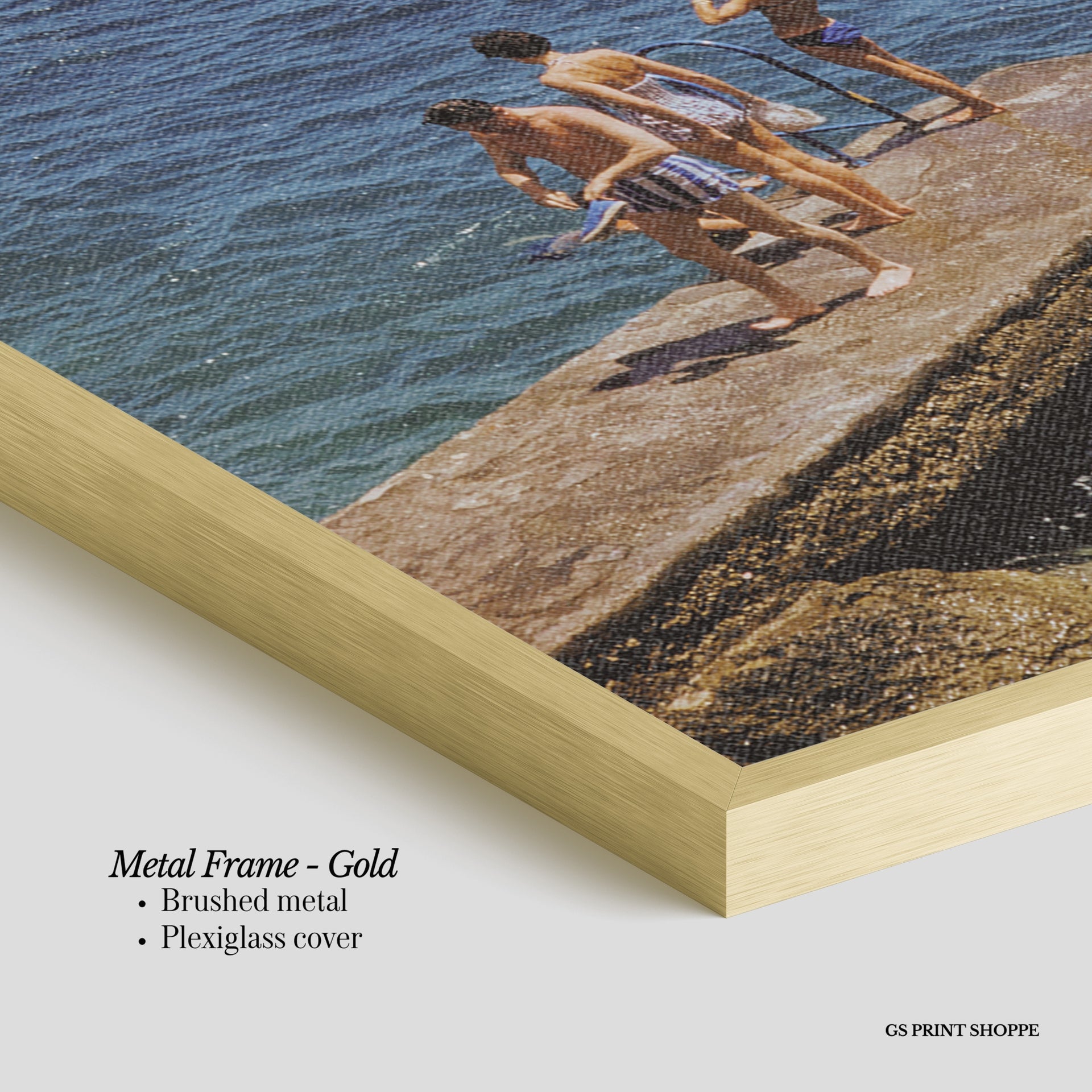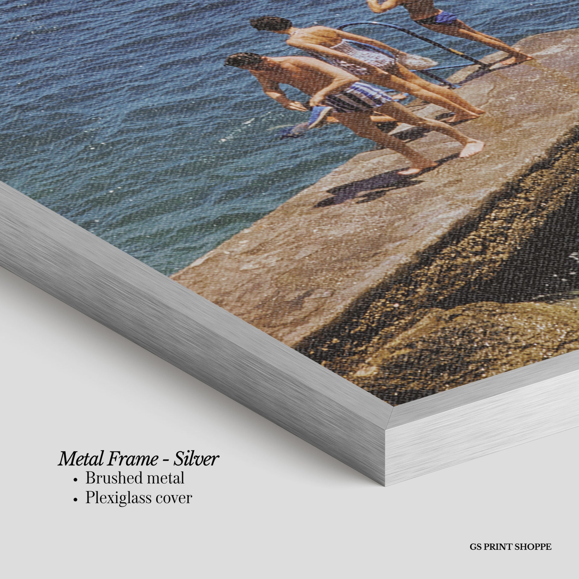 Metal Frame: Sleek and modern, our metal frame is crafted with brushed metal for a polished finish. It comes with durable plexiglass and sturdy metal hangers for horizontal or vertical display.