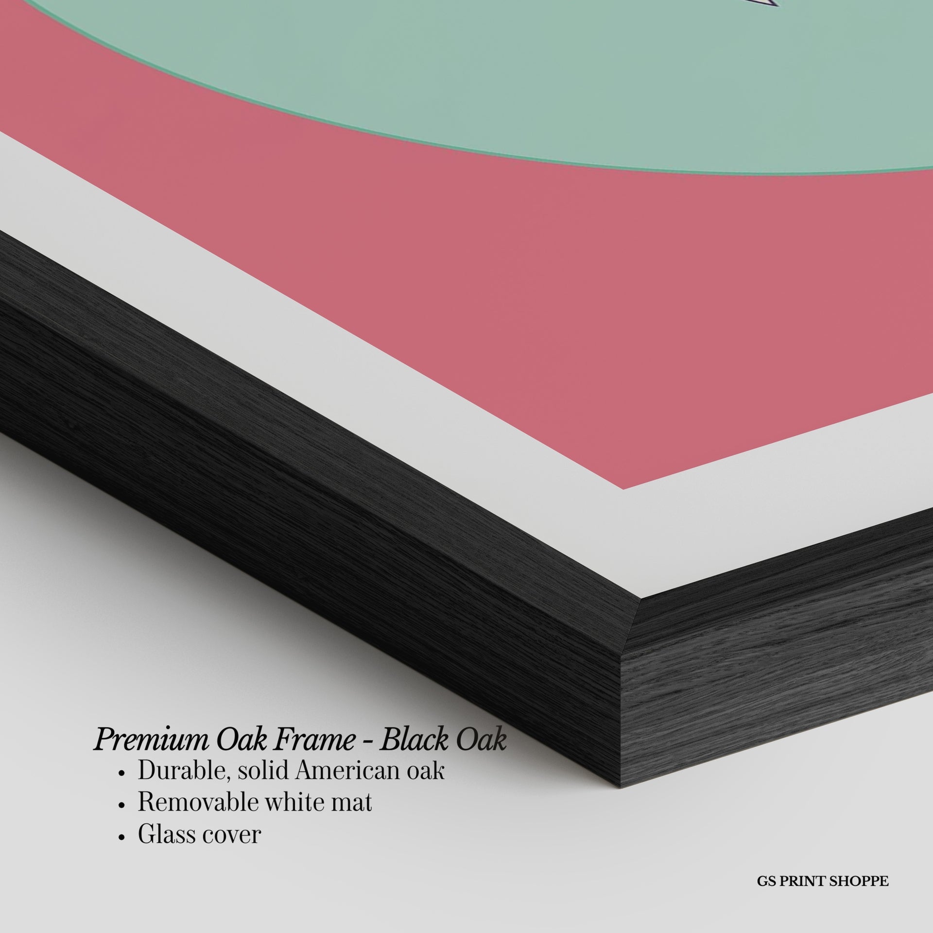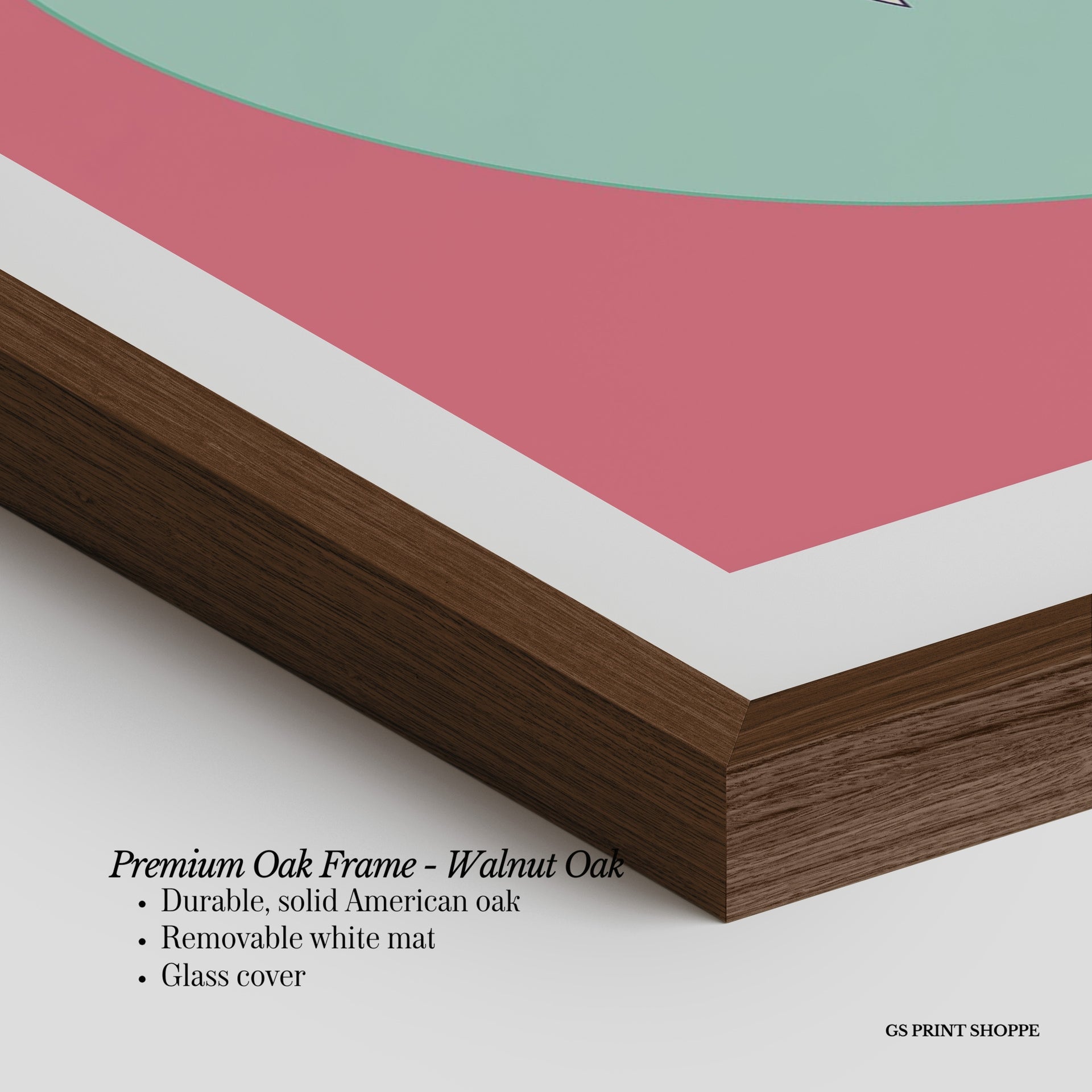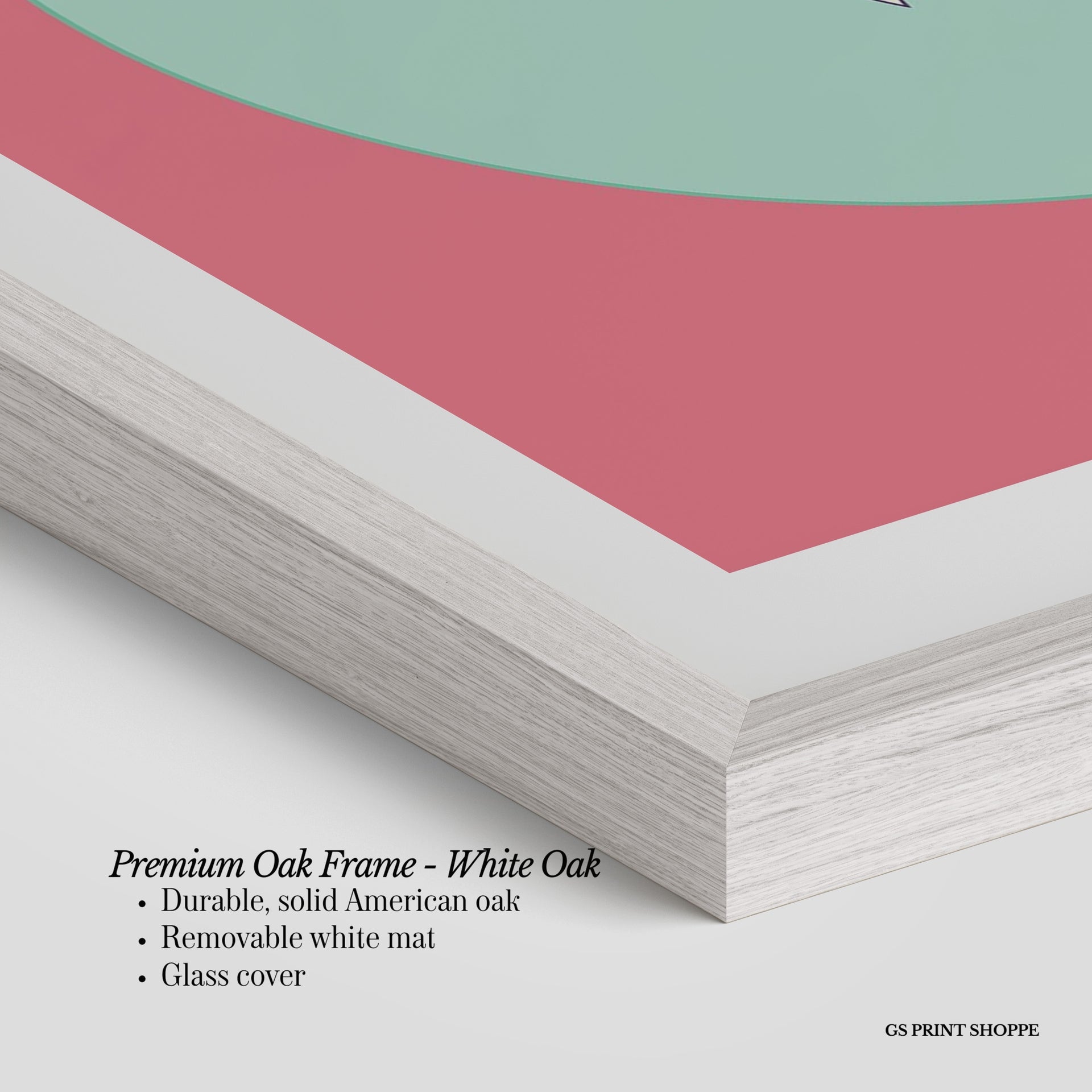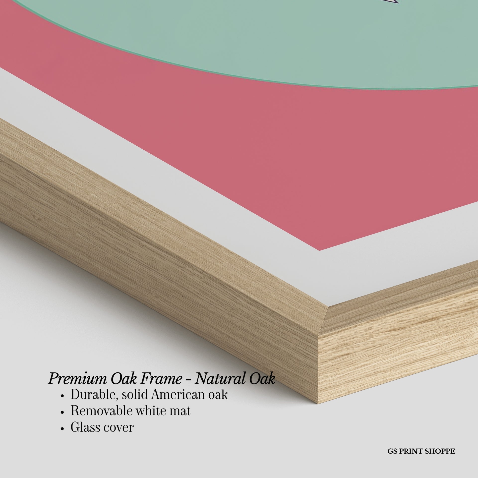 Premium Oak Frame: Our premium oak frame is crafted from solid American oak, offering a warm, natural feel with a high-end finish. We complete this elevated offering with a bright white removable mat and real glass for a versatile and polished look.