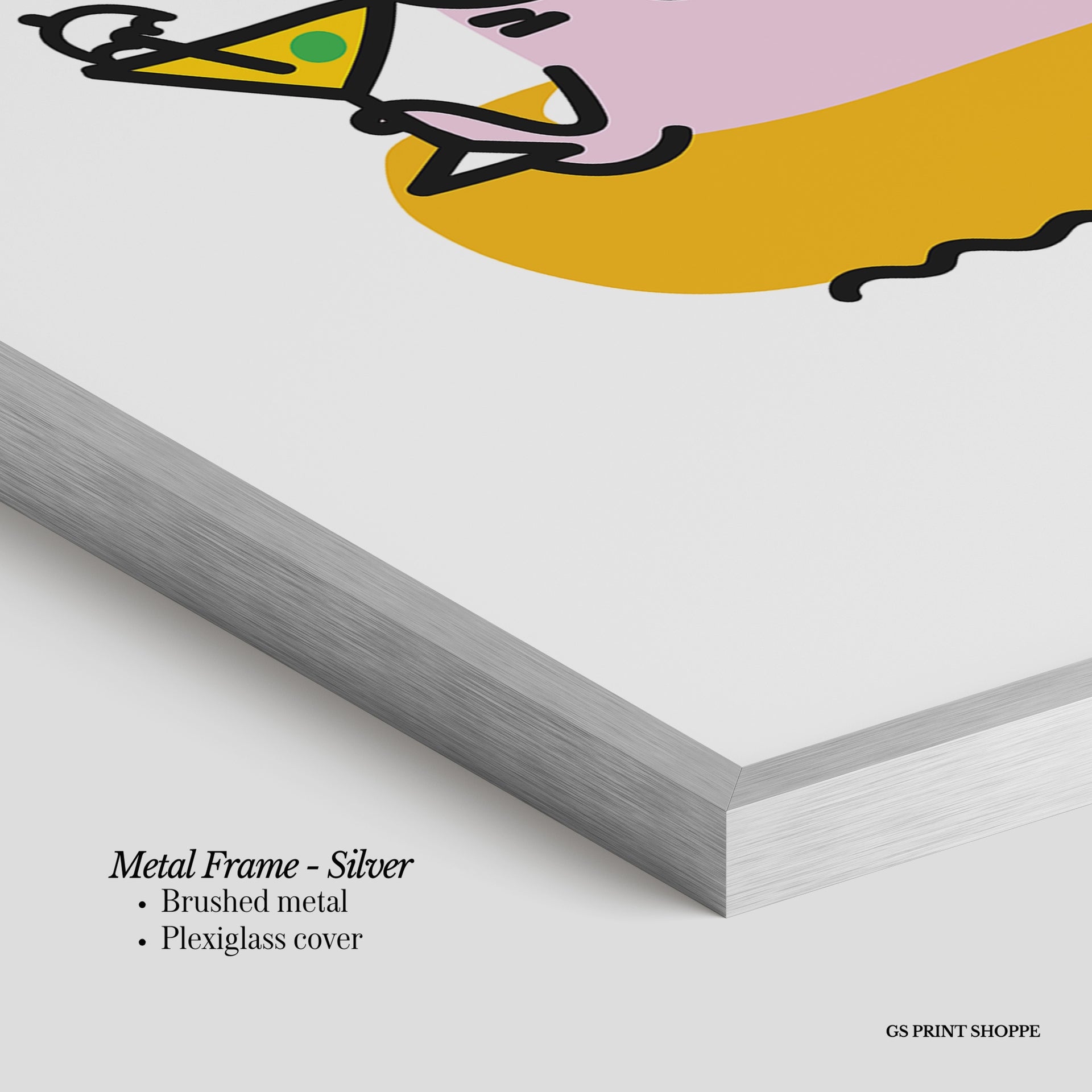Metal Frame: Sleek and modern, our metal frame is crafted with brushed metal for a polished finish. It comes with durable plexiglass and sturdy metal hangers for horizontal or vertical display.