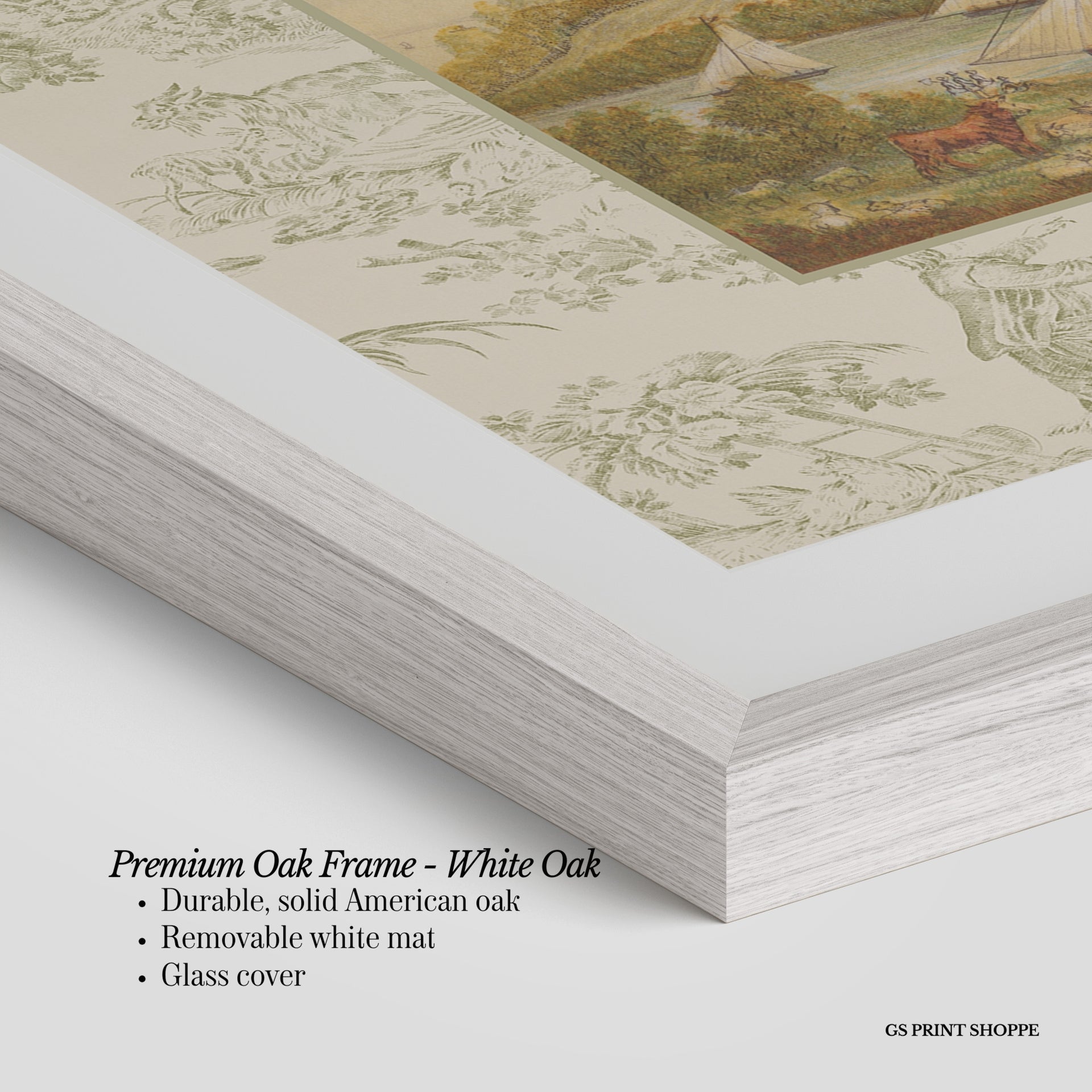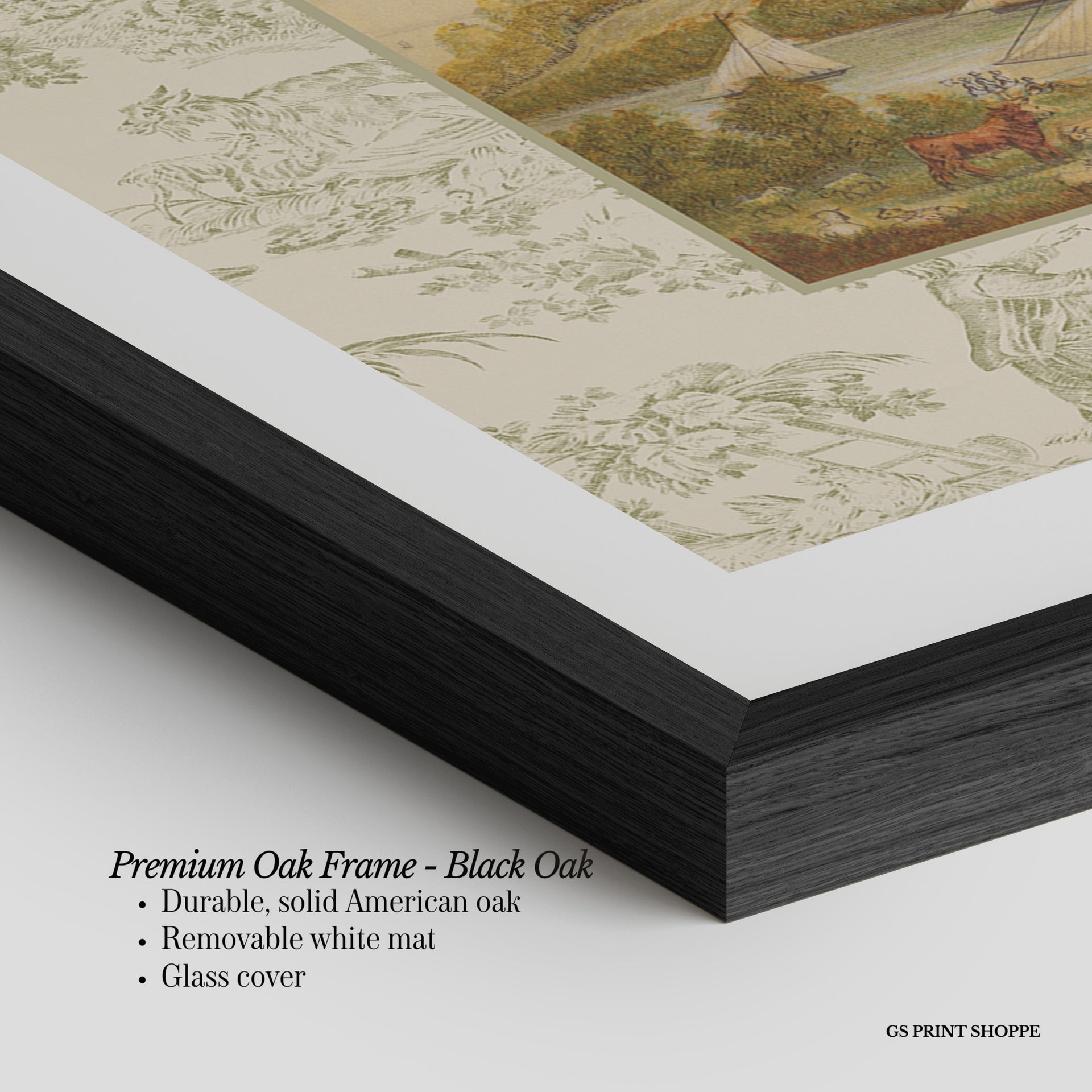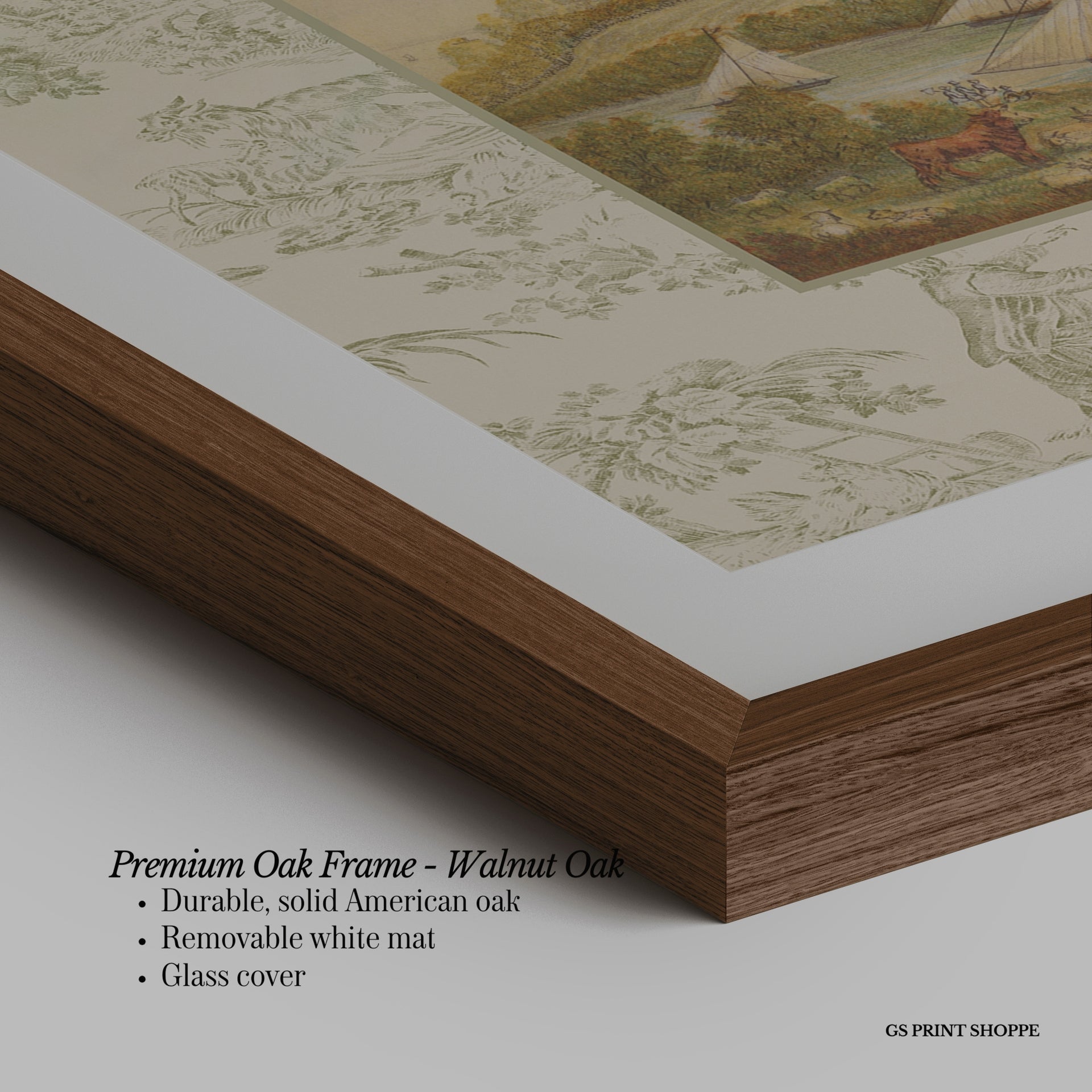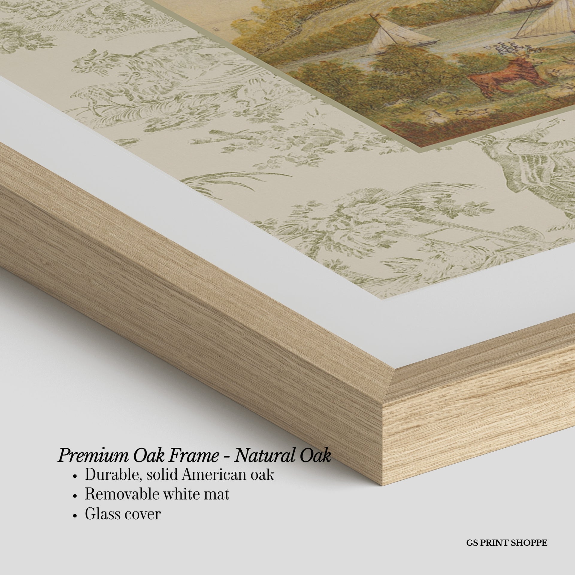 Premium Oak Frame: Our premium oak frame is crafted from solid American oak, offering a warm, natural feel with a high-end finish. We complete this elevated offering with a bright white removable mat and real glass for a versatile and polished look.