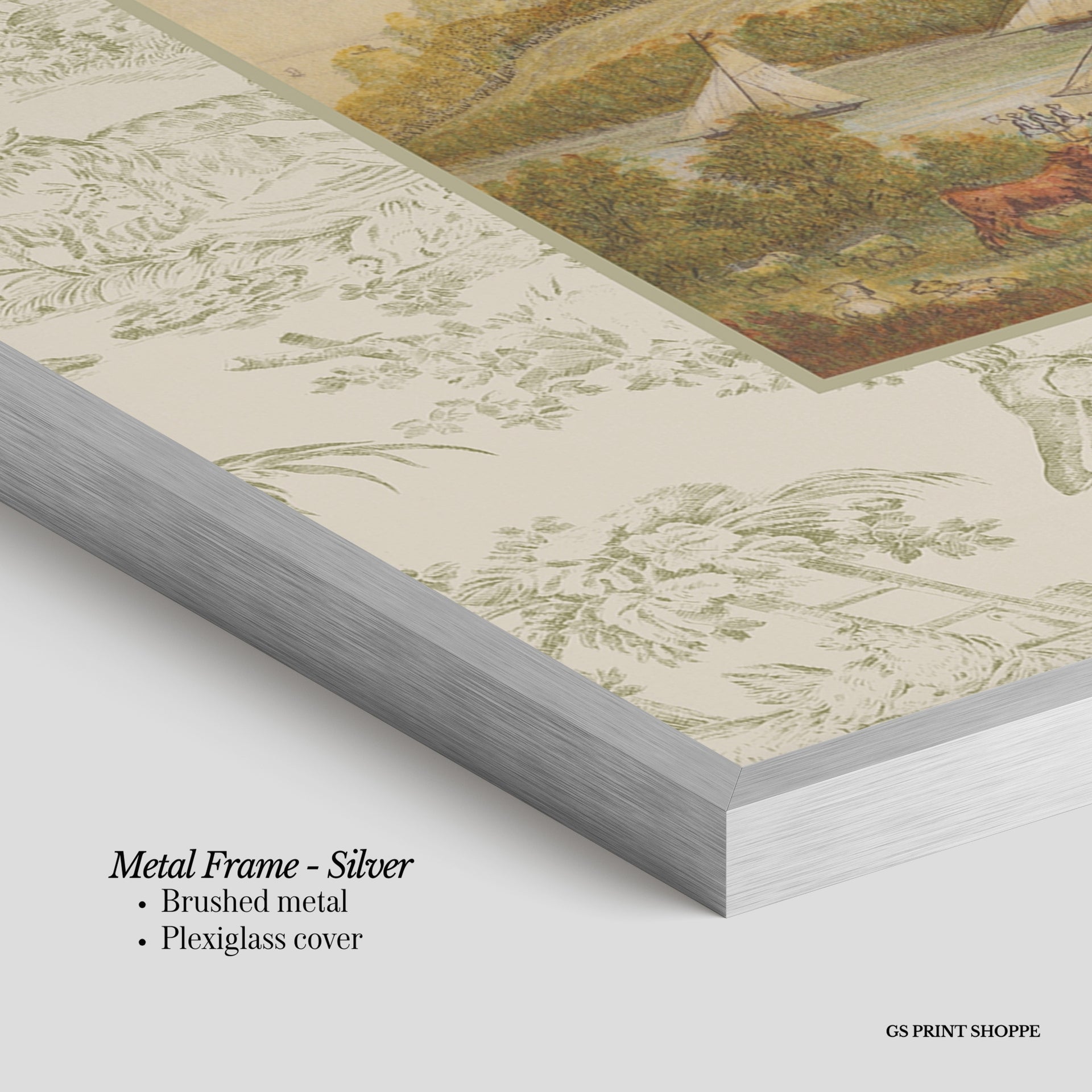 Metal Frame: Sleek and modern, our metal frame is crafted with brushed metal for a polished finish. It comes with durable plexiglass and sturdy metal hangers for horizontal or vertical display.
