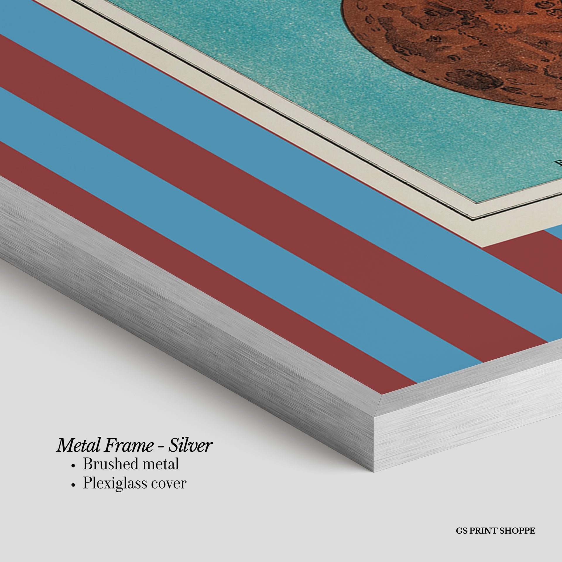 Metal Frame: Sleek and modern, our metal frame is crafted with brushed metal for a polished finish. It comes with durable plexiglass and sturdy metal hangers for horizontal or vertical display.