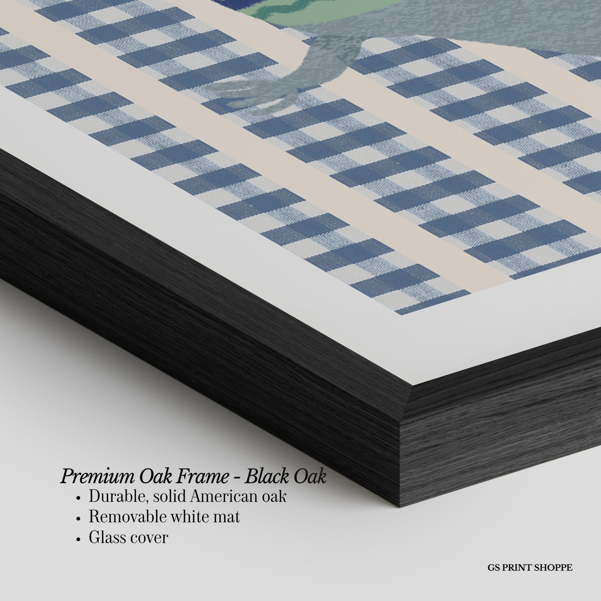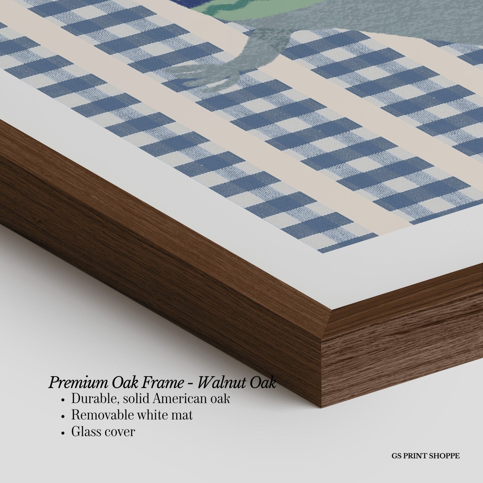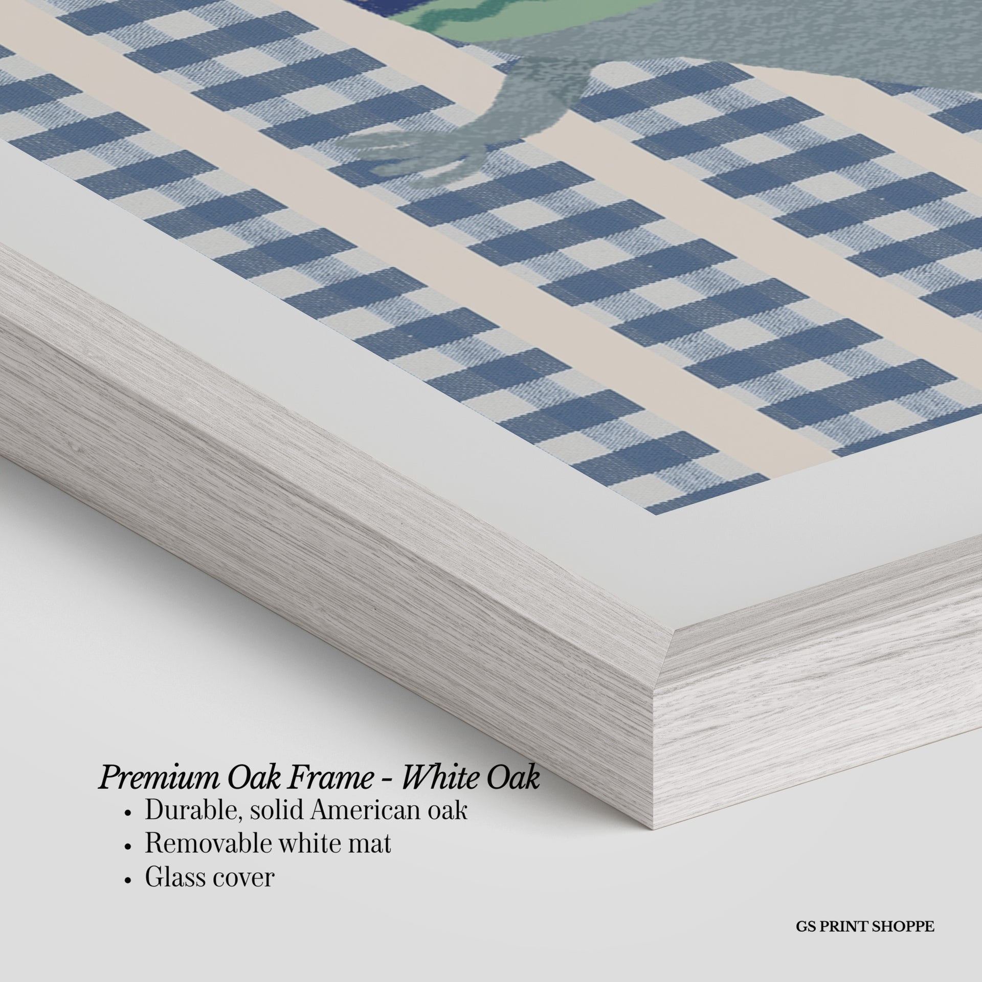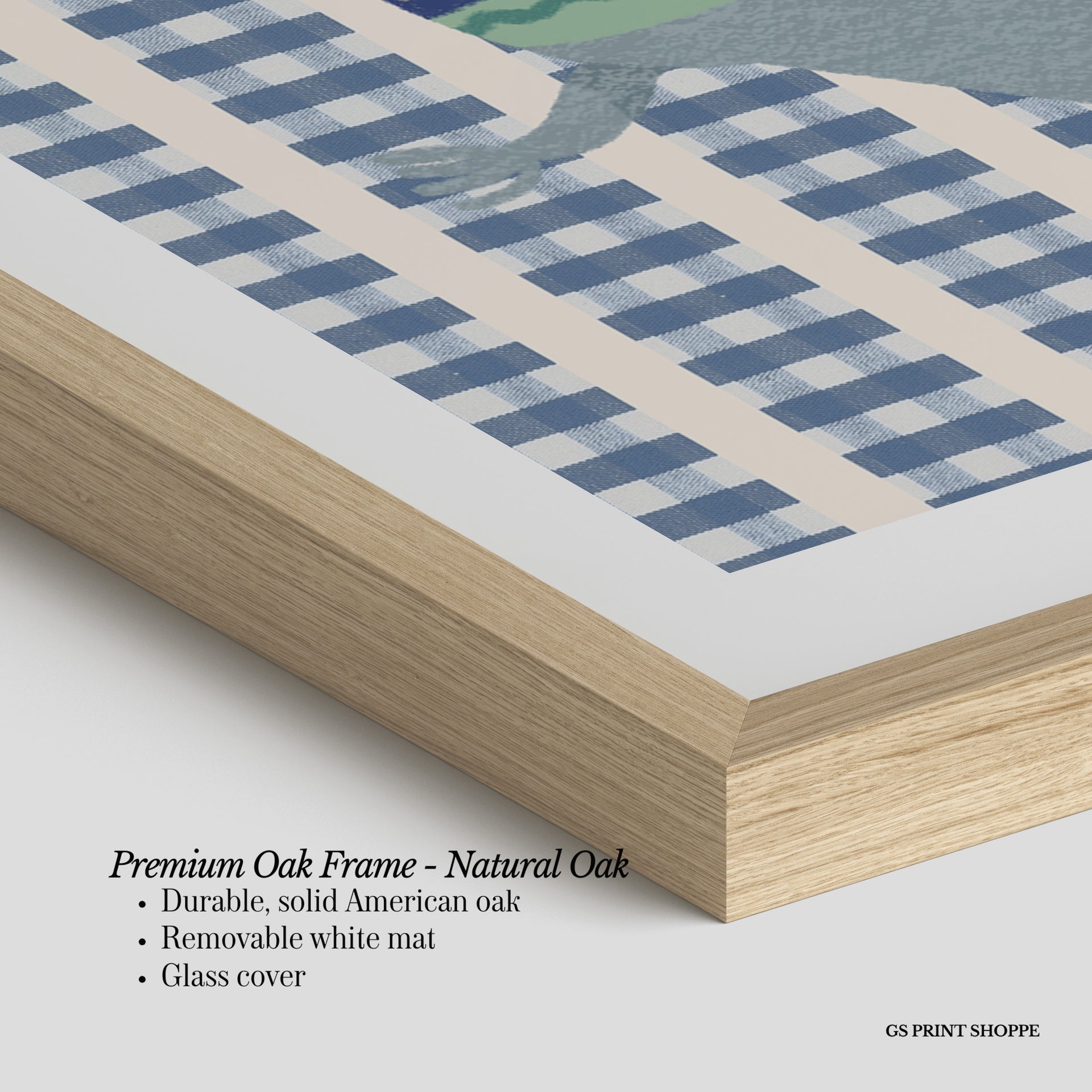 Premium Oak Frame: Our premium oak frame is crafted from solid American oak, offering a warm, natural feel with a high-end finish. We complete this elevated offering with a bright white removable mat and real glass for a versatile and polished look.