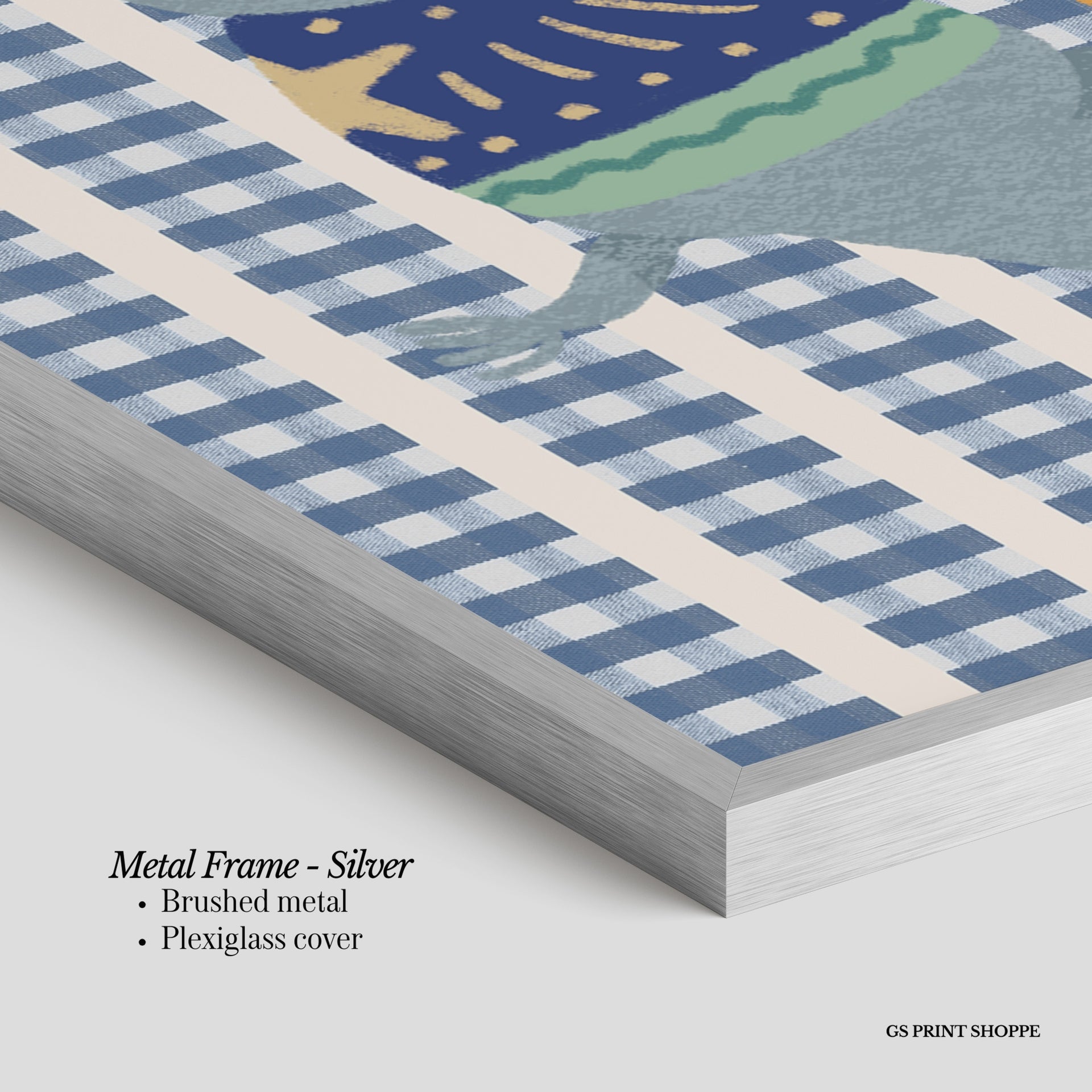 Metal Frame: Sleek and modern, our metal frame is crafted with brushed metal for a polished finish. It comes with durable plexiglass and sturdy metal hangers for horizontal or vertical display.