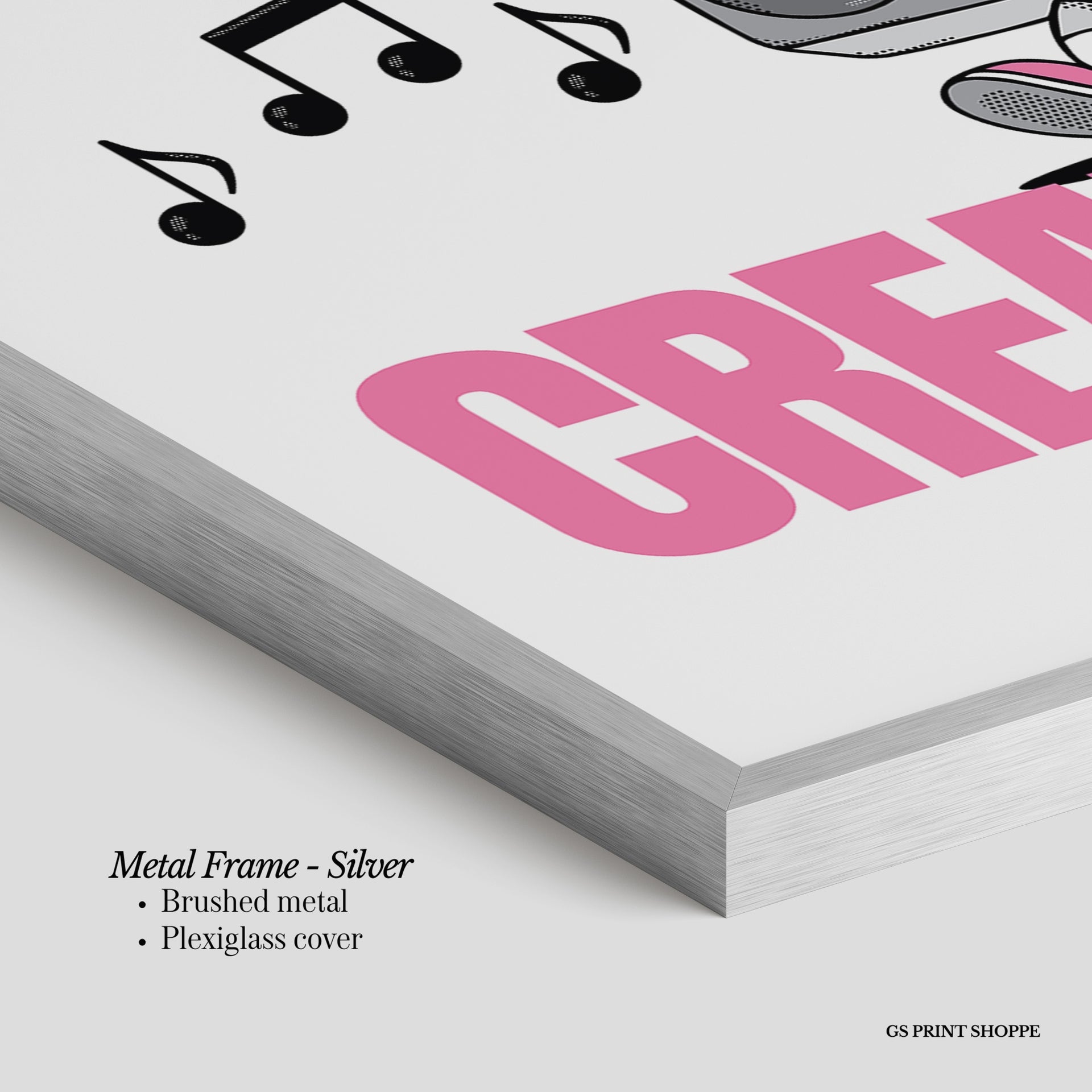 Metal Frame: Sleek and modern, our metal frame is crafted with brushed metal for a polished finish. It comes with durable plexiglass and sturdy metal hangers for horizontal or vertical display.