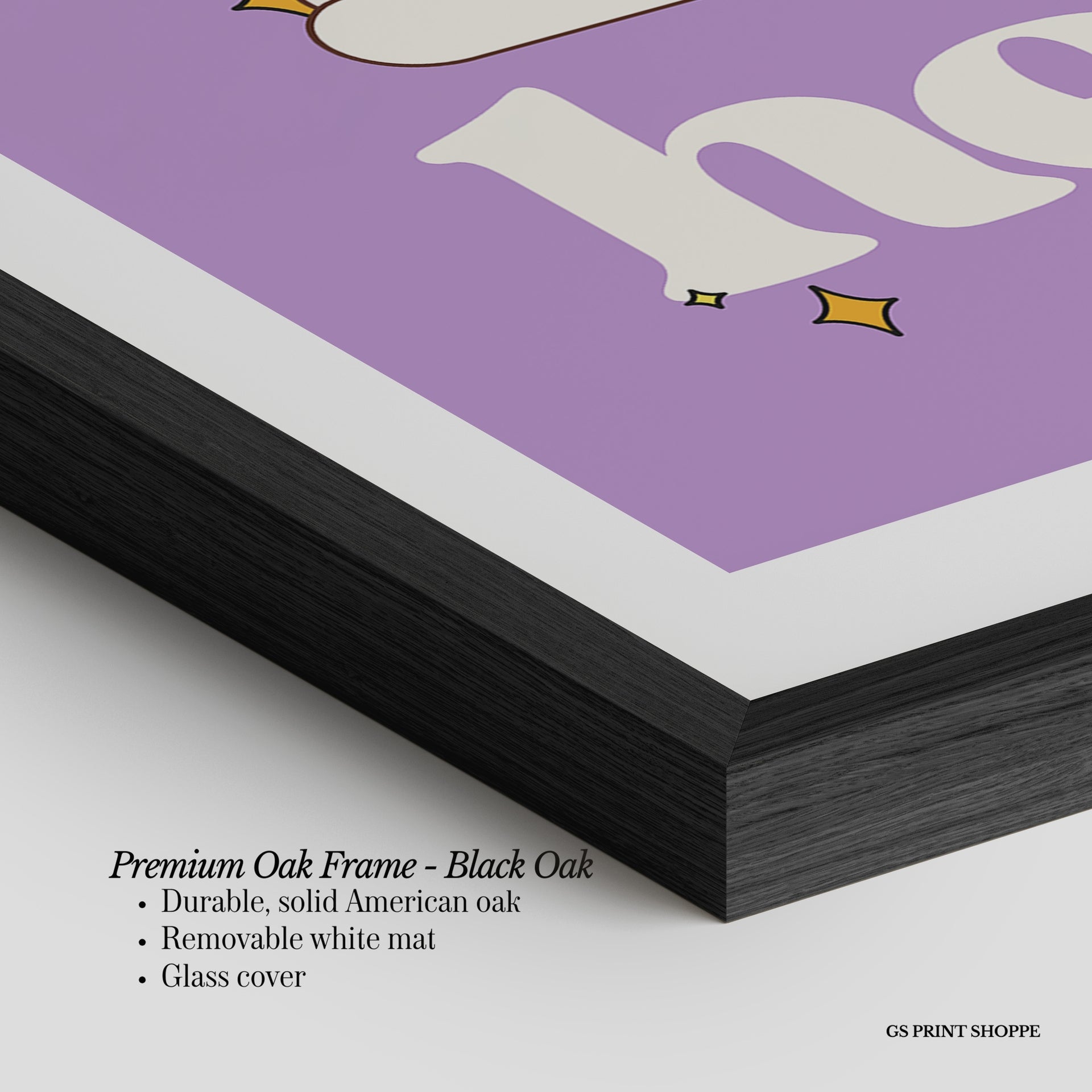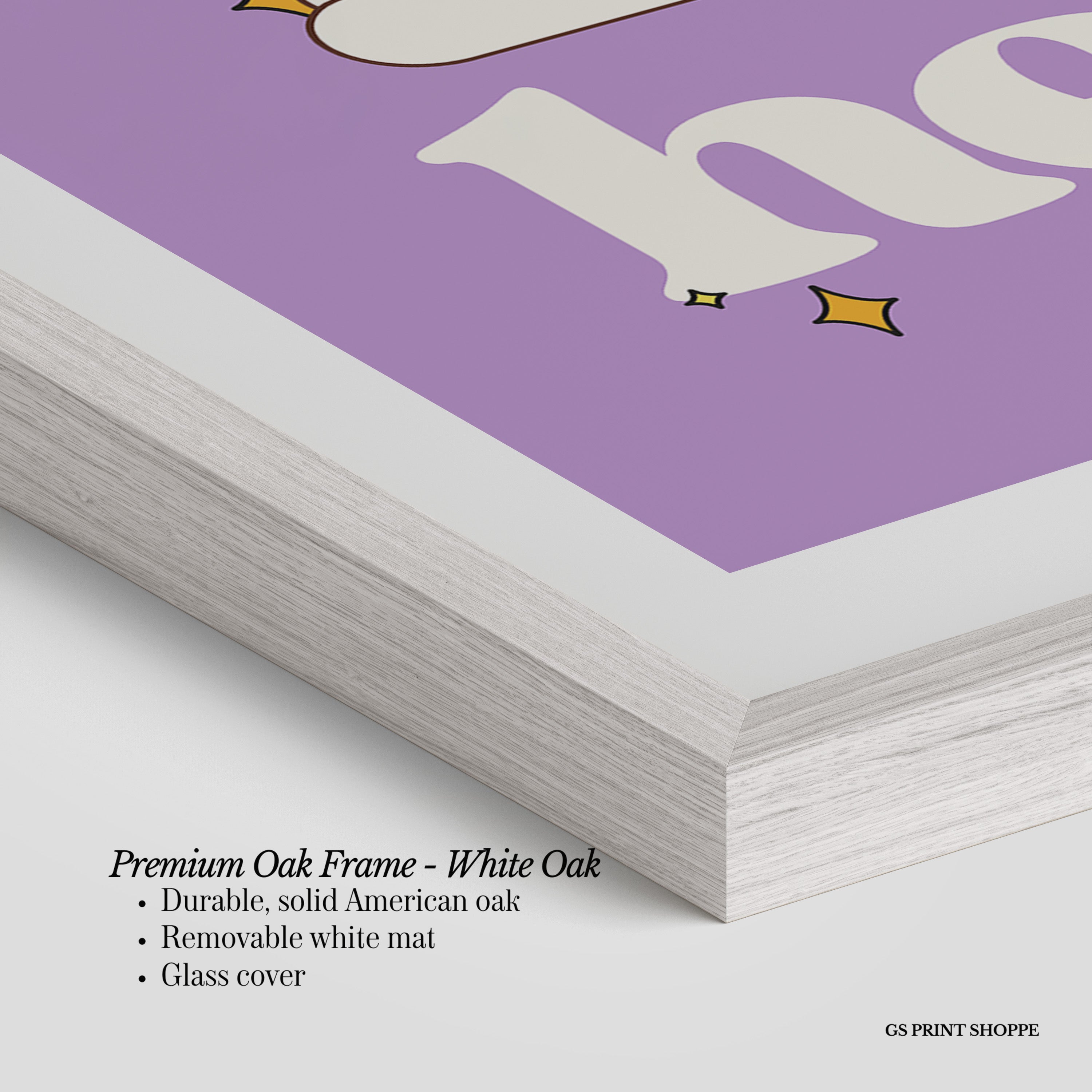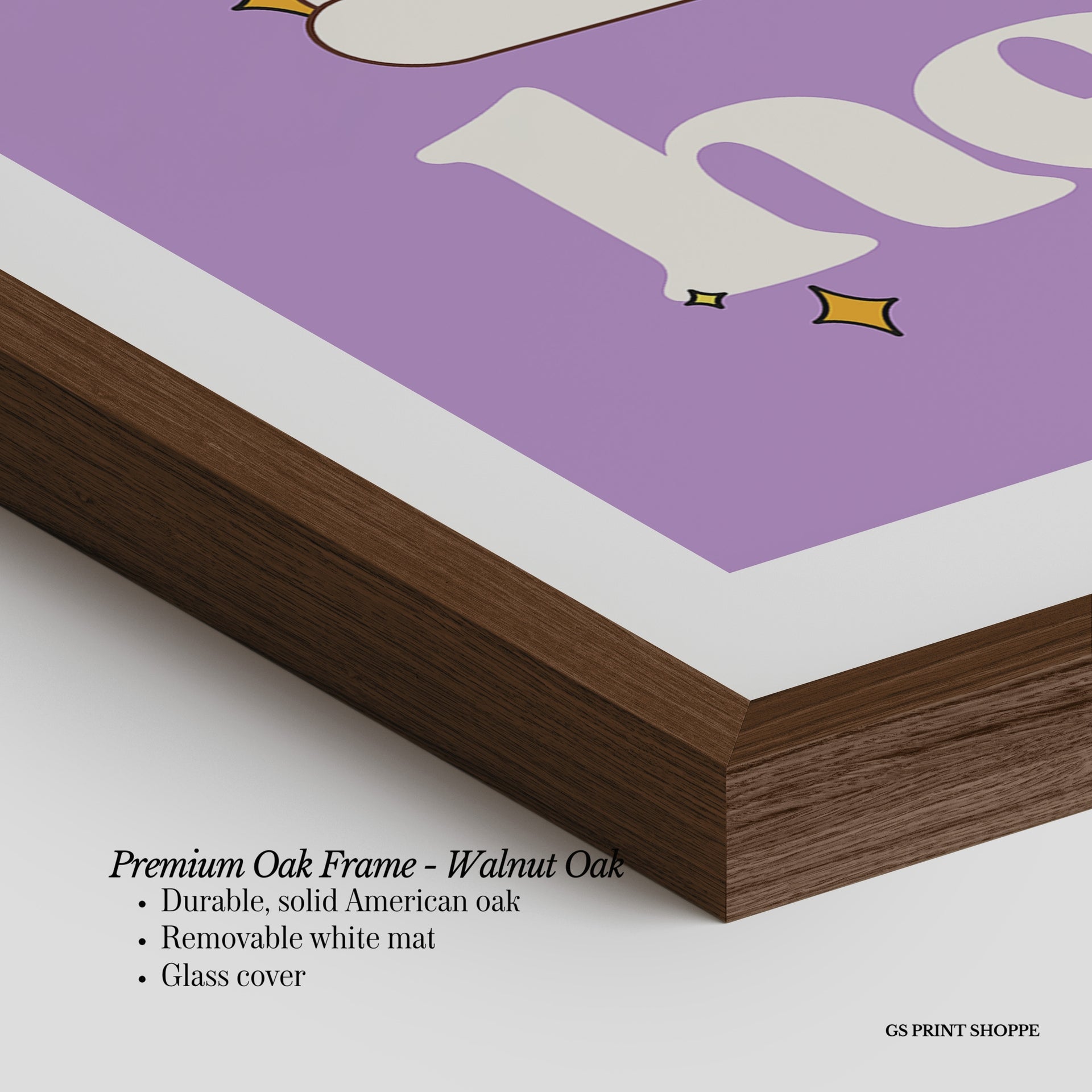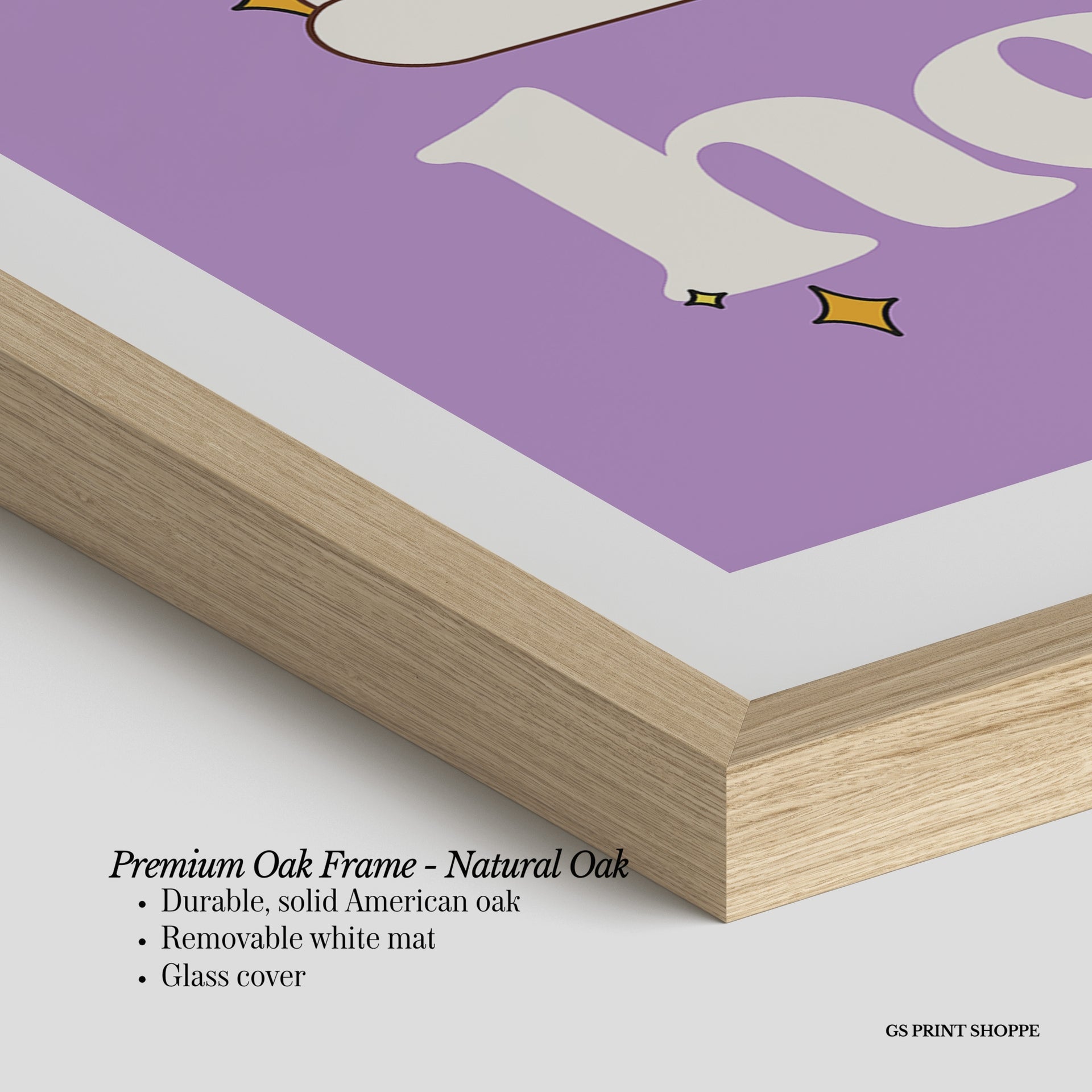 Premium Oak Frame: Our premium oak frame is crafted from solid American oak, offering a warm, natural feel with a high-end finish. We complete this elevated offering with a bright white removable mat and real glass for a versatile and polished look.