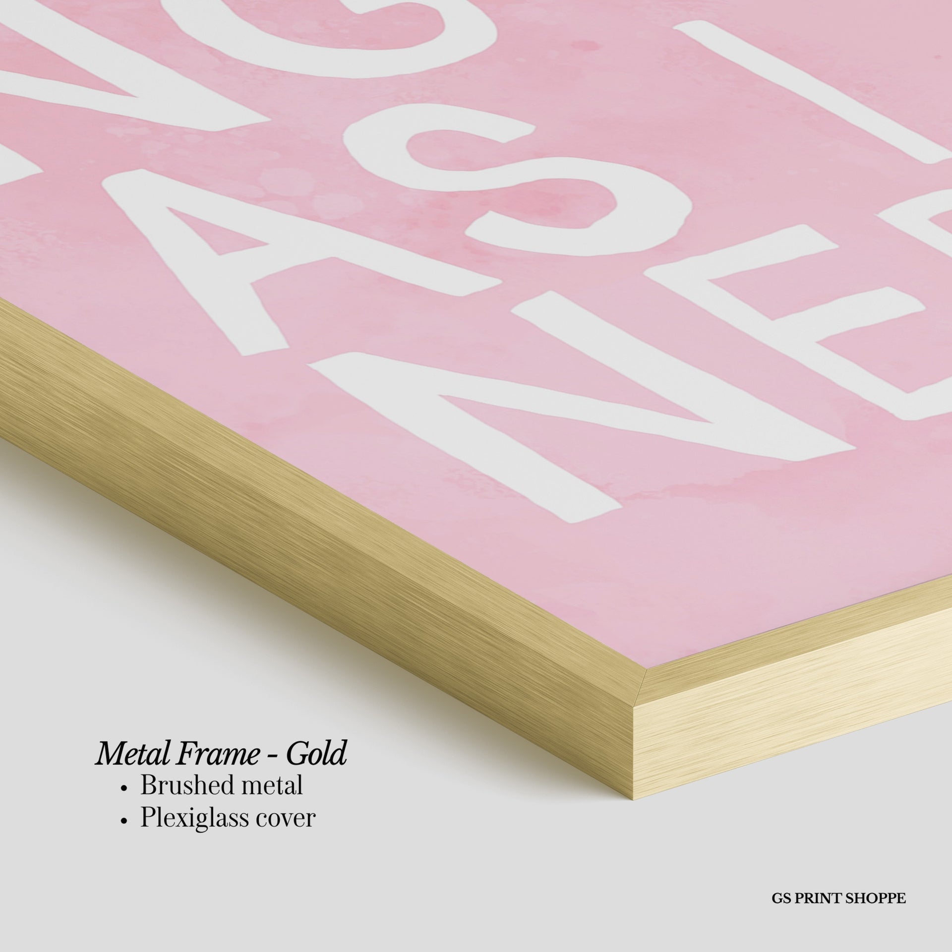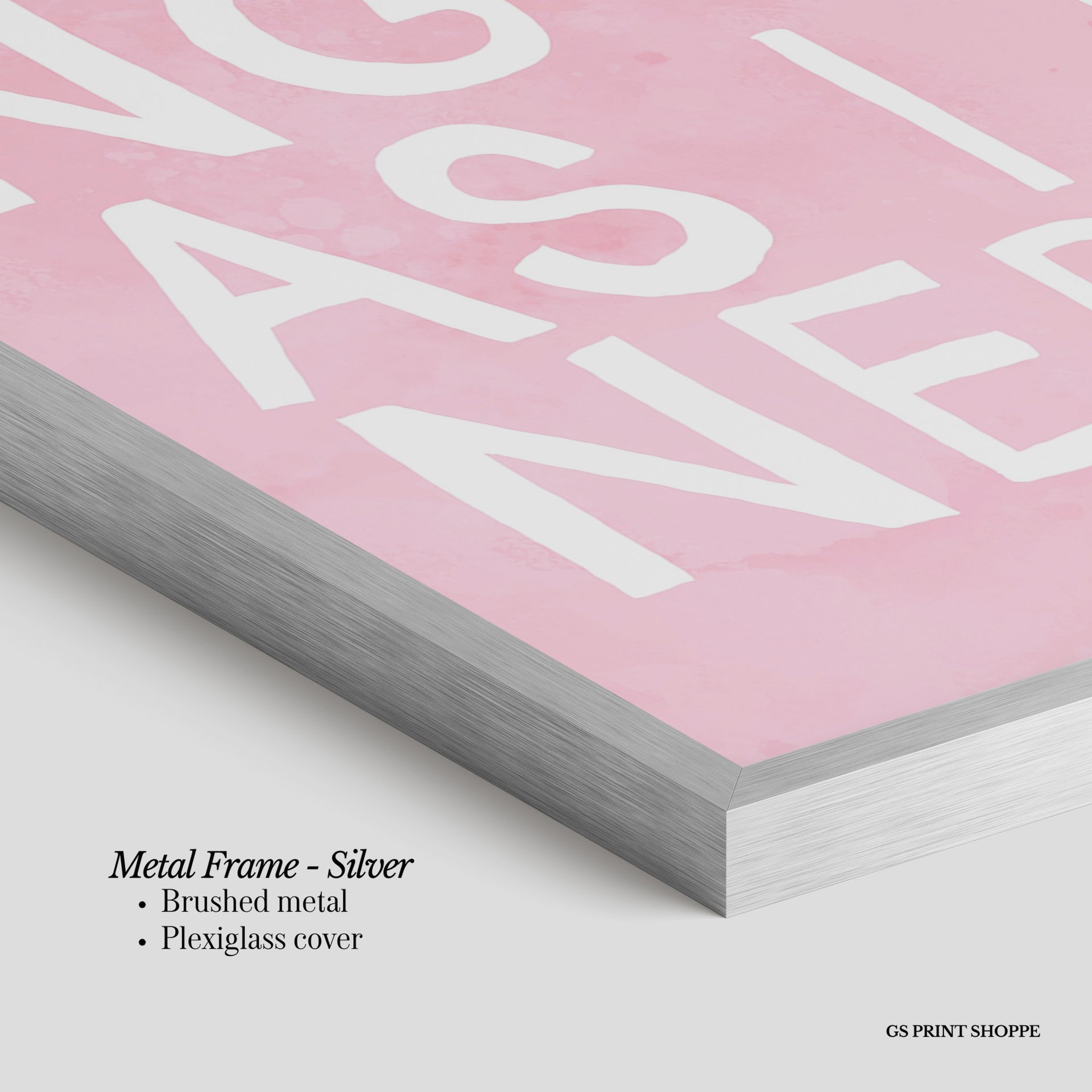 Metal Frame: Sleek and modern, our metal frame is crafted with brushed metal for a polished finish. It comes with durable plexiglass and sturdy metal hangers for horizontal or vertical display.
