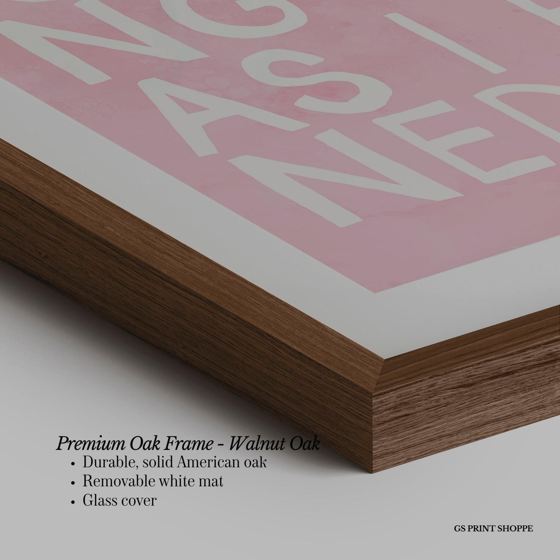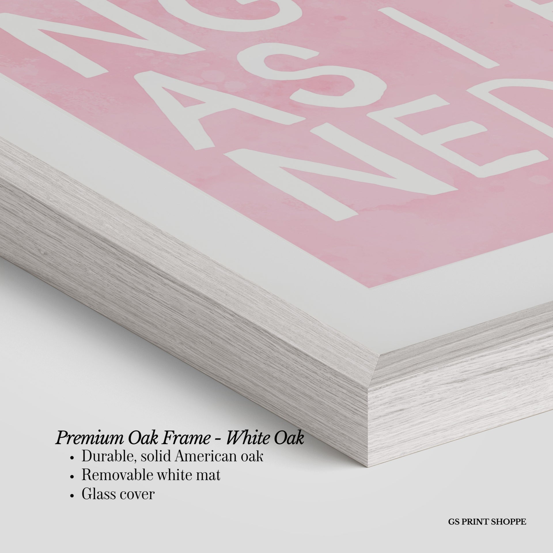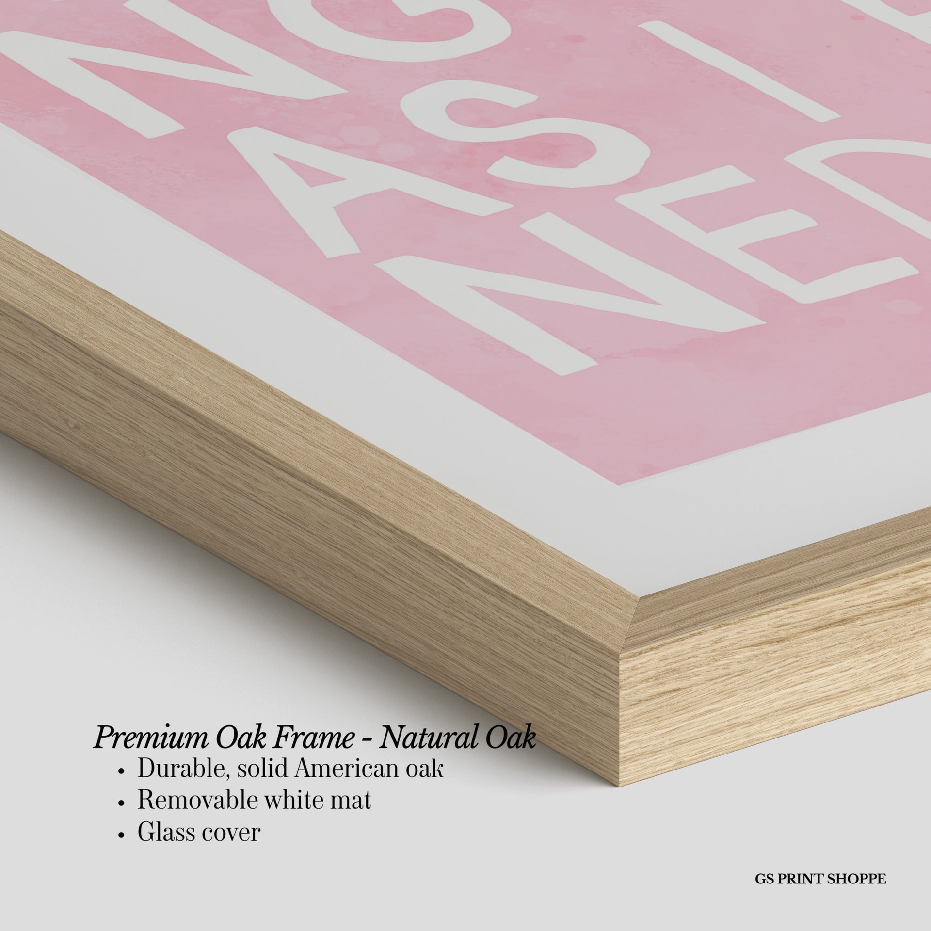 Premium Oak Frame: Our premium oak frame is crafted from solid American oak, offering a warm, natural feel with a high-end finish. We complete this elevated offering with a bright white removable mat and real glass for a versatile and polished look.