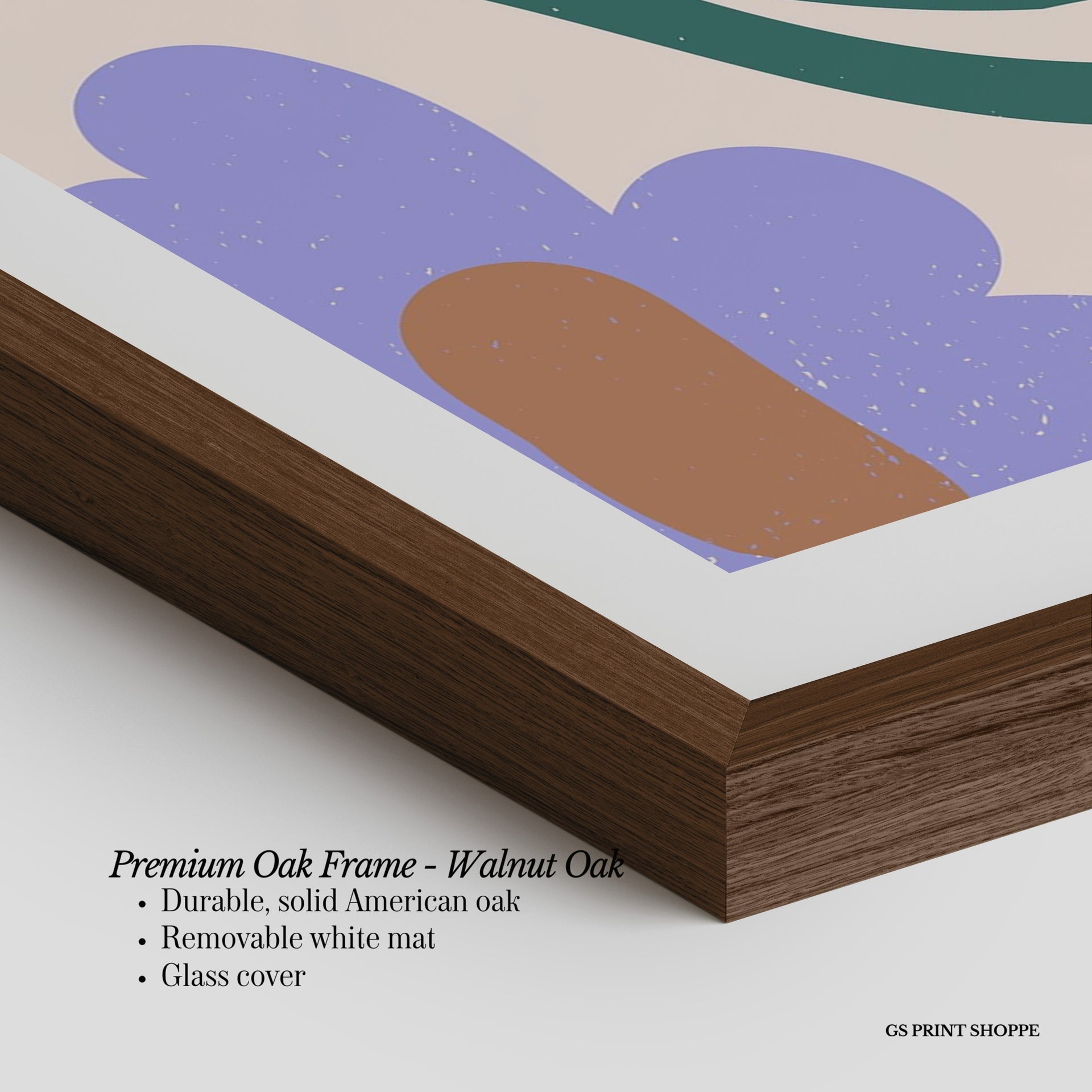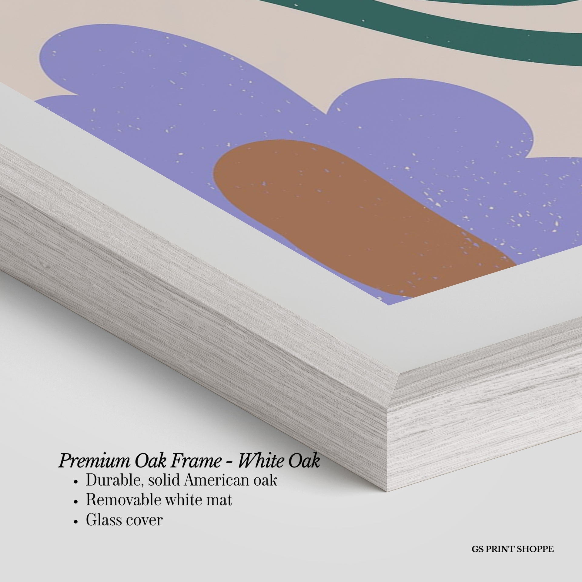 Premium Oak Frame: Our premium oak frame is crafted from solid American oak, offering a warm, natural feel with a high-end finish. We complete this elevated offering with a bright white removable mat and real glass for a versatile and polished look.