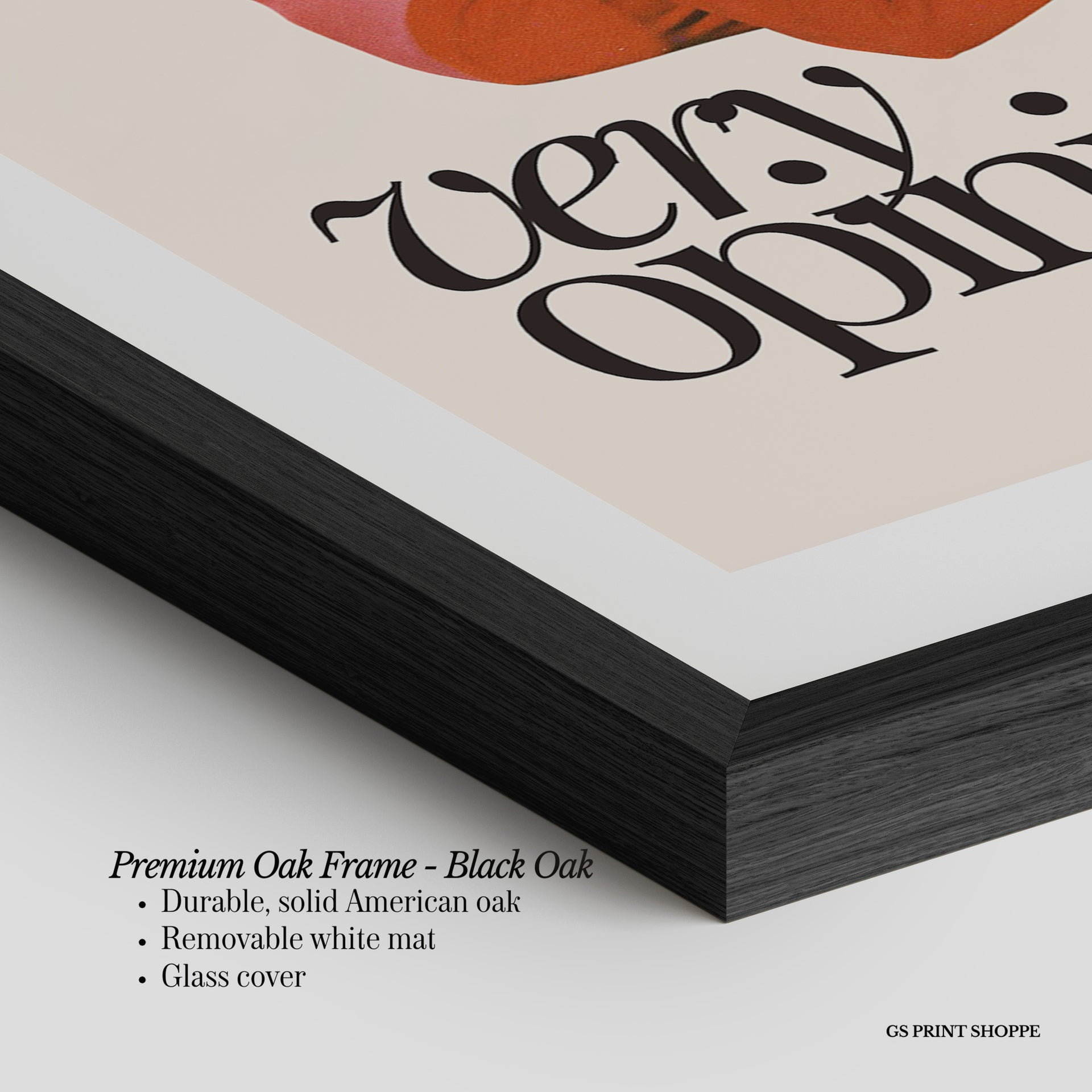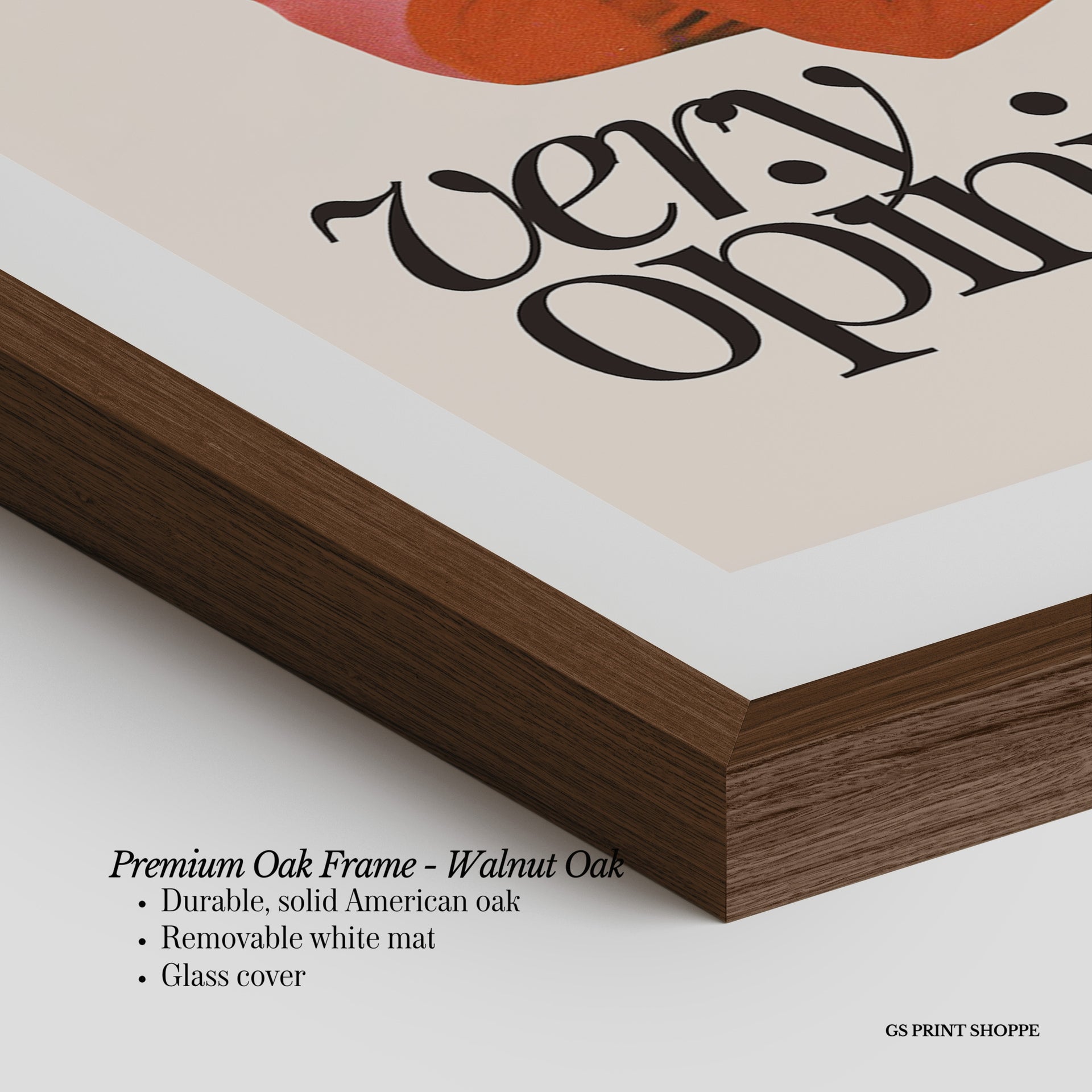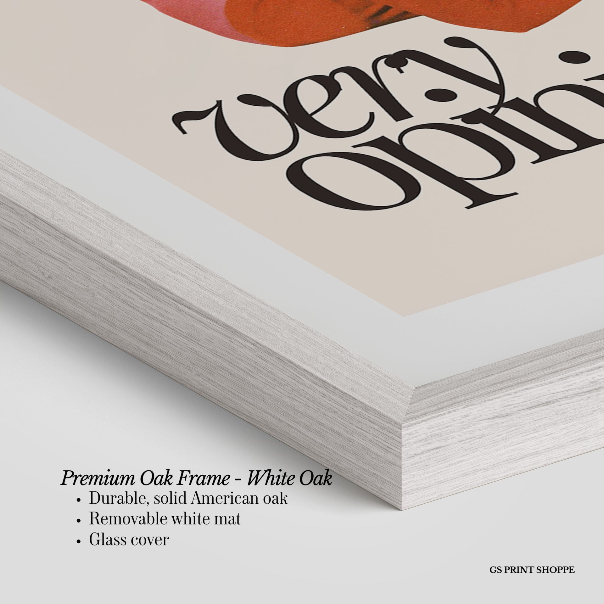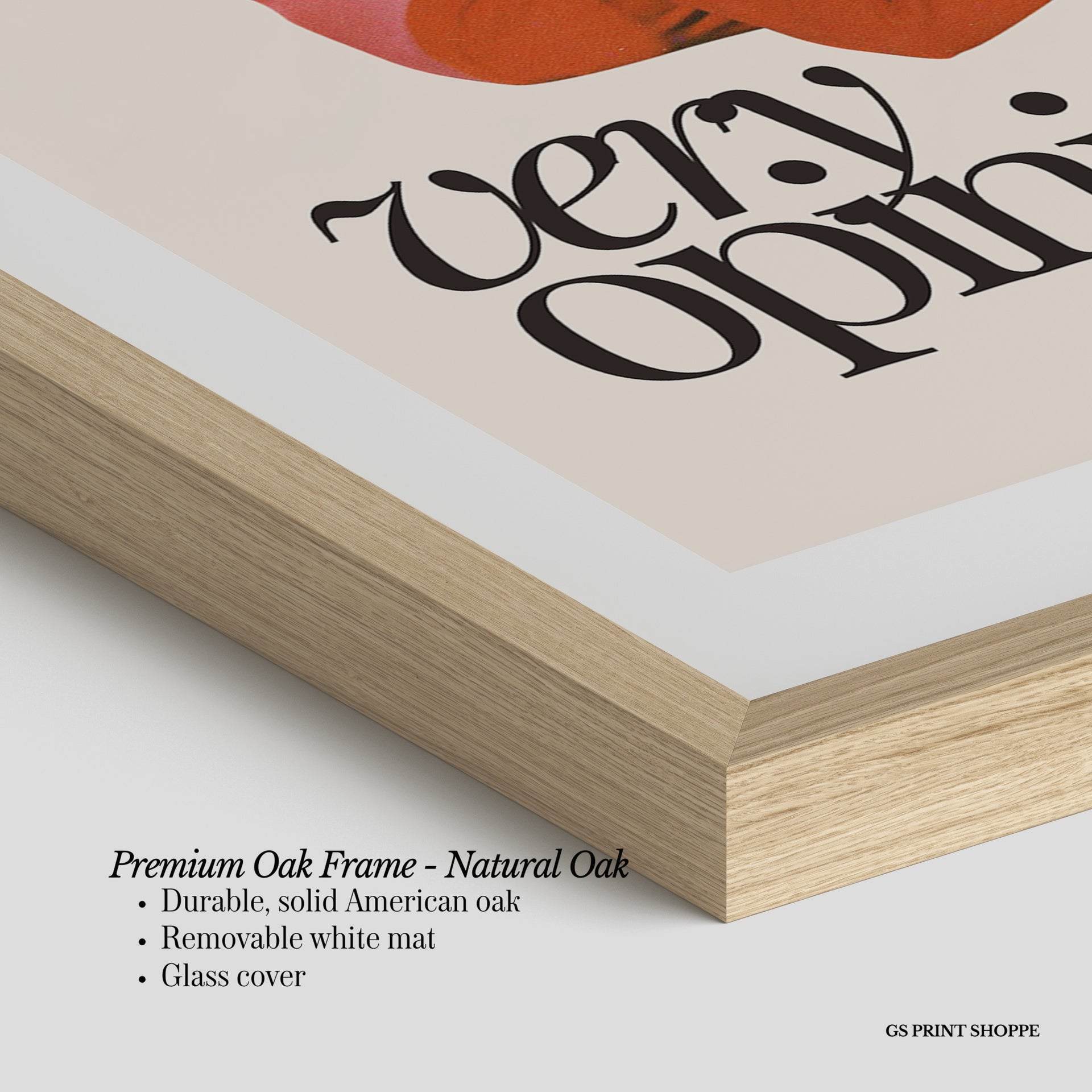 Premium Oak Frame: Our premium oak frame is crafted from solid American oak, offering a warm, natural feel with a high-end finish. We complete this elevated offering with a bright white removable mat and real glass for a versatile and polished look.