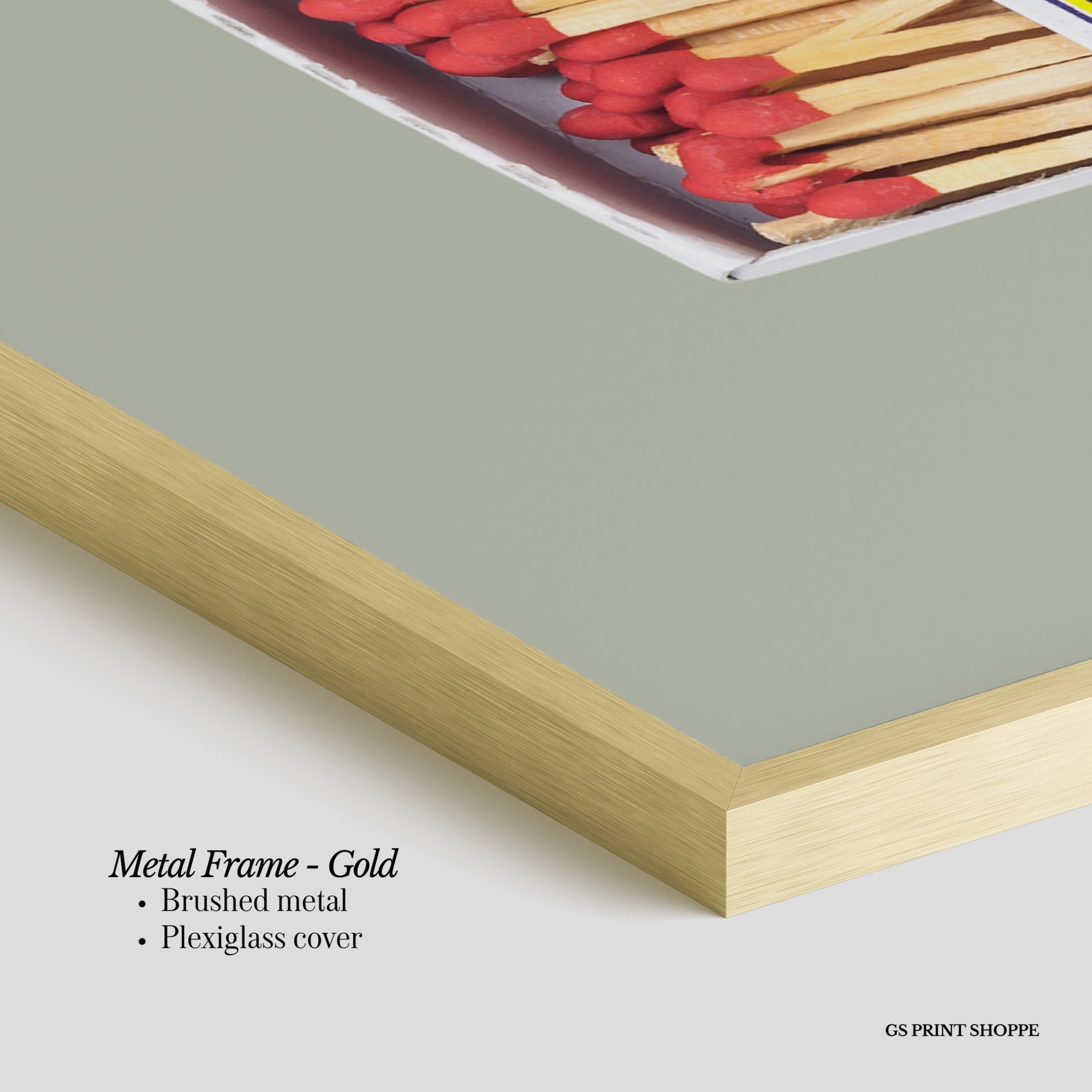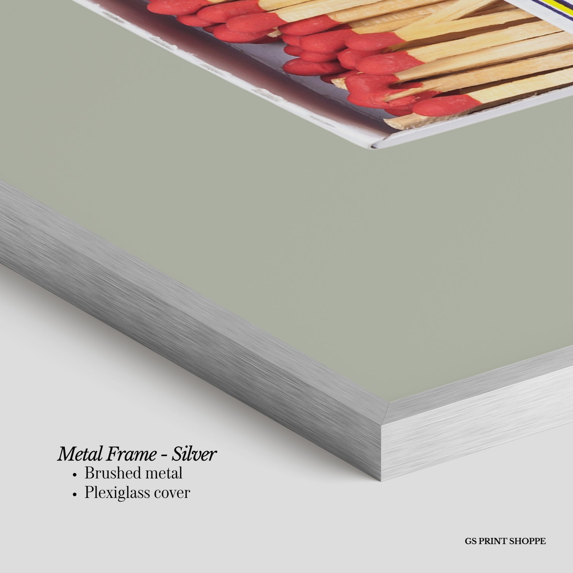 Metal Frame: Sleek and modern, our metal frame is crafted with brushed metal for a polished finish. It comes with durable plexiglass and sturdy metal hangers for horizontal or vertical display.