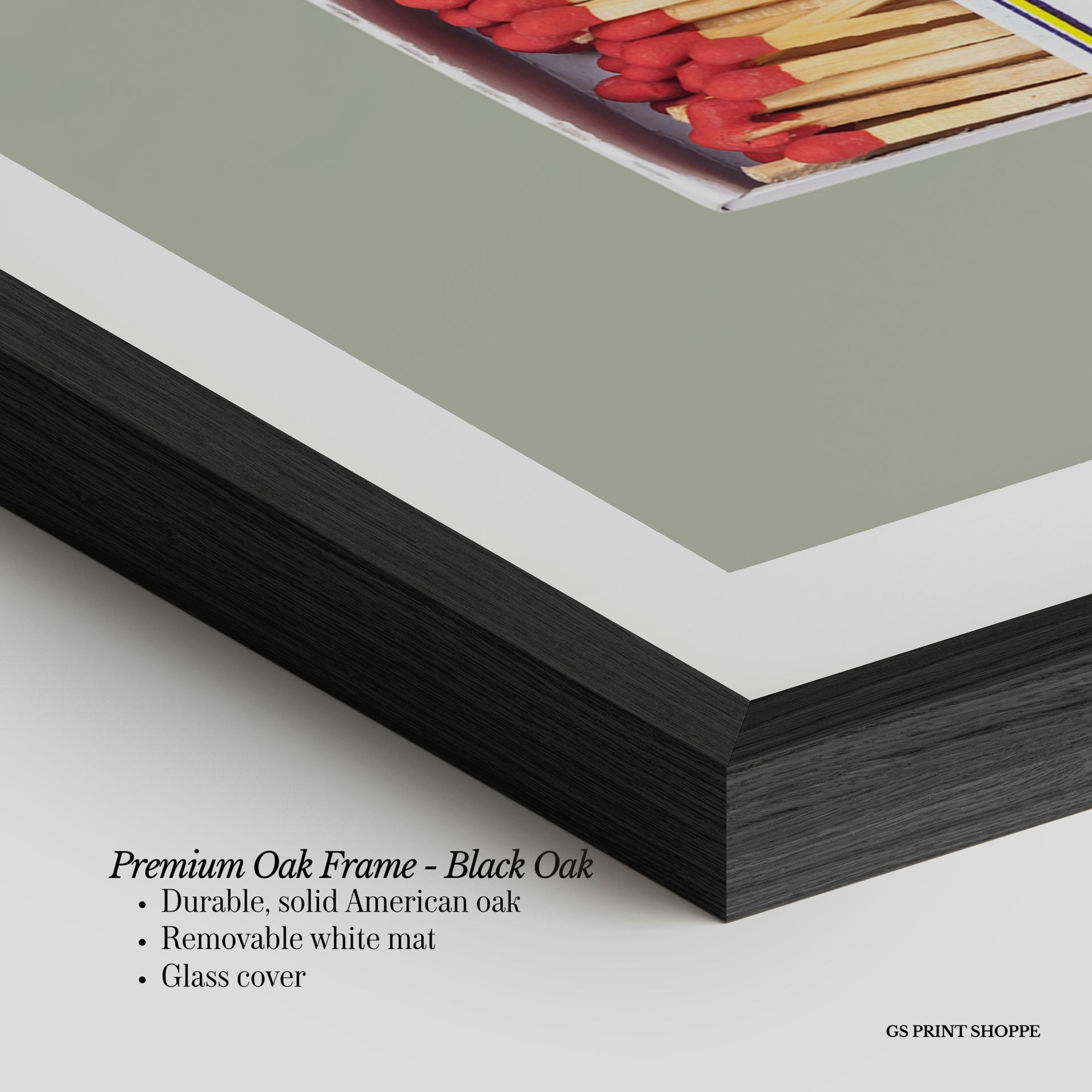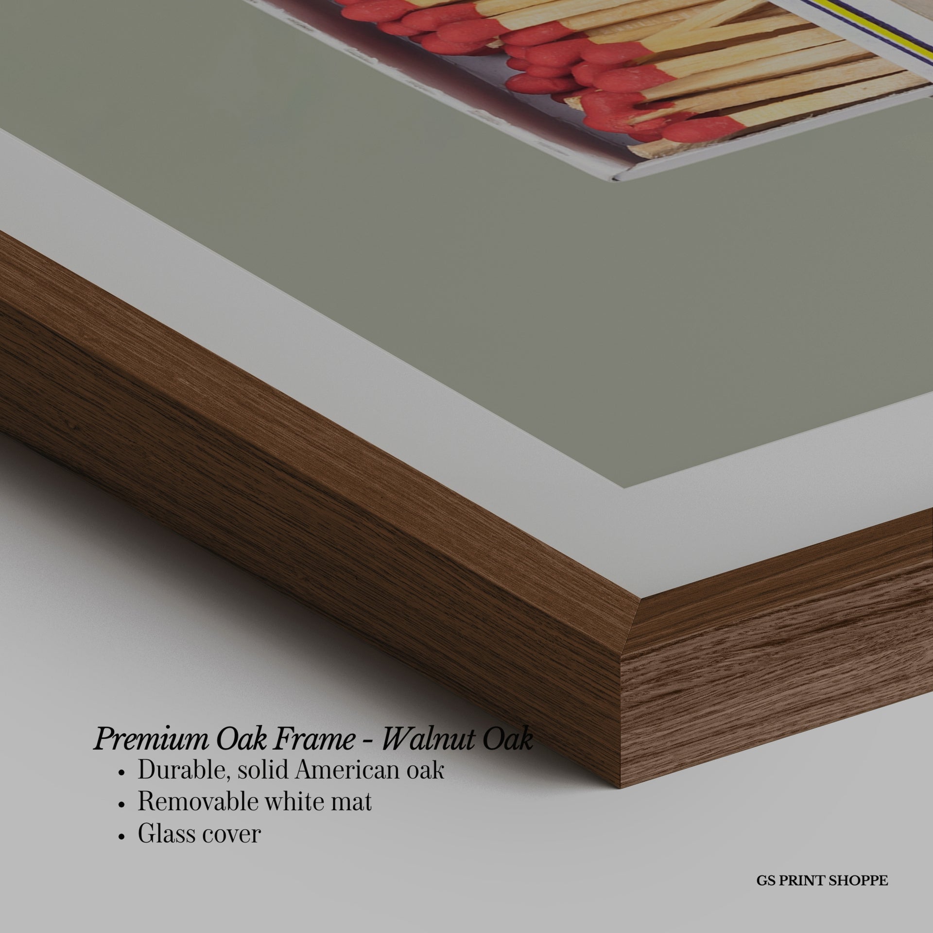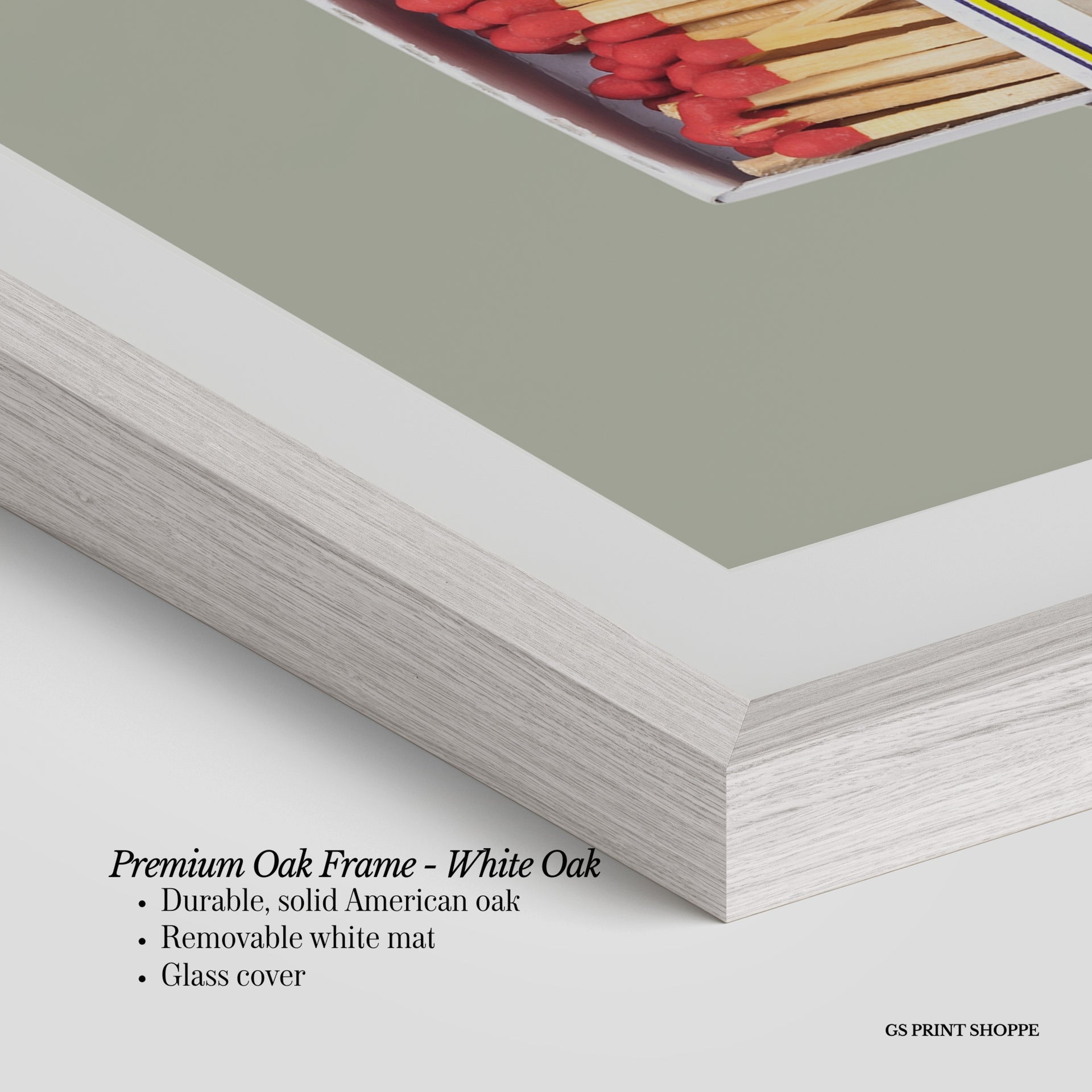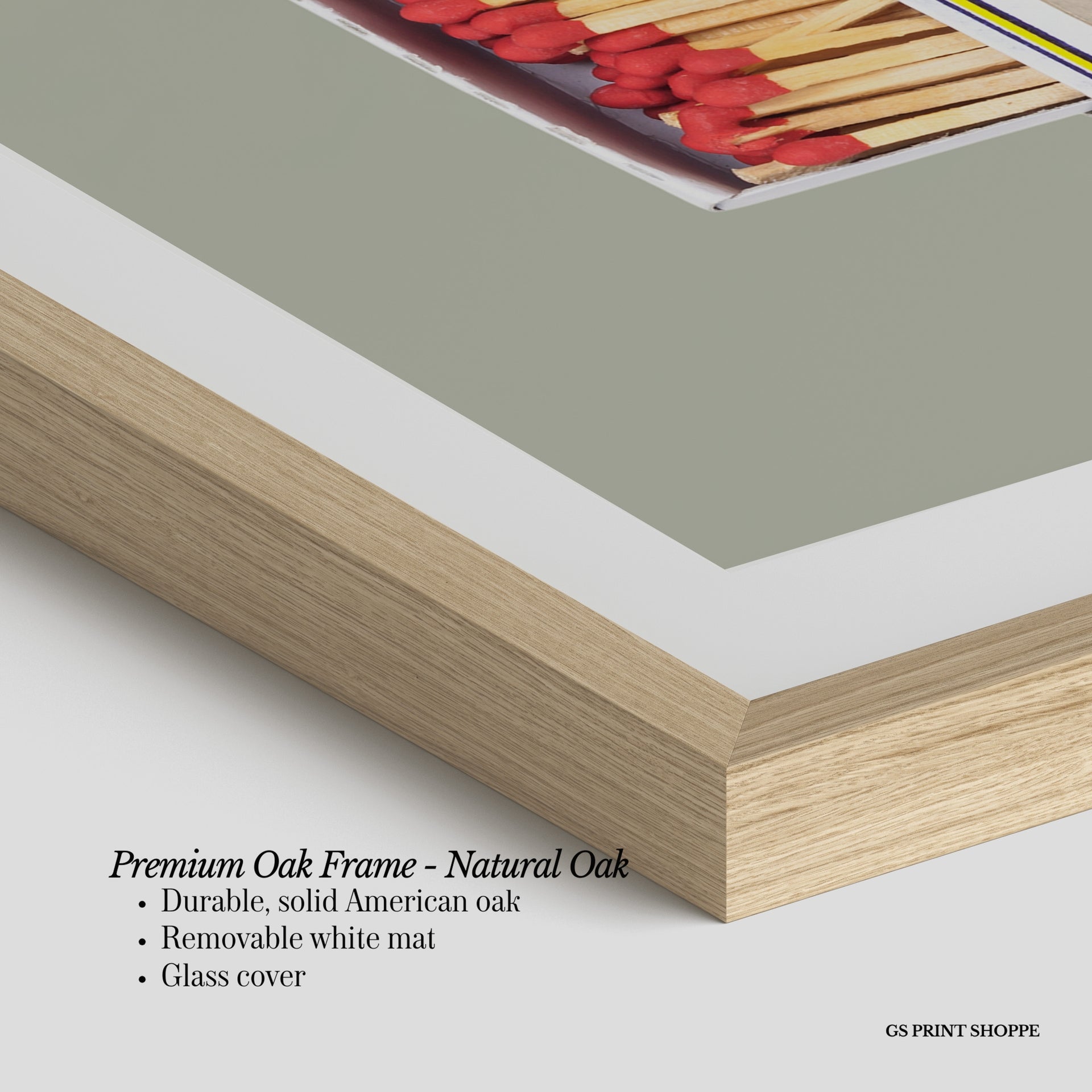 Premium Oak Frame: Our premium oak frame is crafted from solid American oak, offering a warm, natural feel with a high-end finish. We complete this elevated offering with a bright white removable mat and real glass for a versatile and polished look.