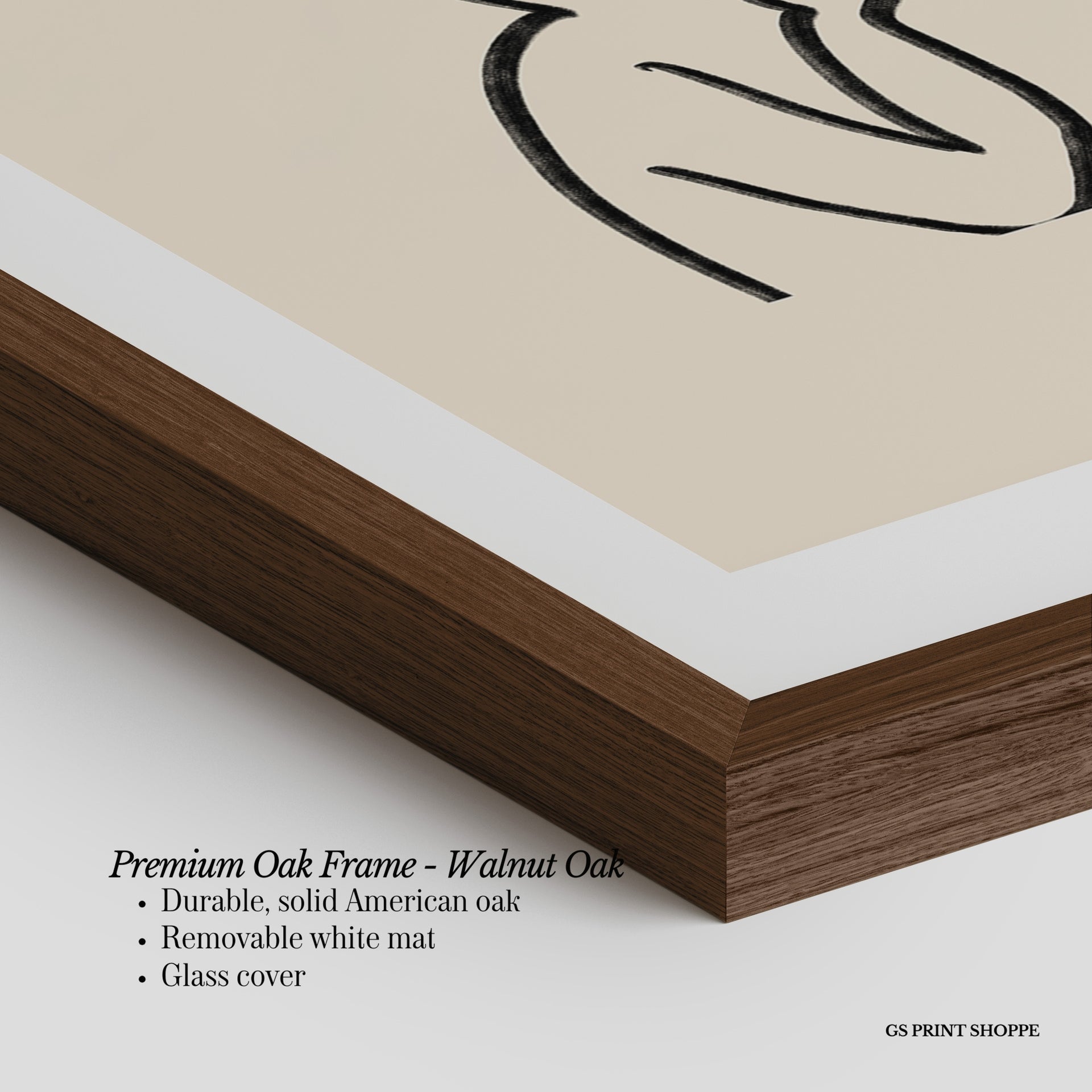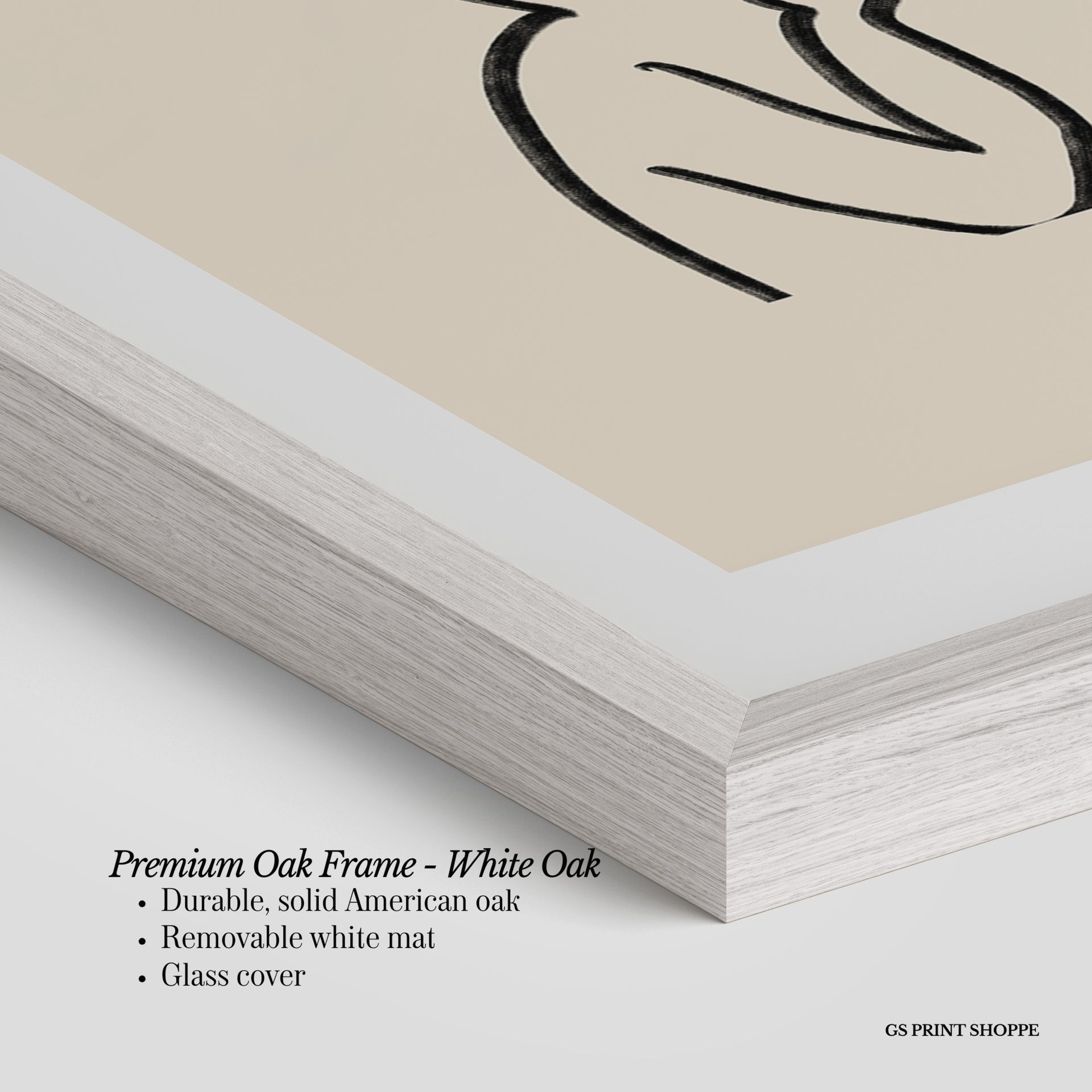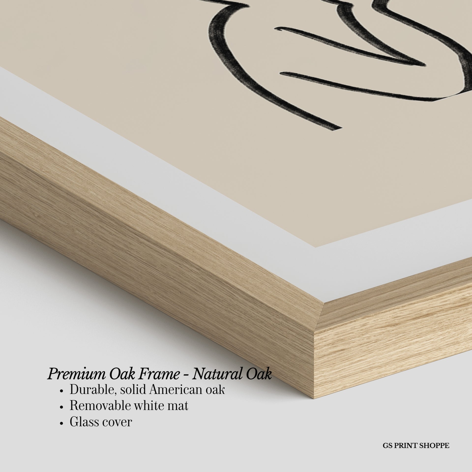 Premium Oak Frame: Our premium oak frame is crafted from solid American oak, offering a warm, natural feel with a high-end finish. We complete this elevated offering with a bright white removable mat and real glass for a versatile and polished look.