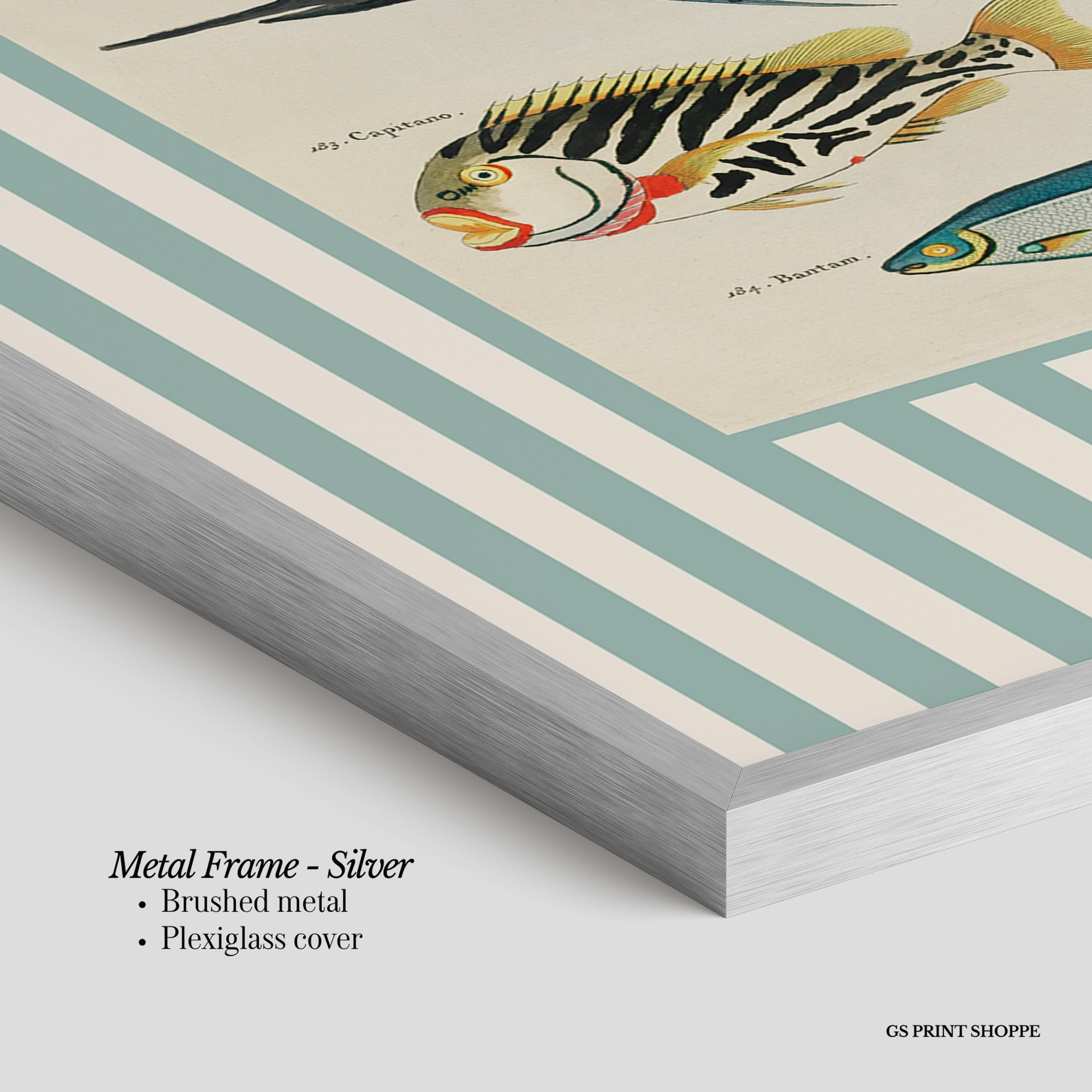 Metal Frame: Sleek and modern, our metal frame is crafted with brushed metal for a polished finish. It comes with durable plexiglass and sturdy metal hangers for horizontal or vertical display.