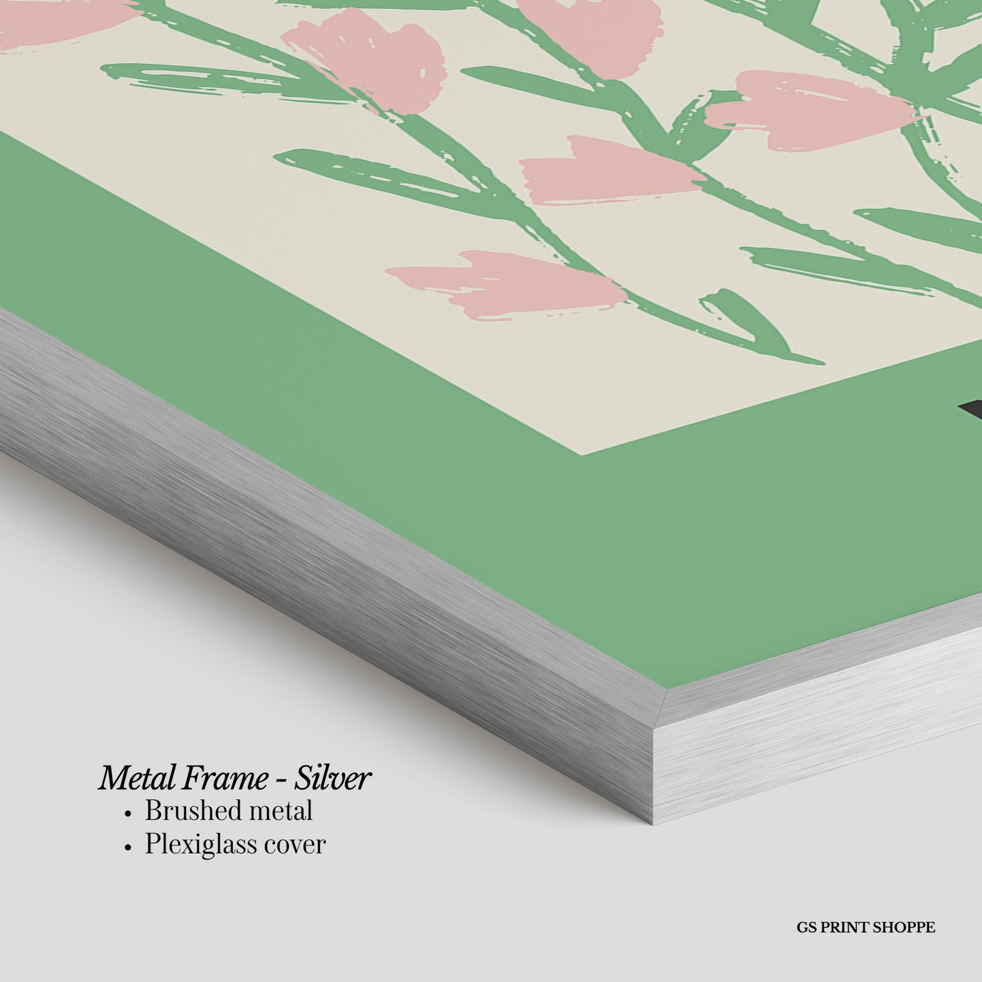 Metal Frame: Sleek and modern, our metal frame is crafted with brushed metal for a polished finish. It comes with durable plexiglass and sturdy metal hangers for horizontal or vertical display.
