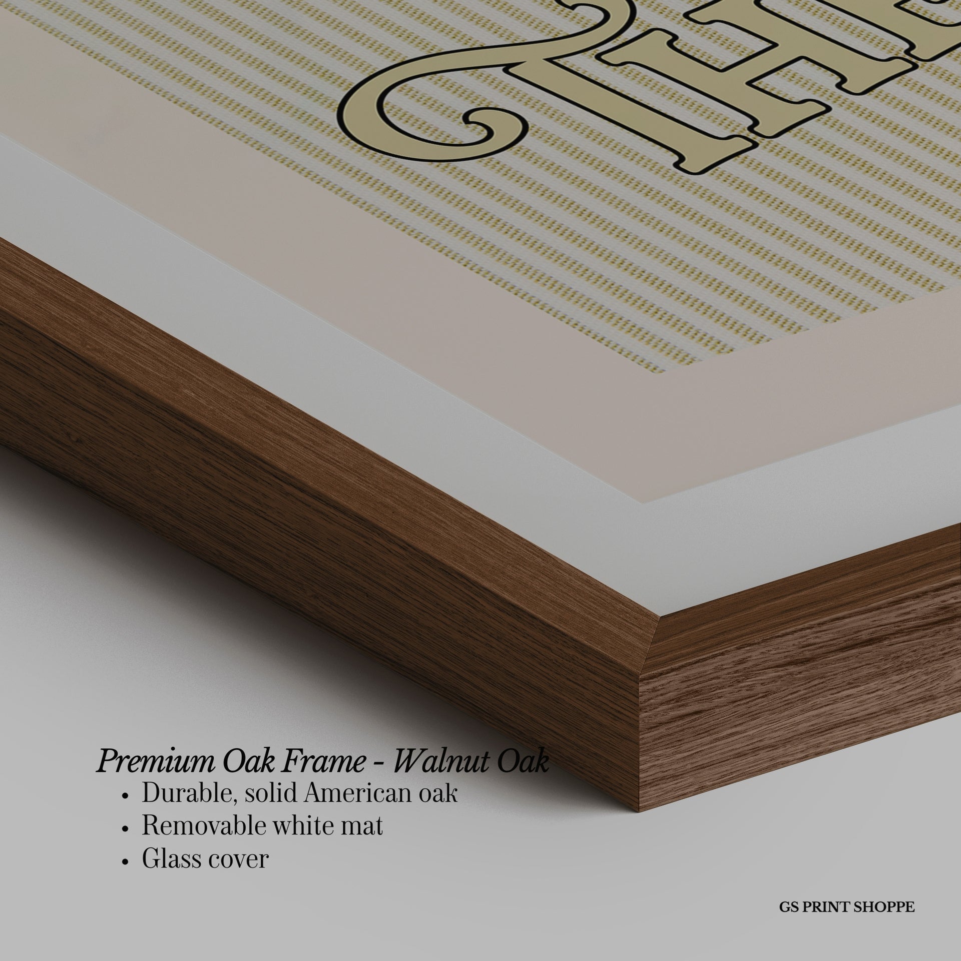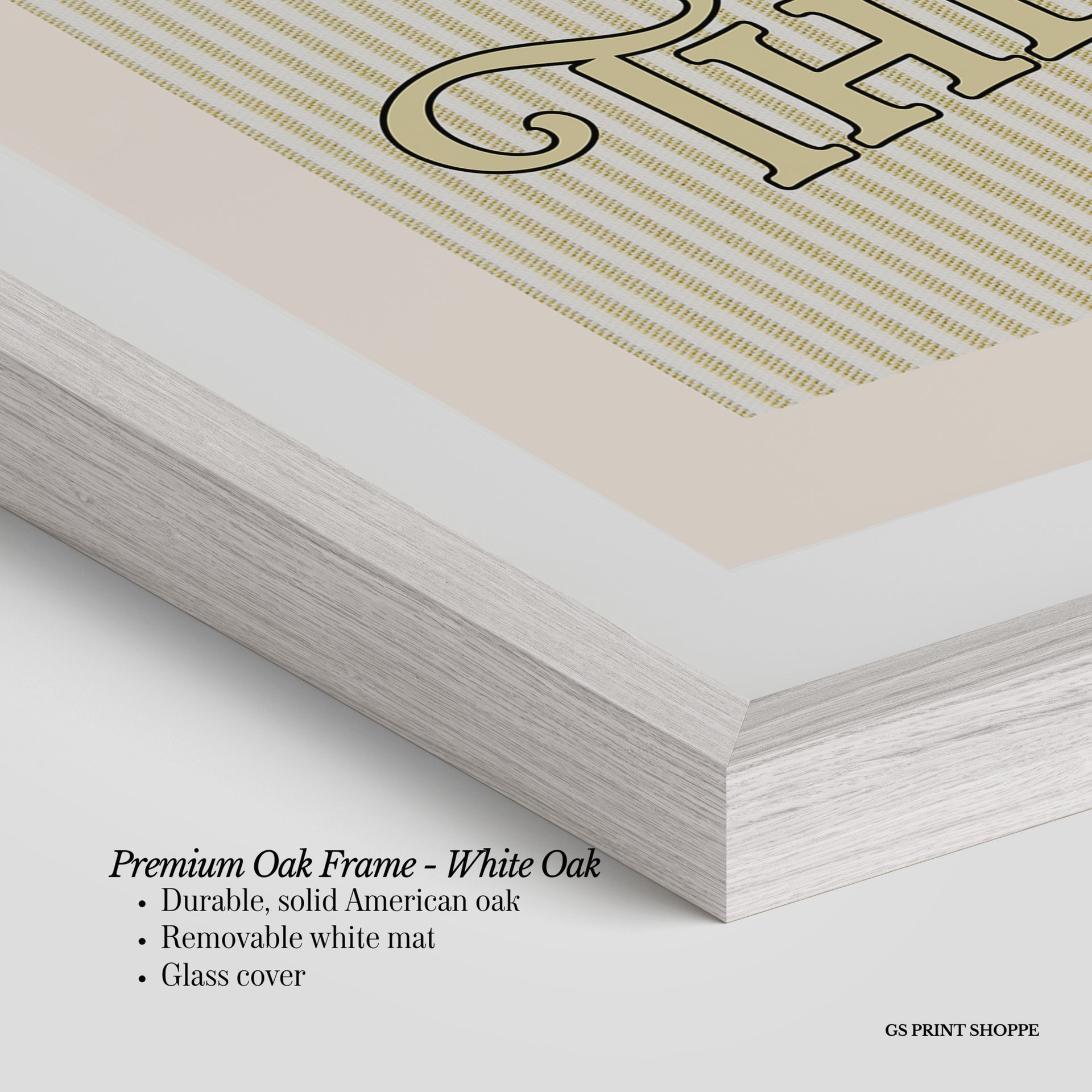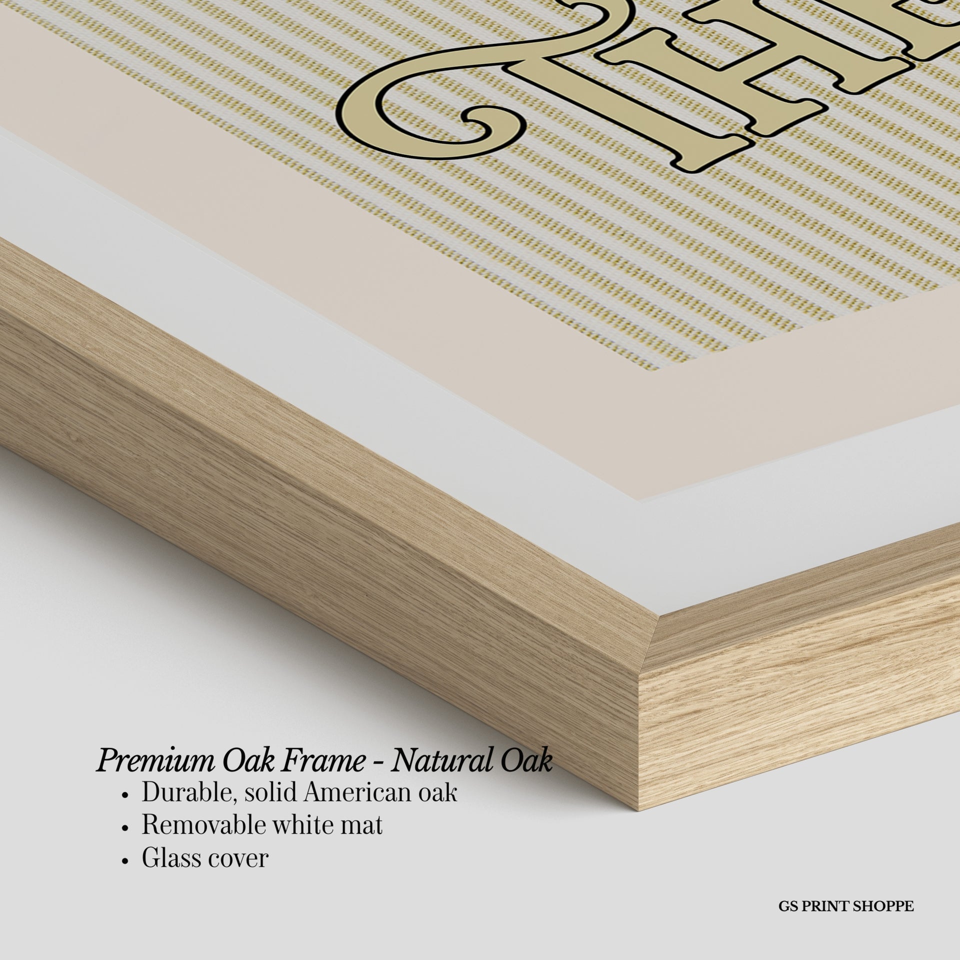 Premium Oak Frame: Our premium oak frame is crafted from solid American oak, offering a warm, natural feel with a high-end finish. We complete this elevated offering with a bright white removable mat and real glass for a versatile and polished look.
