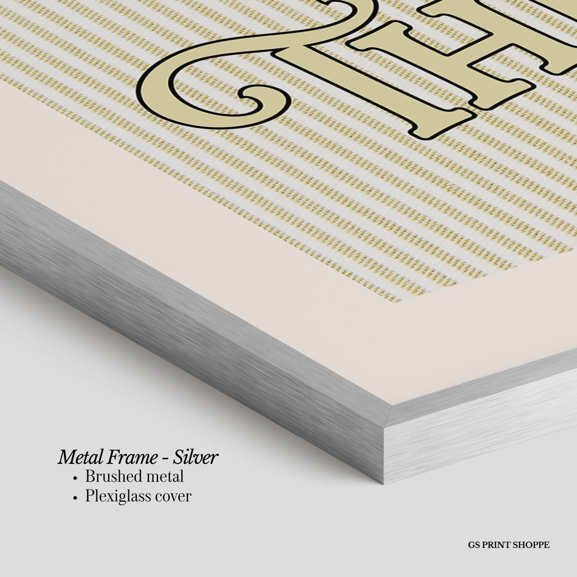 Metal Frame: Sleek and modern, our metal frame is crafted with brushed metal for a polished finish. It comes with durable plexiglass and sturdy metal hangers for horizontal or vertical display.