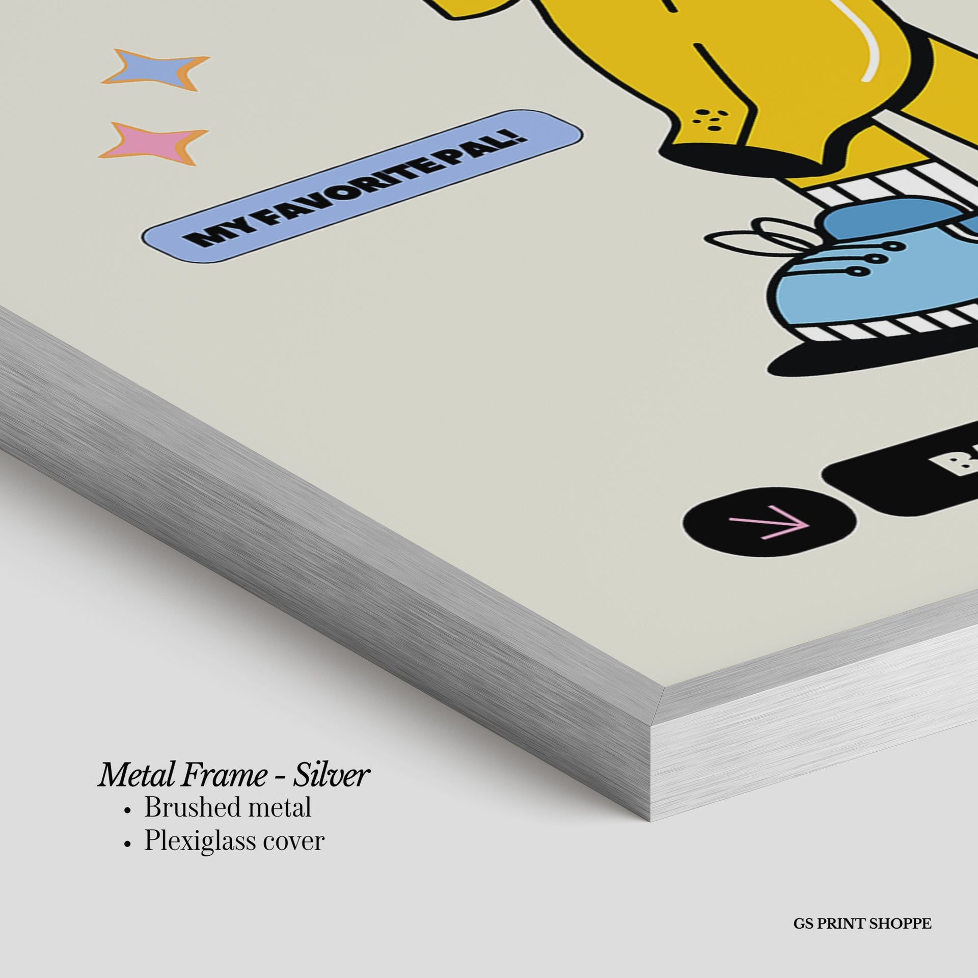 Metal Frame: Sleek and modern, our metal frame is crafted with brushed metal for a polished finish. It comes with durable plexiglass and sturdy metal hangers for horizontal or vertical display.