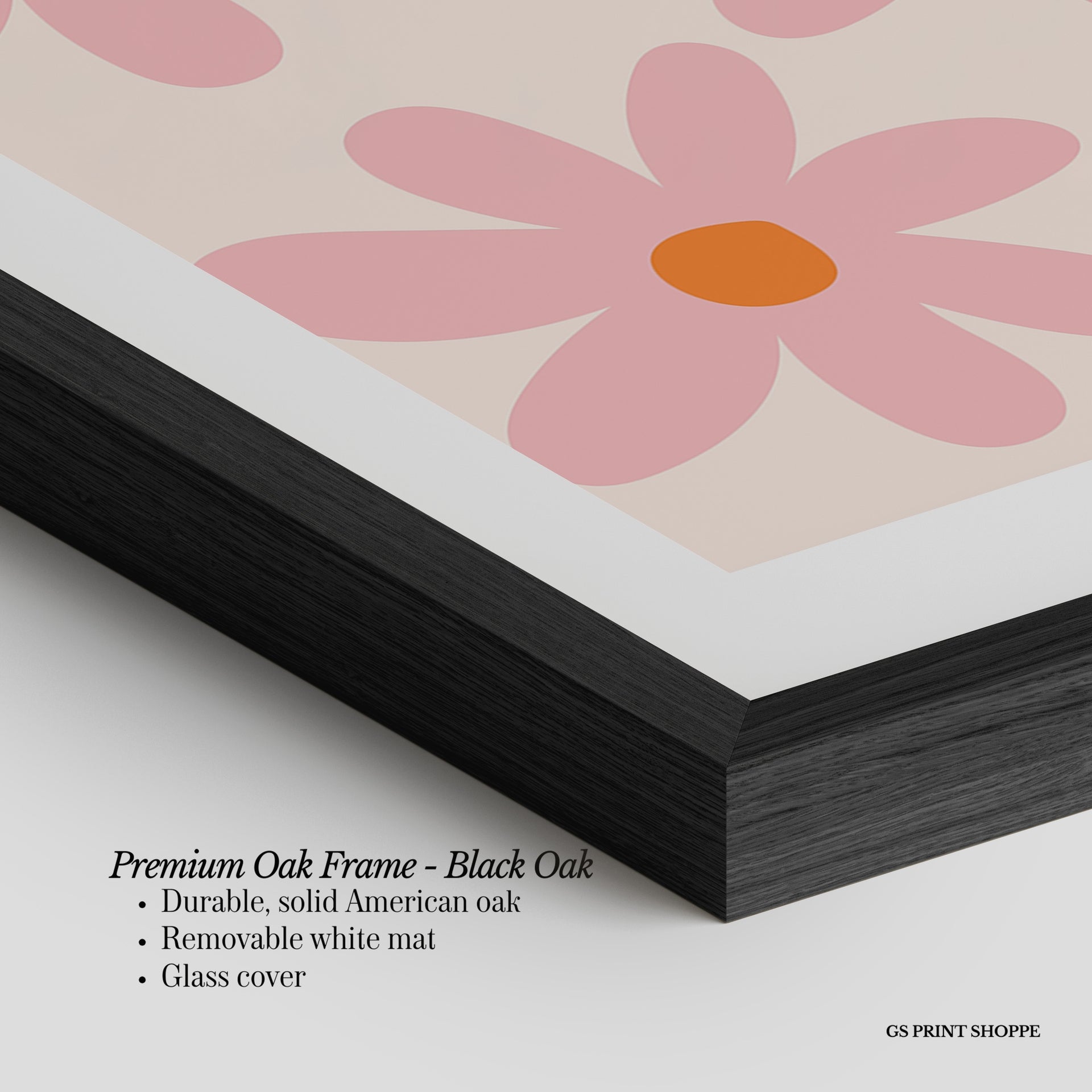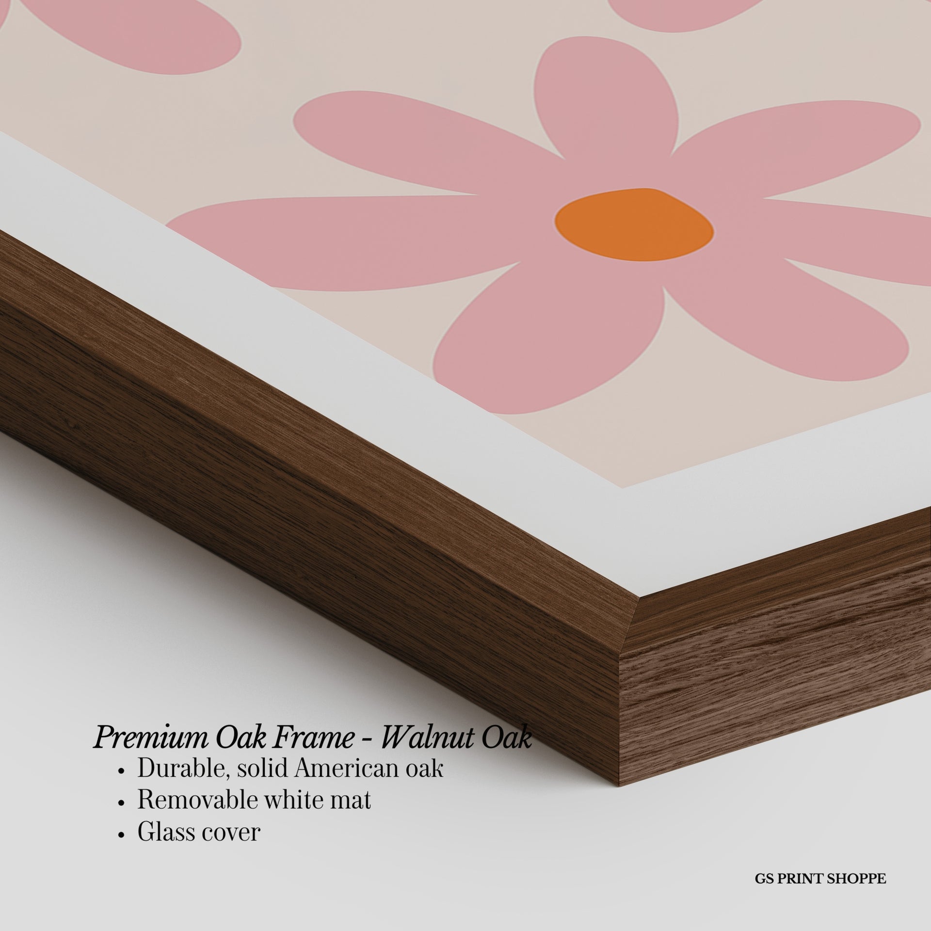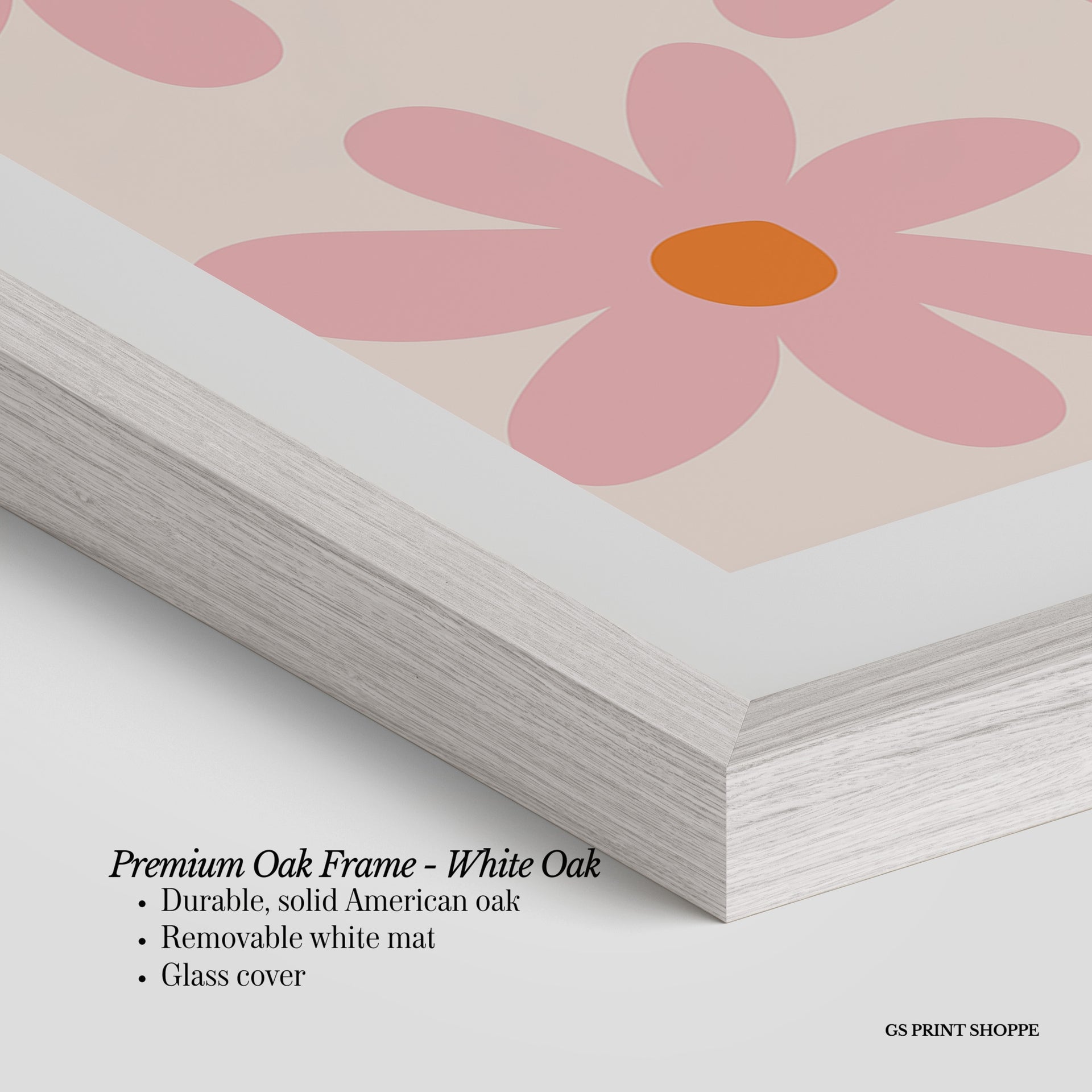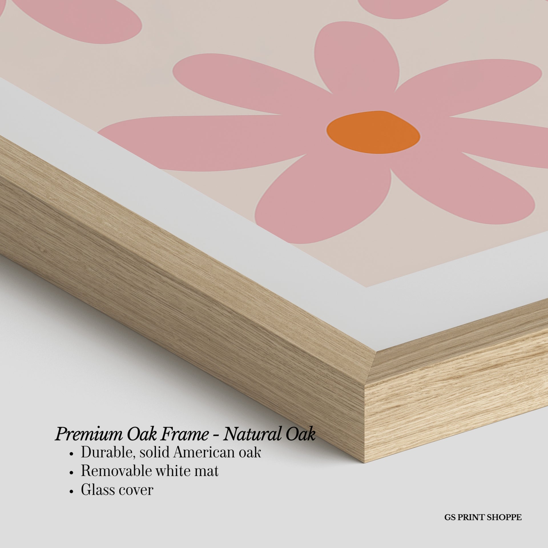 Premium Oak Frame: Our premium oak frame is crafted from solid American oak, offering a warm, natural feel with a high-end finish. We complete this elevated offering with a bright white removable mat and real glass for a versatile and polished look.