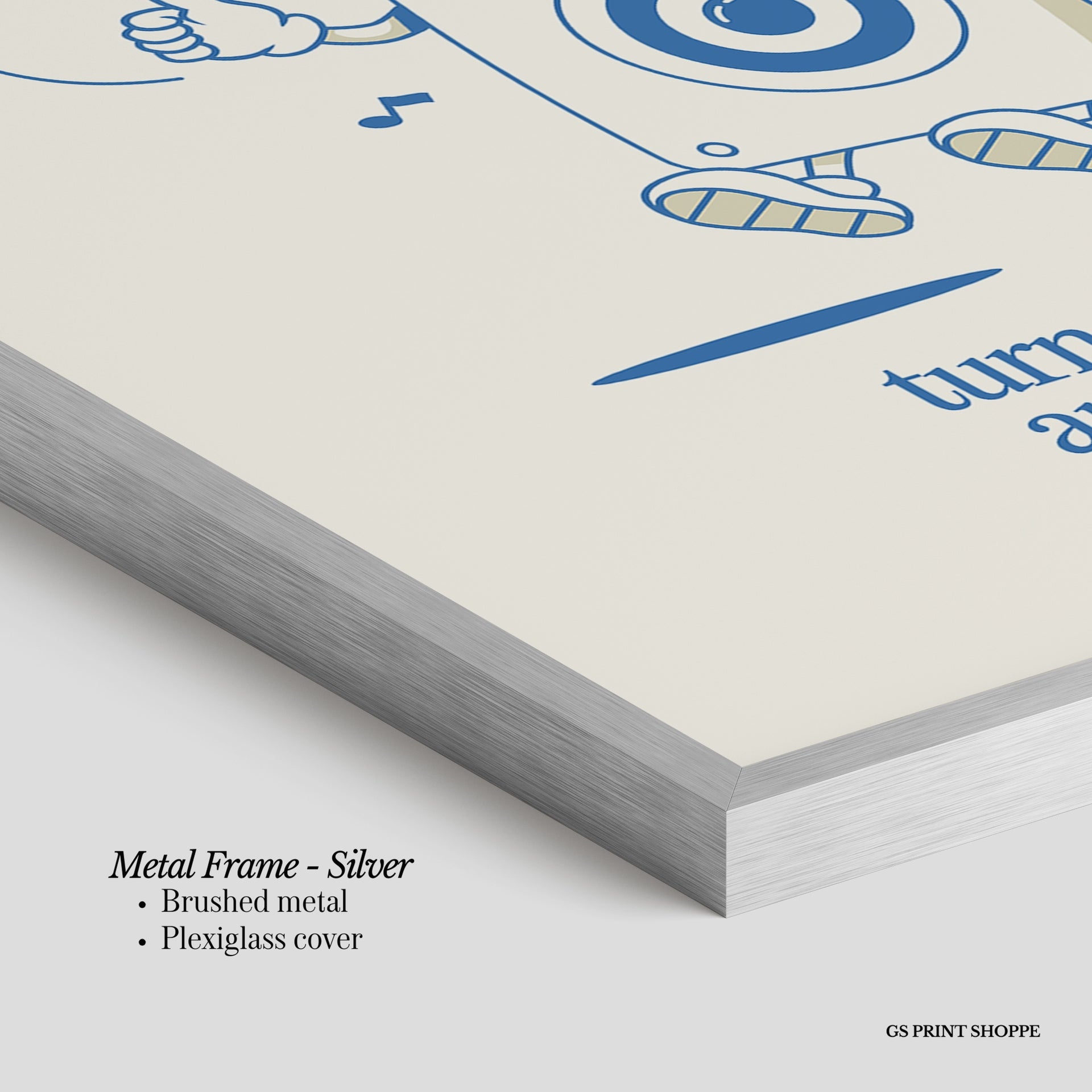 Metal Frame: Sleek and modern, our metal frame is crafted with brushed metal for a polished finish. It comes with durable plexiglass and sturdy metal hangers for horizontal or vertical display.